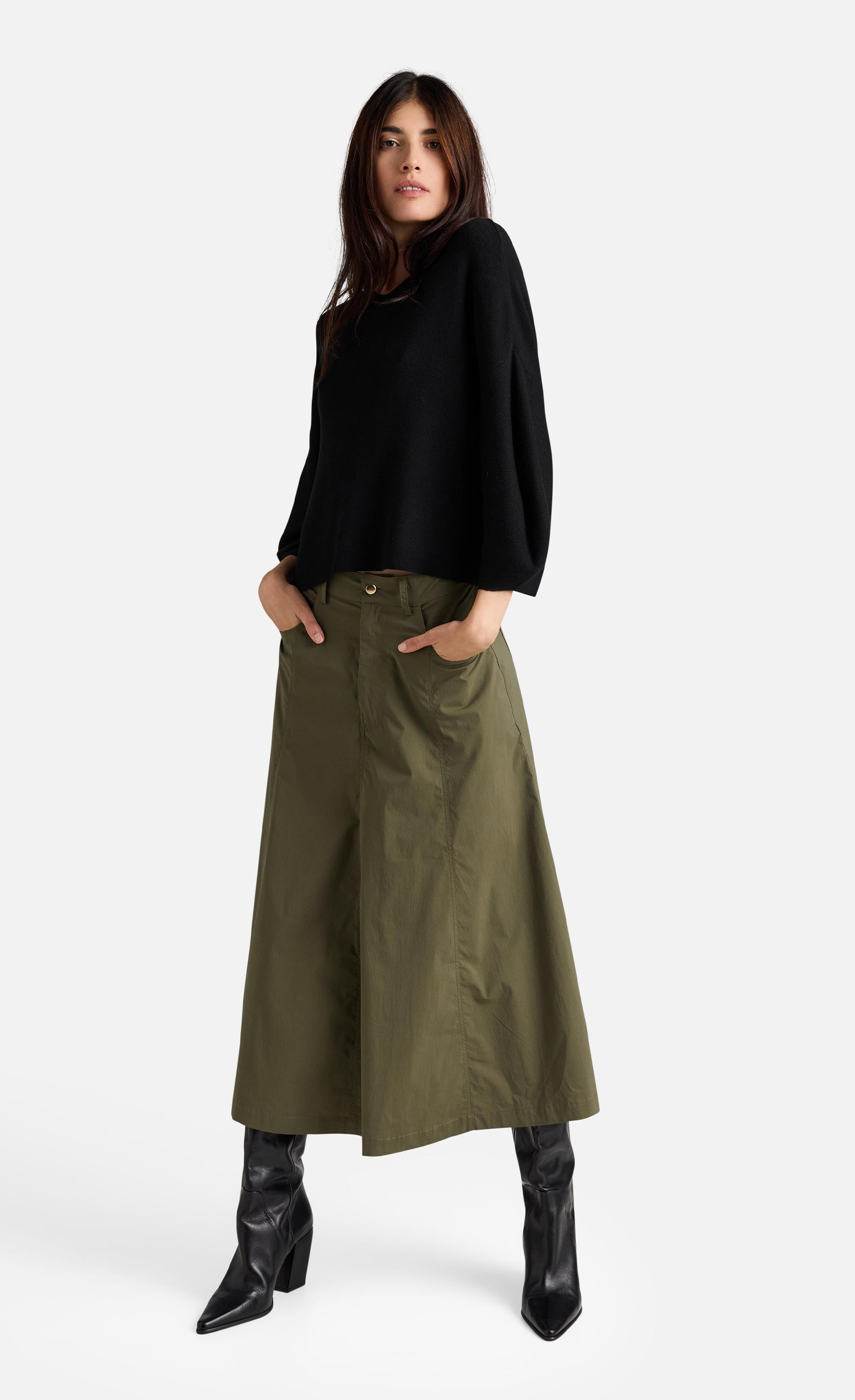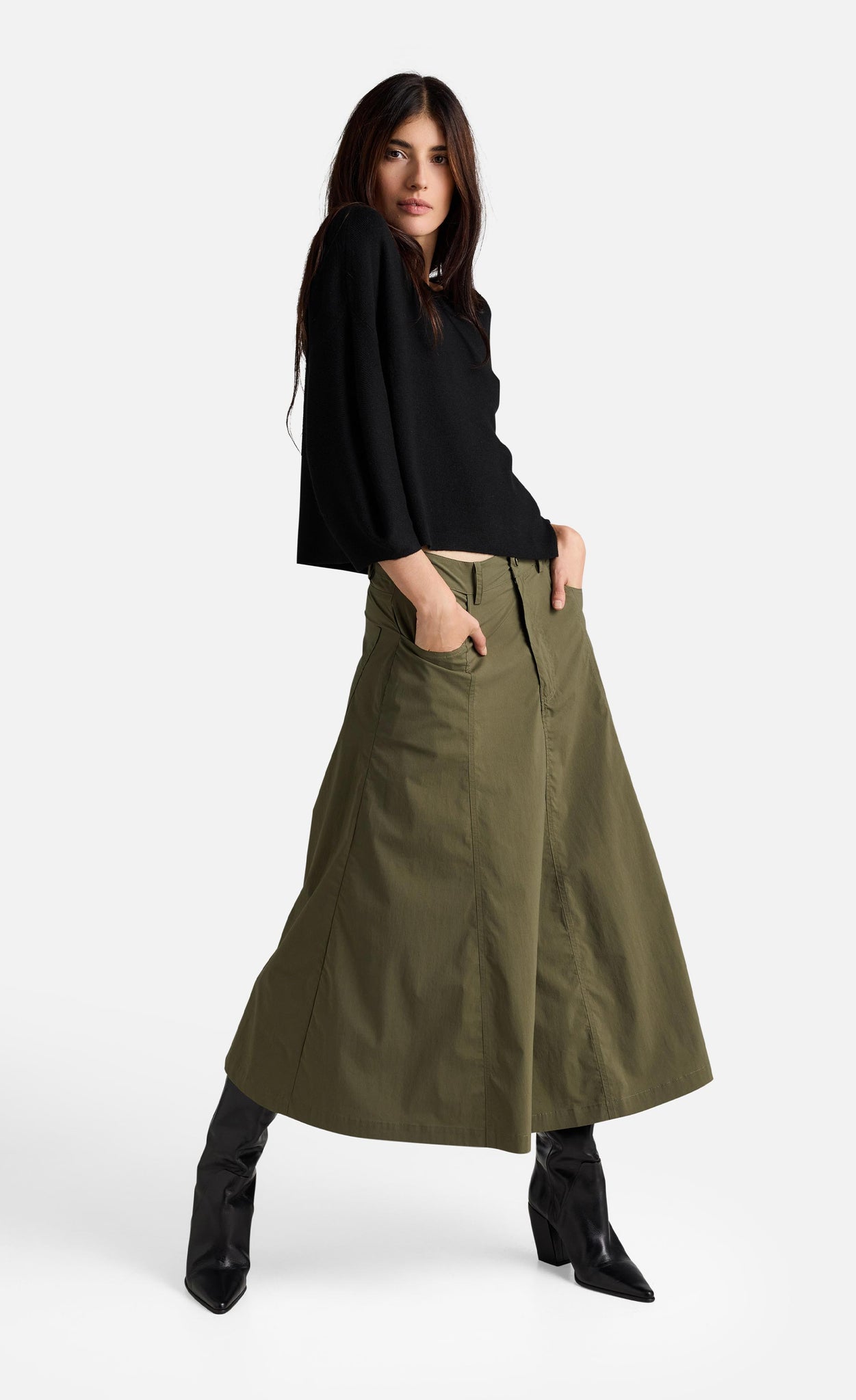 Der Rock in Midi-Länge besticht durch das überraschend sportliche Baumwollmaterial und die detailreichen Steppungen entlang der Nähte und der sportlichen Taschen. Die leichte A-Linie sorgt für eine feminine Note.