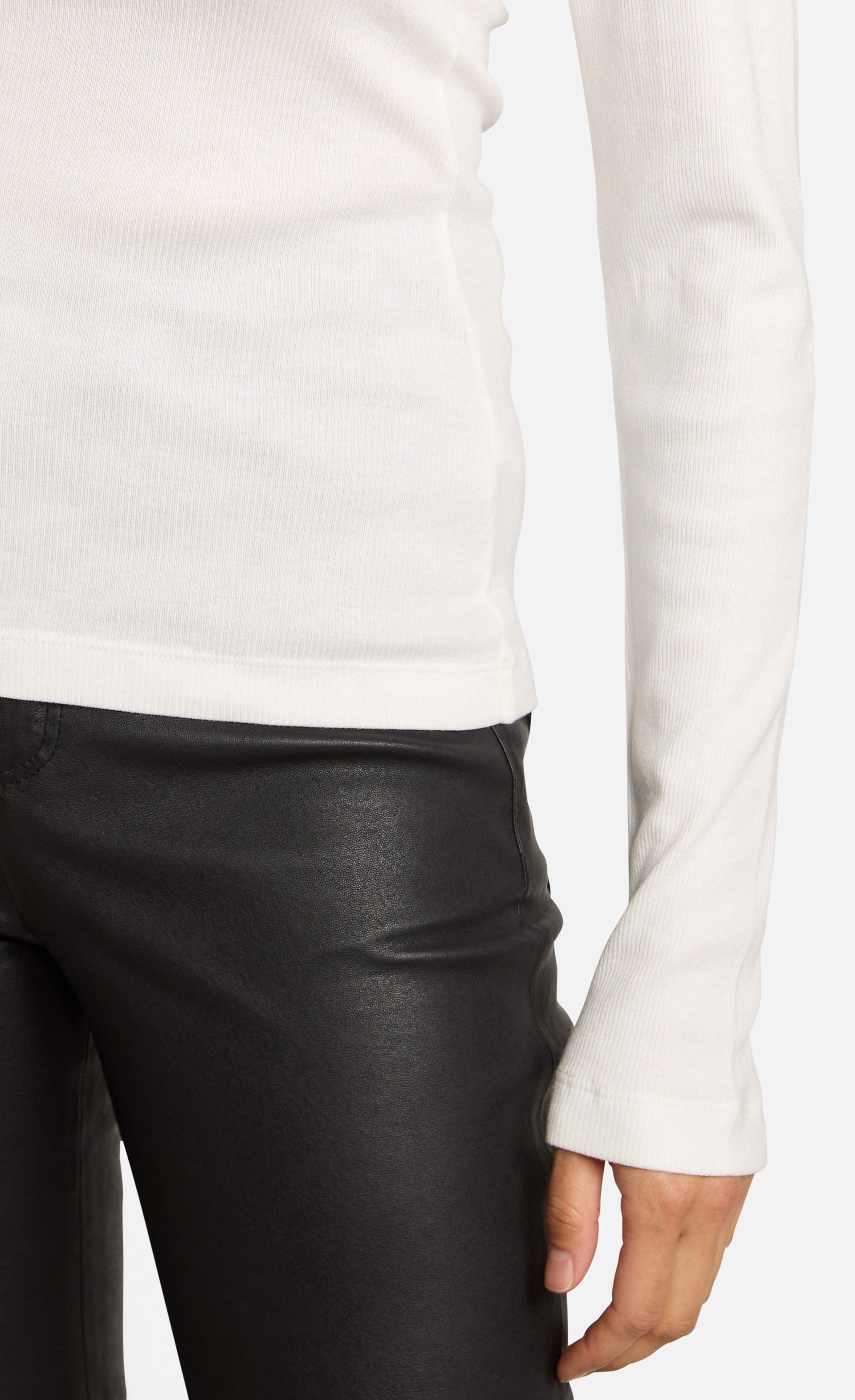 Das Oberteil hat einen tiefen, rund geformten Ausschnitt mit eingefasster Kante. Dank der schmalen Passform und des weichen Rippmaterials ist es das perfekte Basic, das wir am liebsten unter Strickjacken oder Blazern tragen.