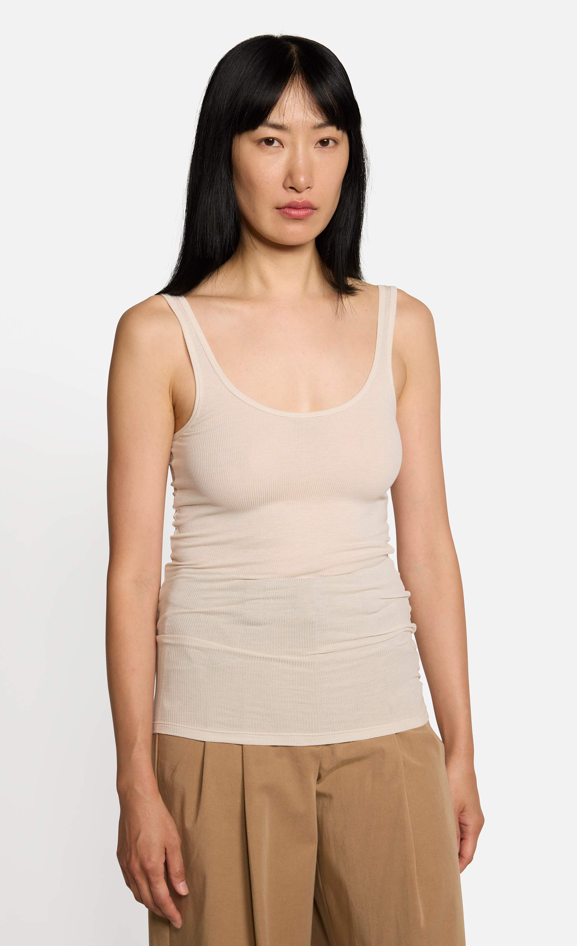 Es ist aus einem elastischen Rippjersey gefertigt, der eng am Körper anliegt und hat vorne und hinten einen U-förmigen Ausschnitt.