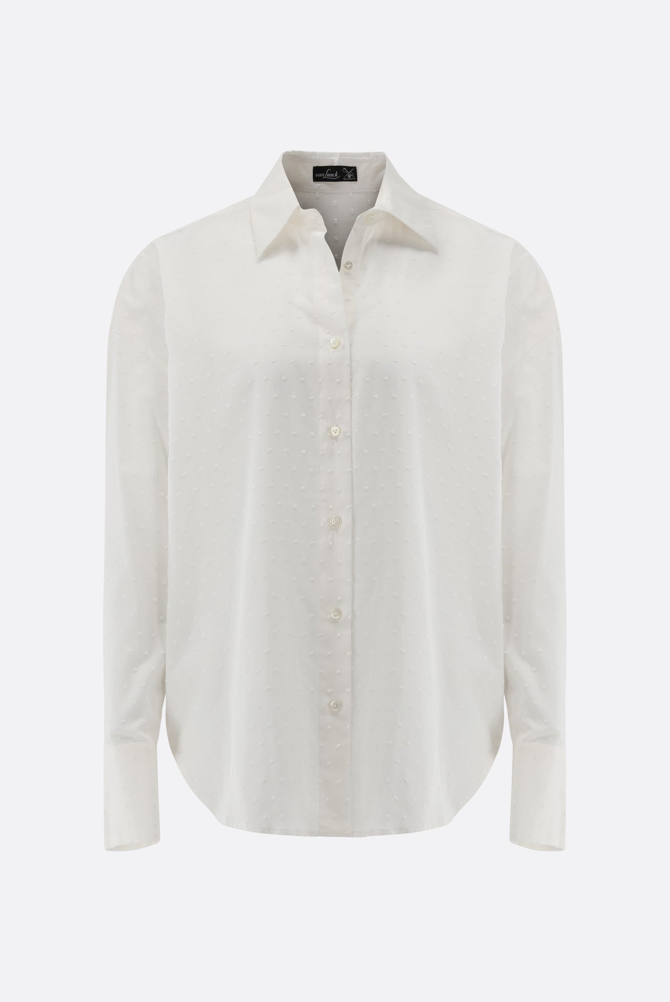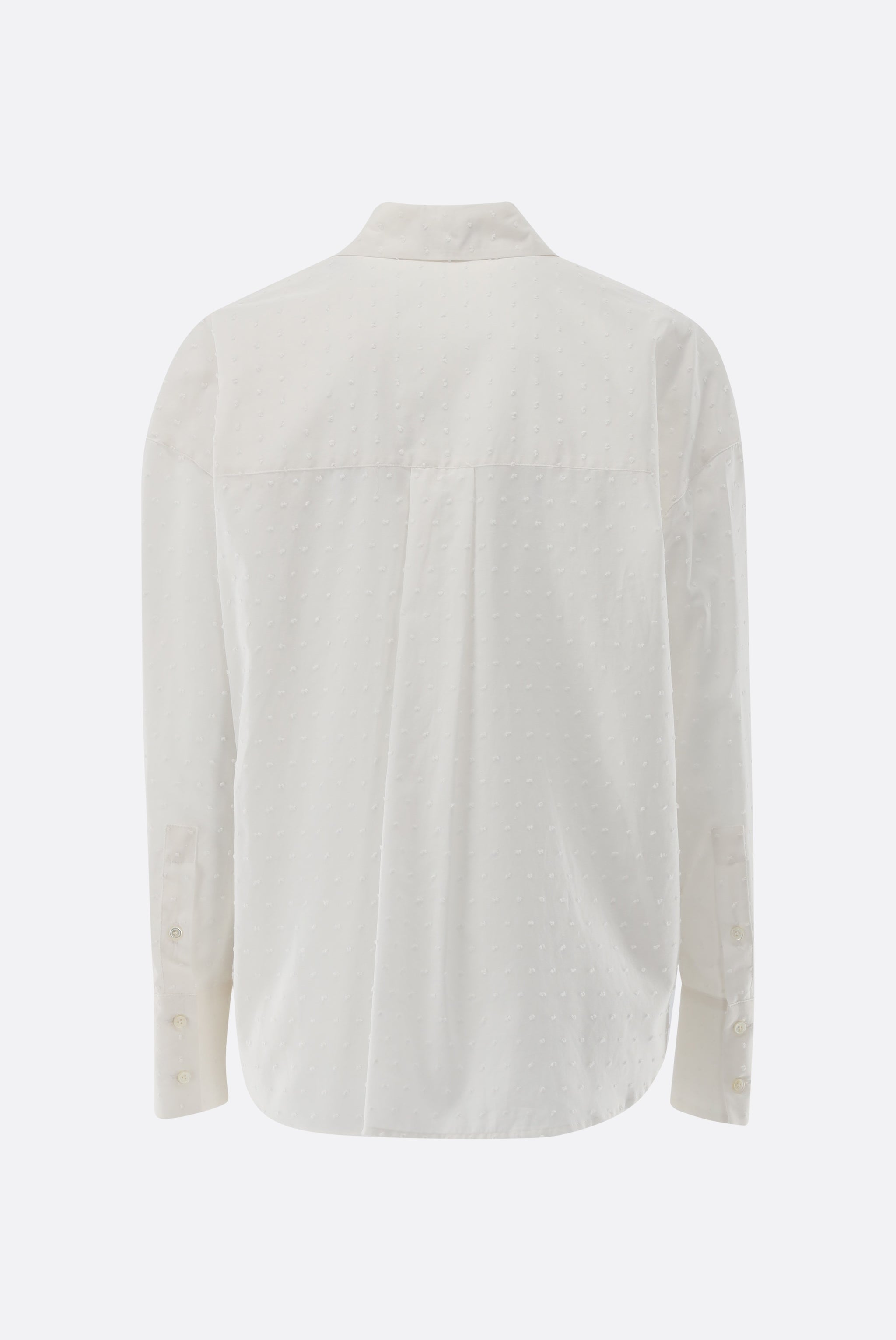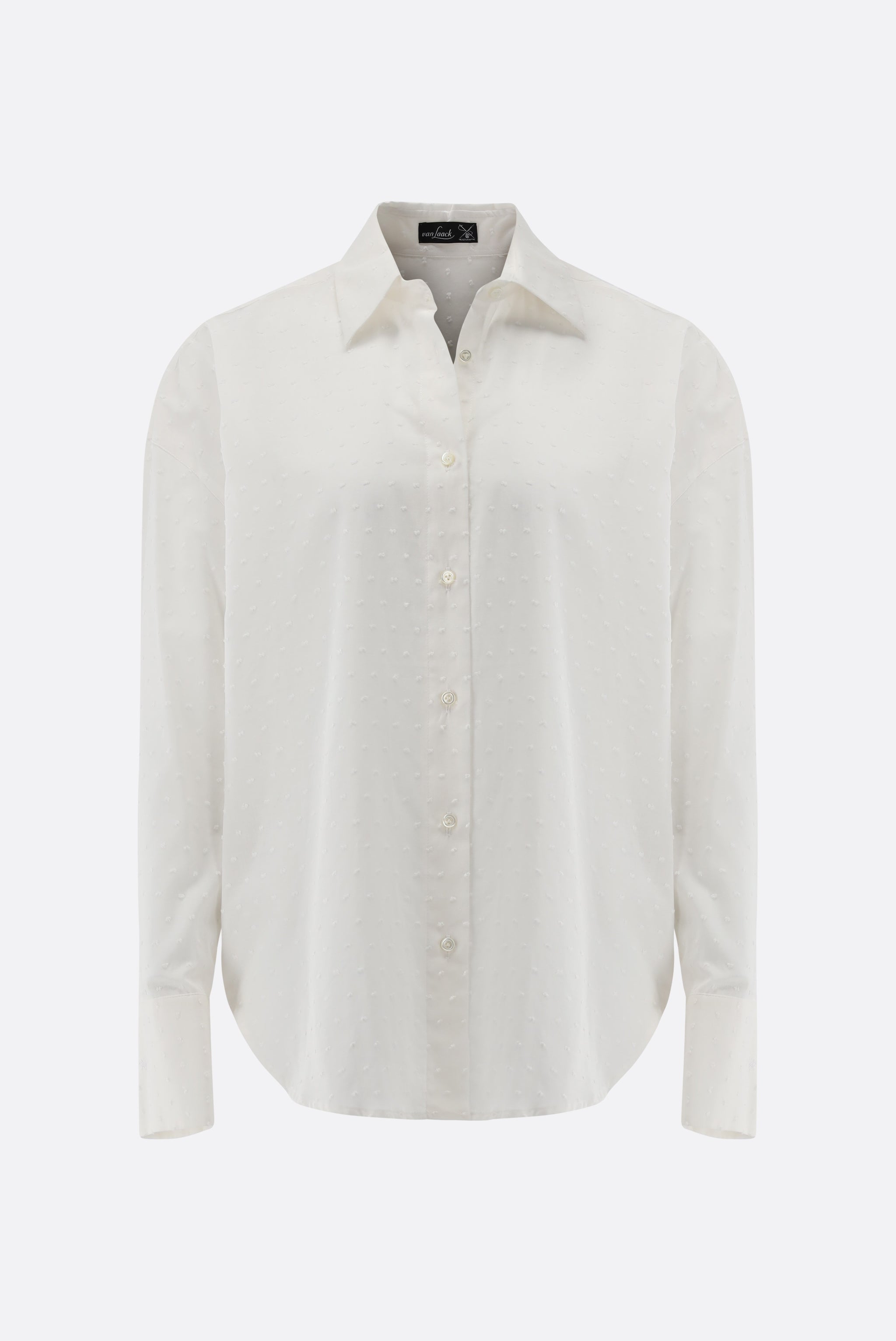 This loosely cut shirt blouse in cotton plumetis impresses with its exceptionally airy fabric. Plumetis is a lightweight cotton batiste with small, raised dots reminiscent of feathers or clouds. The dropped shoulders and box-pleated back yoke give the blouse a modern and relaxed drape. Elegant mother-of-pearl buttons complete the design, making this blouse a versatile companion for casual and summer looks.