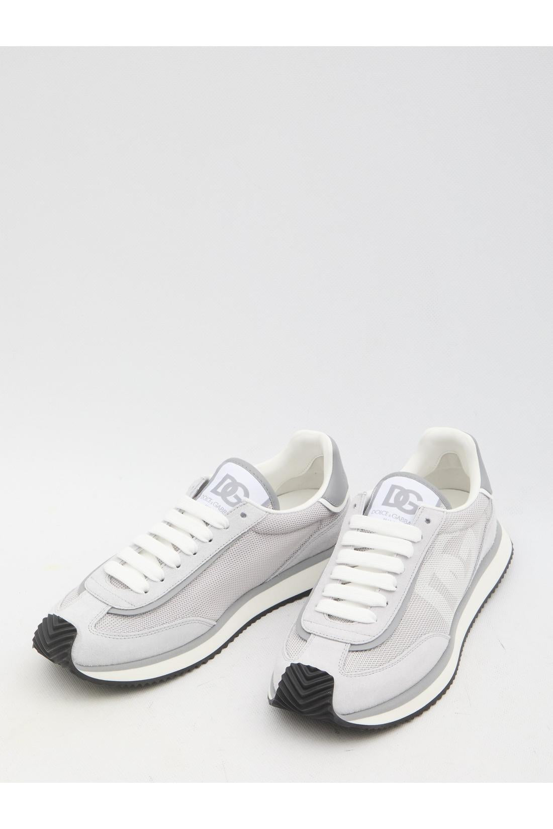 DG Cushion sneakers in white and gray suede and mesh. They feature a lace-up closure, DG logo on the tongue and side, embossed Dolce & Gabbana logo on the back, and a rubber sole. Dust bag included. Any leather imperfections are not to be considered manufacturing defects, but a peculiarity of the material.