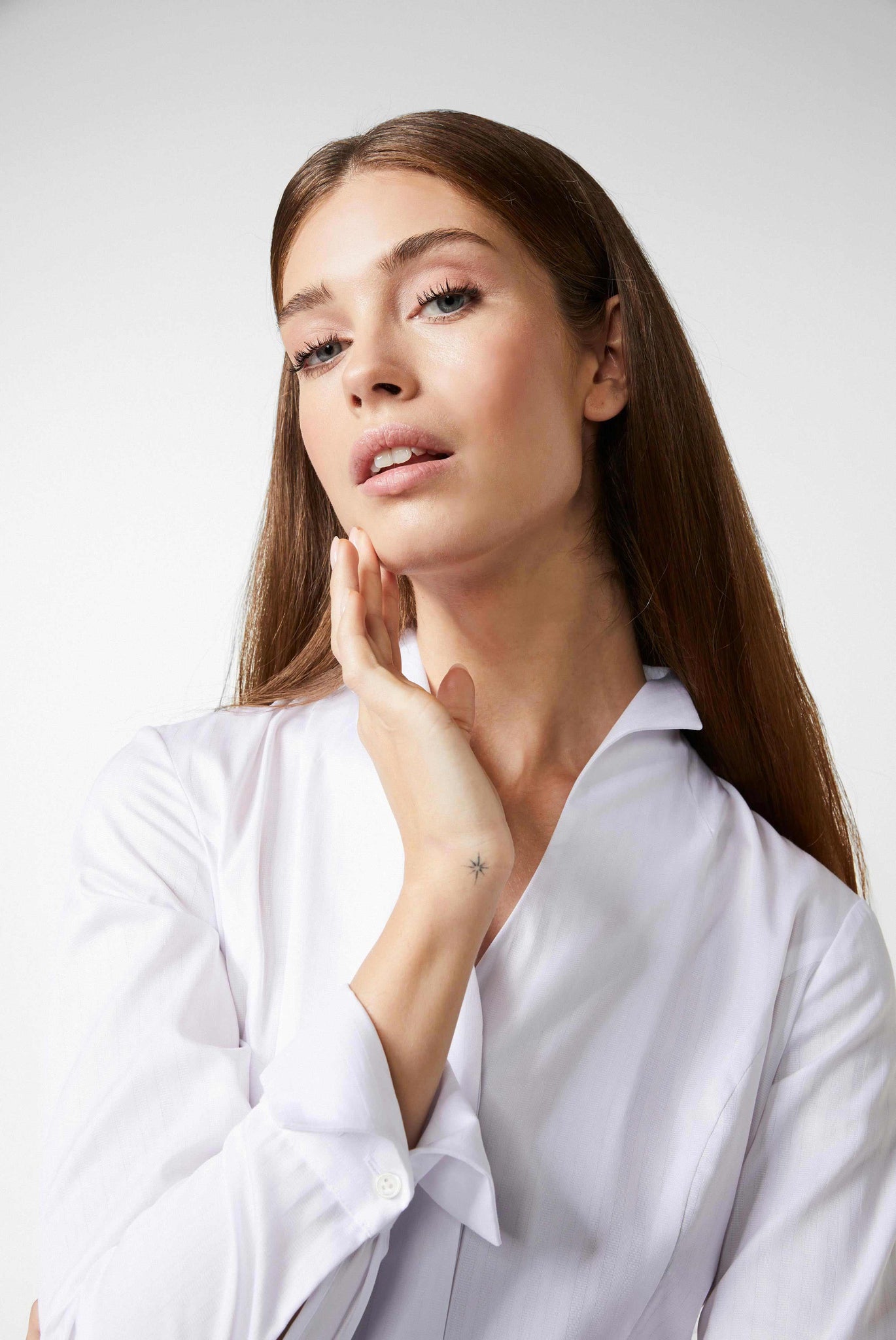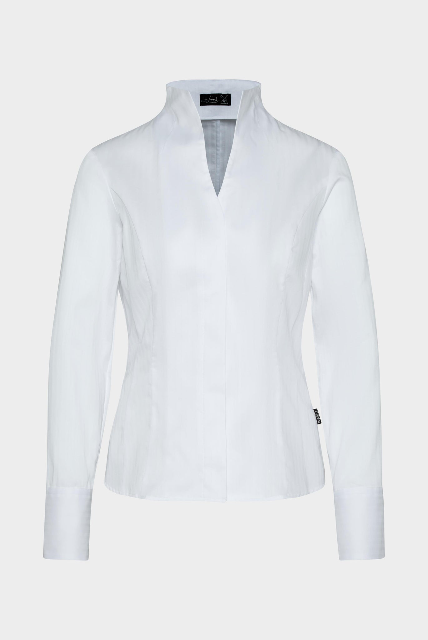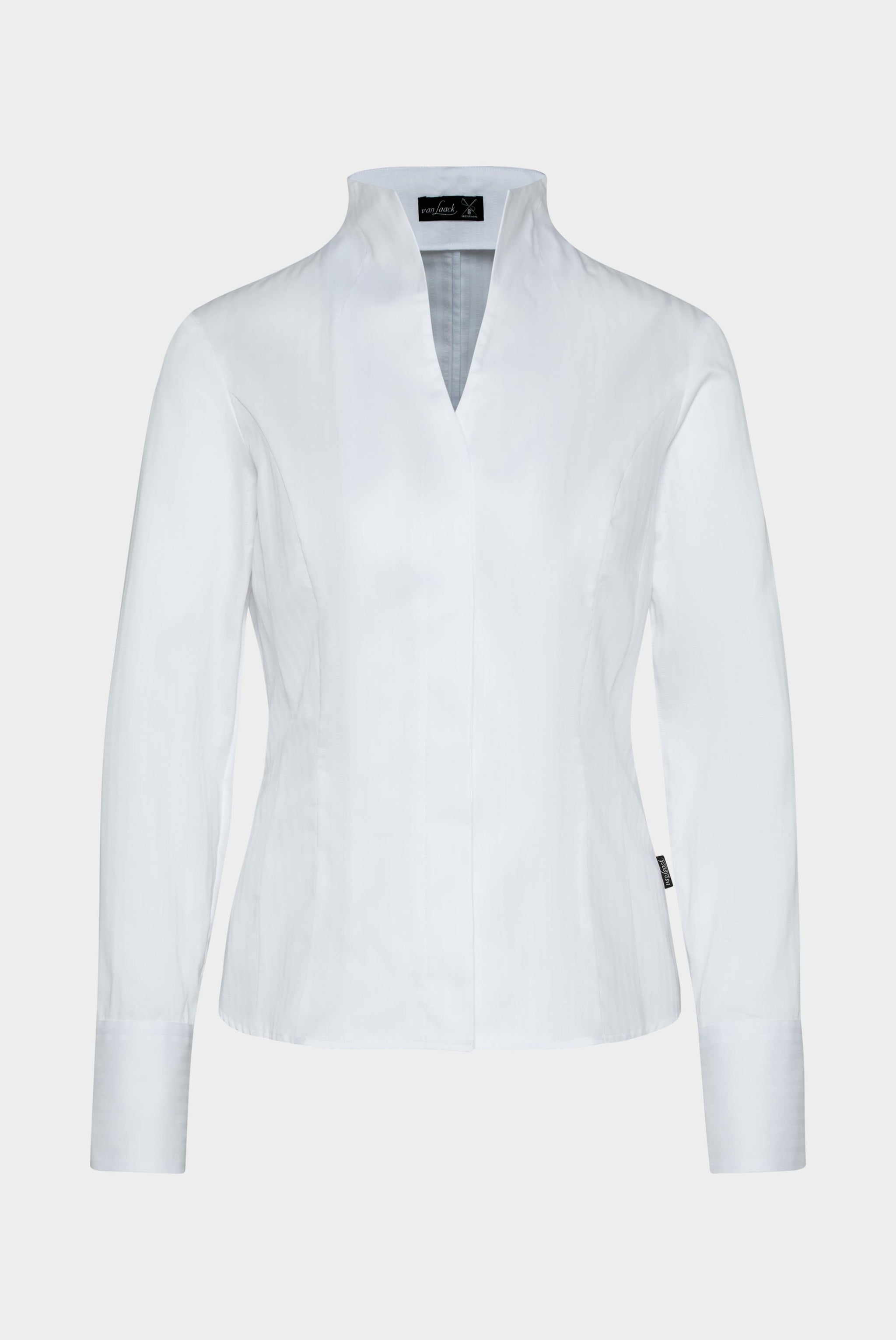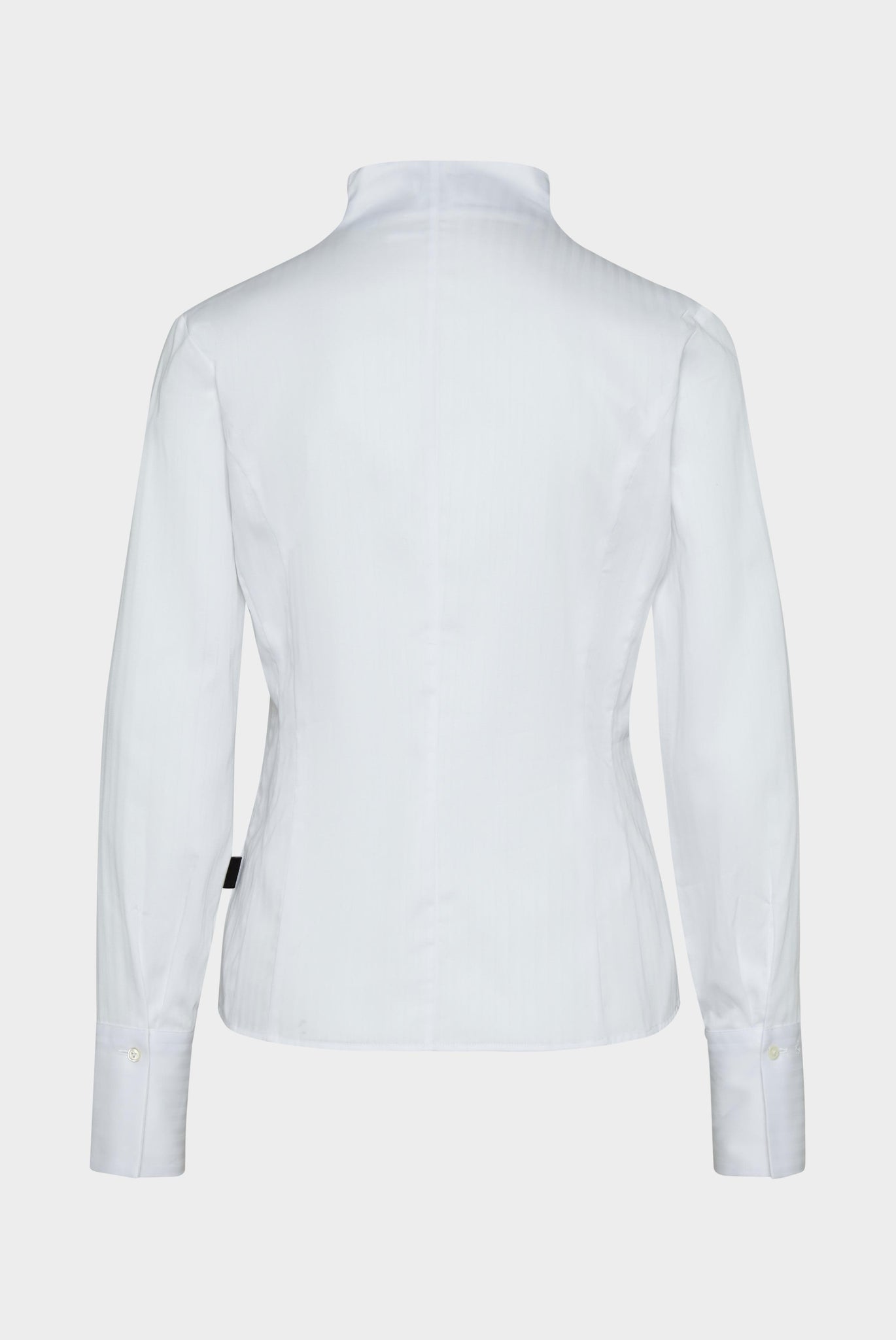 Classic stand-up collar blouse in fine cotton dobby with jacquard stripes. Concealed button placket with mother-of-pearl buttons. Perfect for festive occasions or a modern business look.