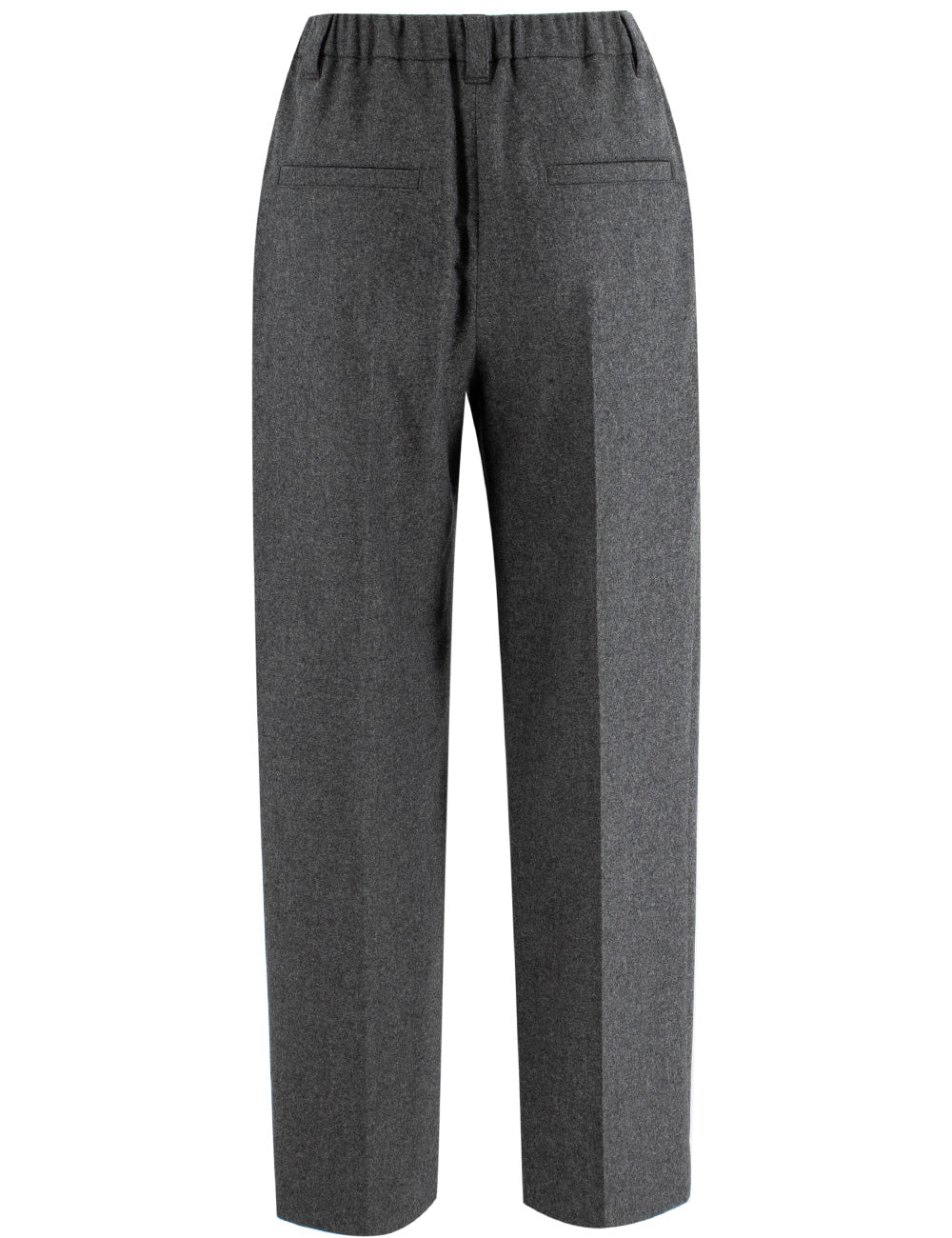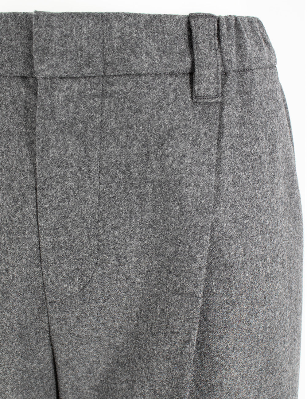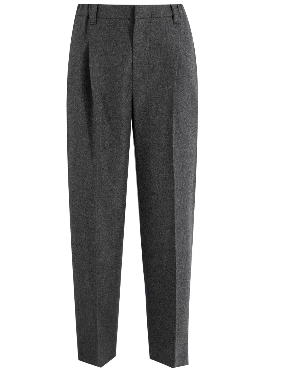 Experience the perfect blend of exclusive tailoring and sporty style with these dark gray wool trousers by BRUNELLO CUCINELLI. Crafted from a luxurious blend of 88% Wool and 12% Cashmere, these trousers offer a comfortable fit with a wrap-around effect and slightly tapered bottom. Elevate your wardrobe with this timeless piece.