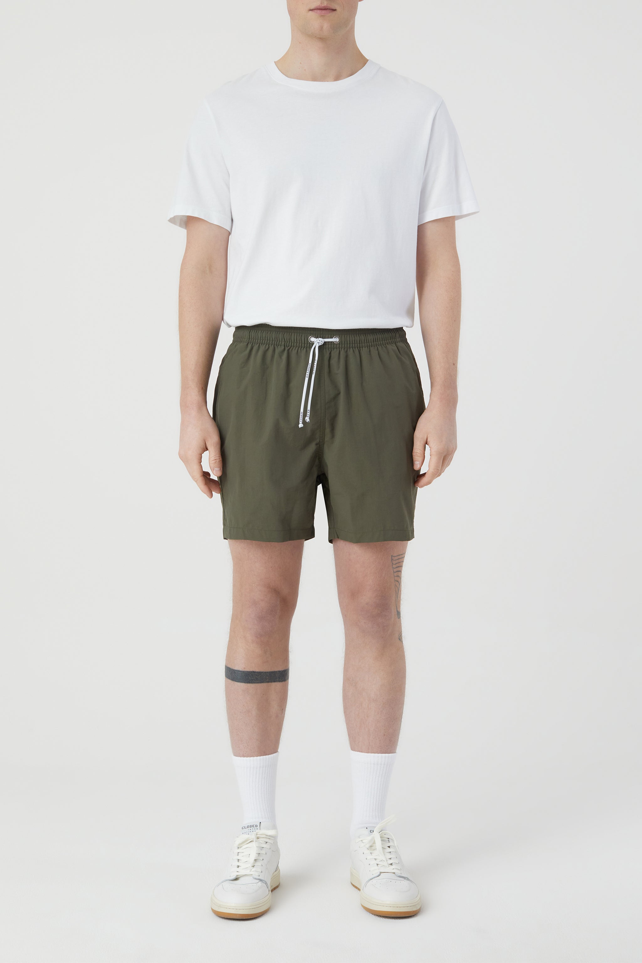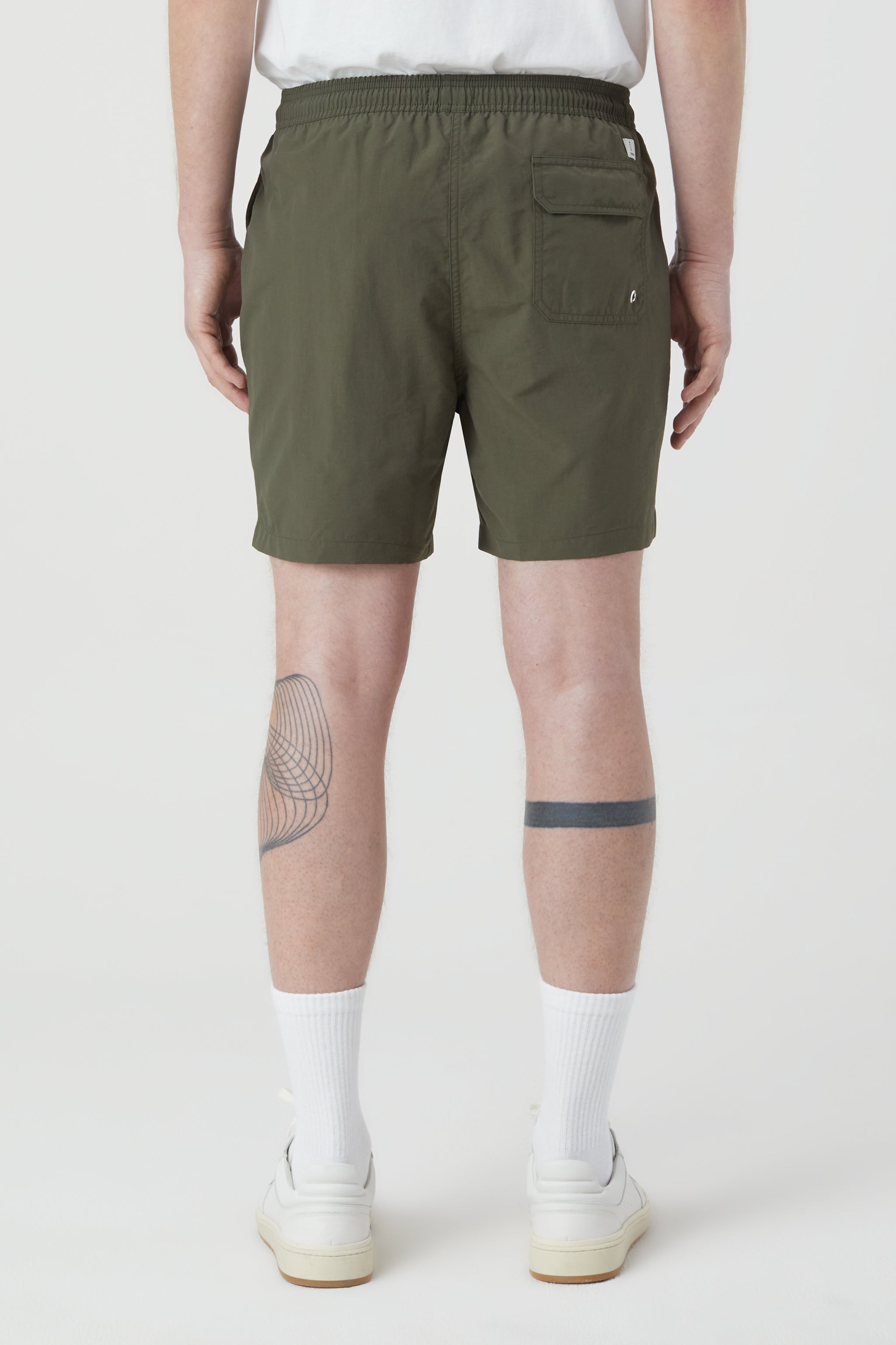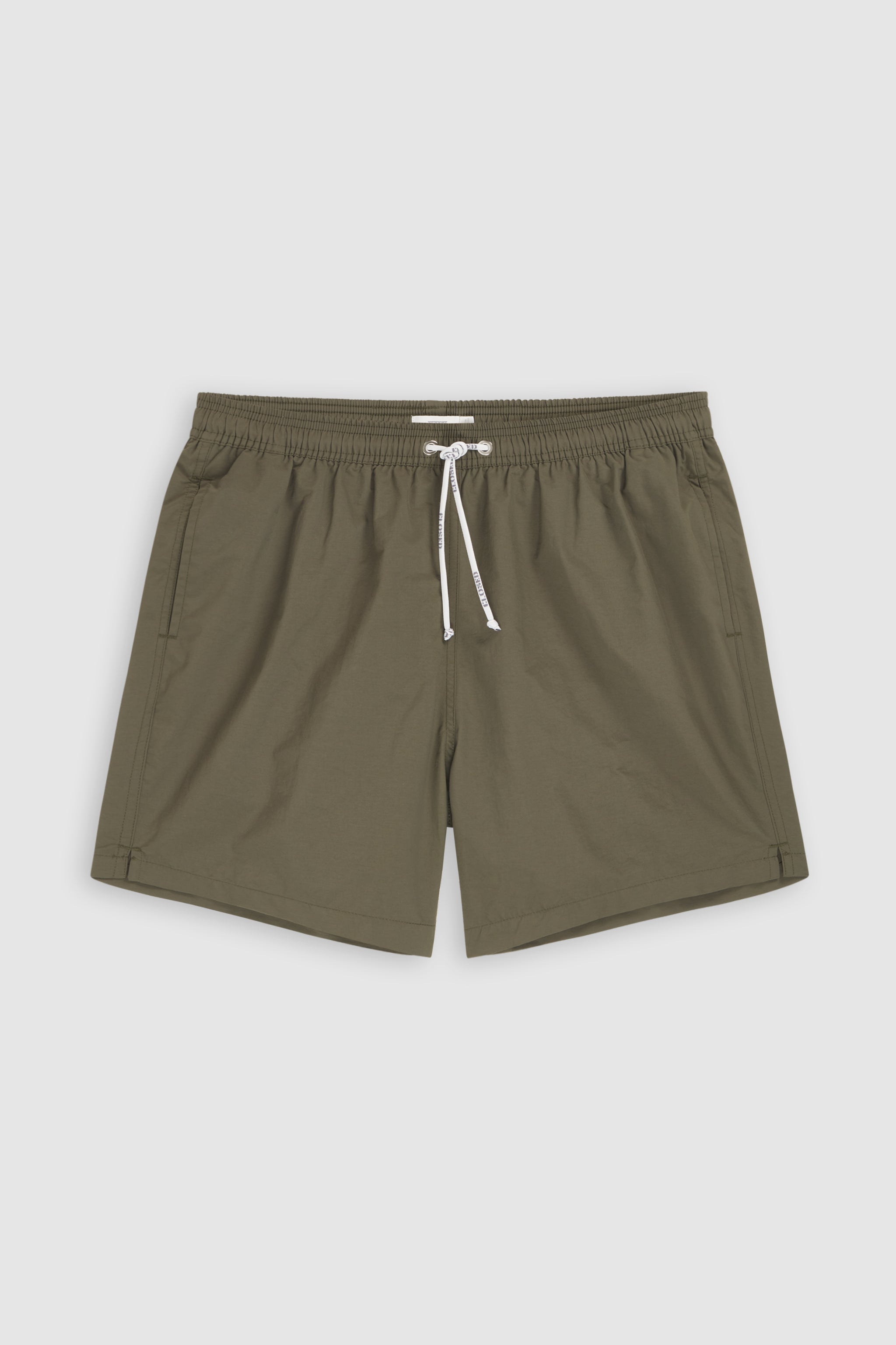 Swim shorts made from solid-color woven fabric with quick-drying properties. Stretch waistband with drawstring and closed logo tape, side pockets and a hook-and-loop back pocket. Mesh lined.
