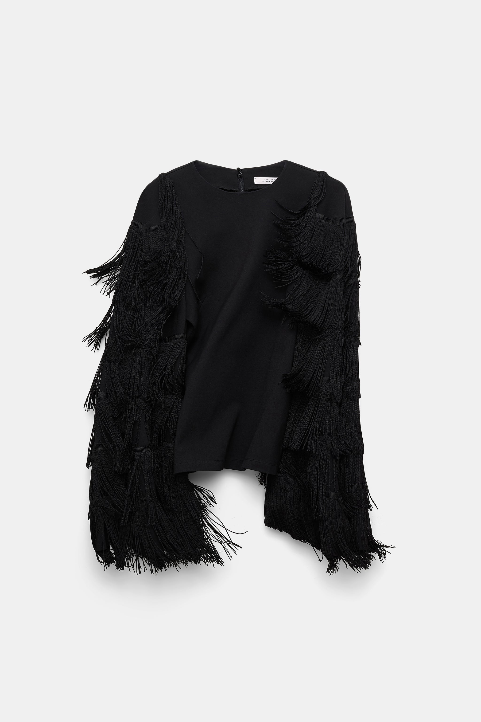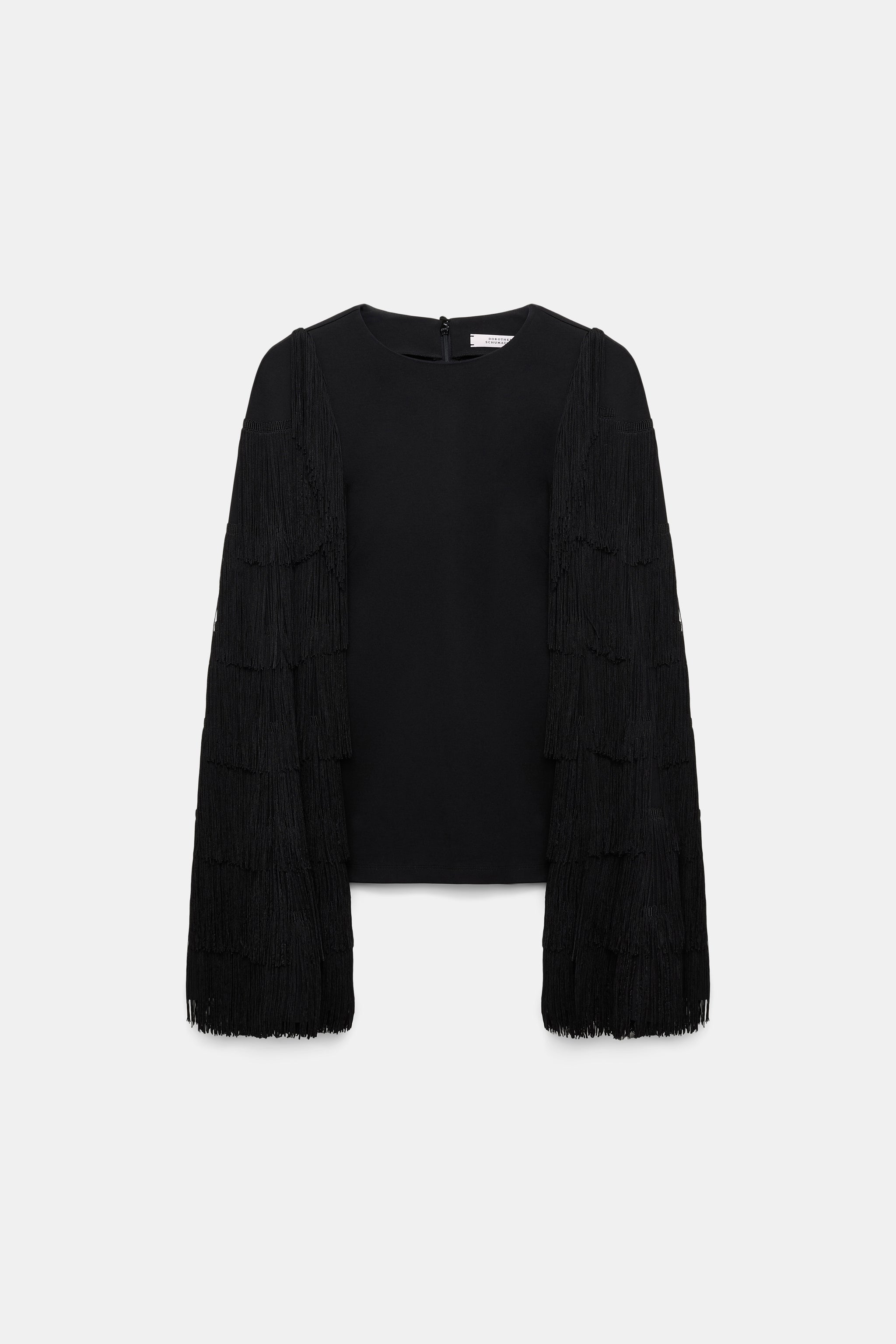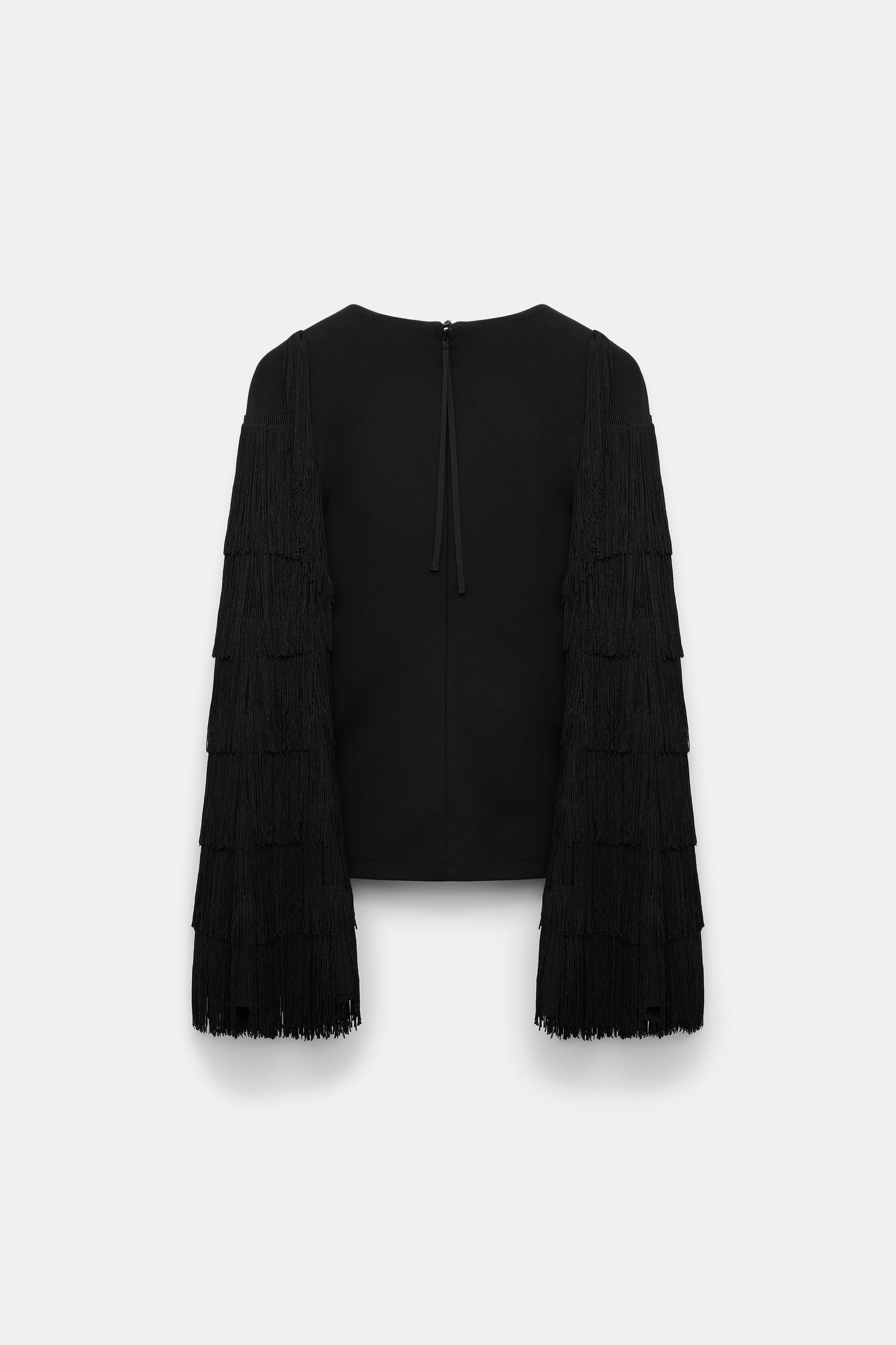 This long-sleeved top is made from soft Punto Milano fabric and features long fringed sleeves. The top has a close fit.