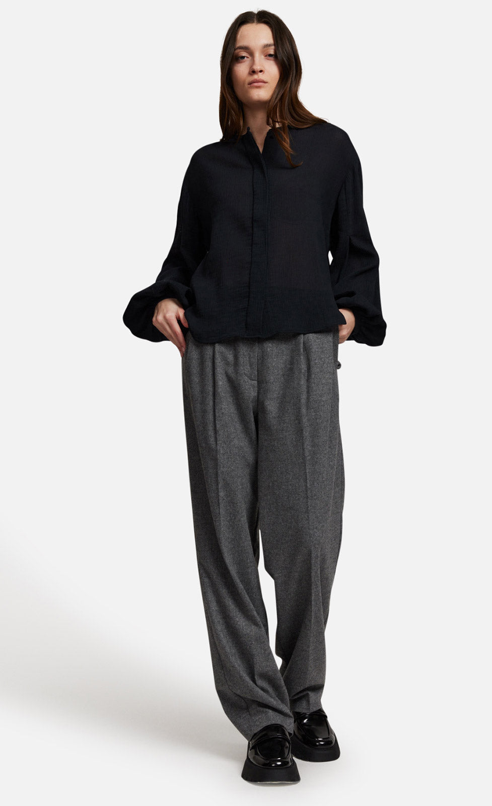 These fashionable trousers are characterized by their wide leg, wintery mélange fabric and flap pockets.