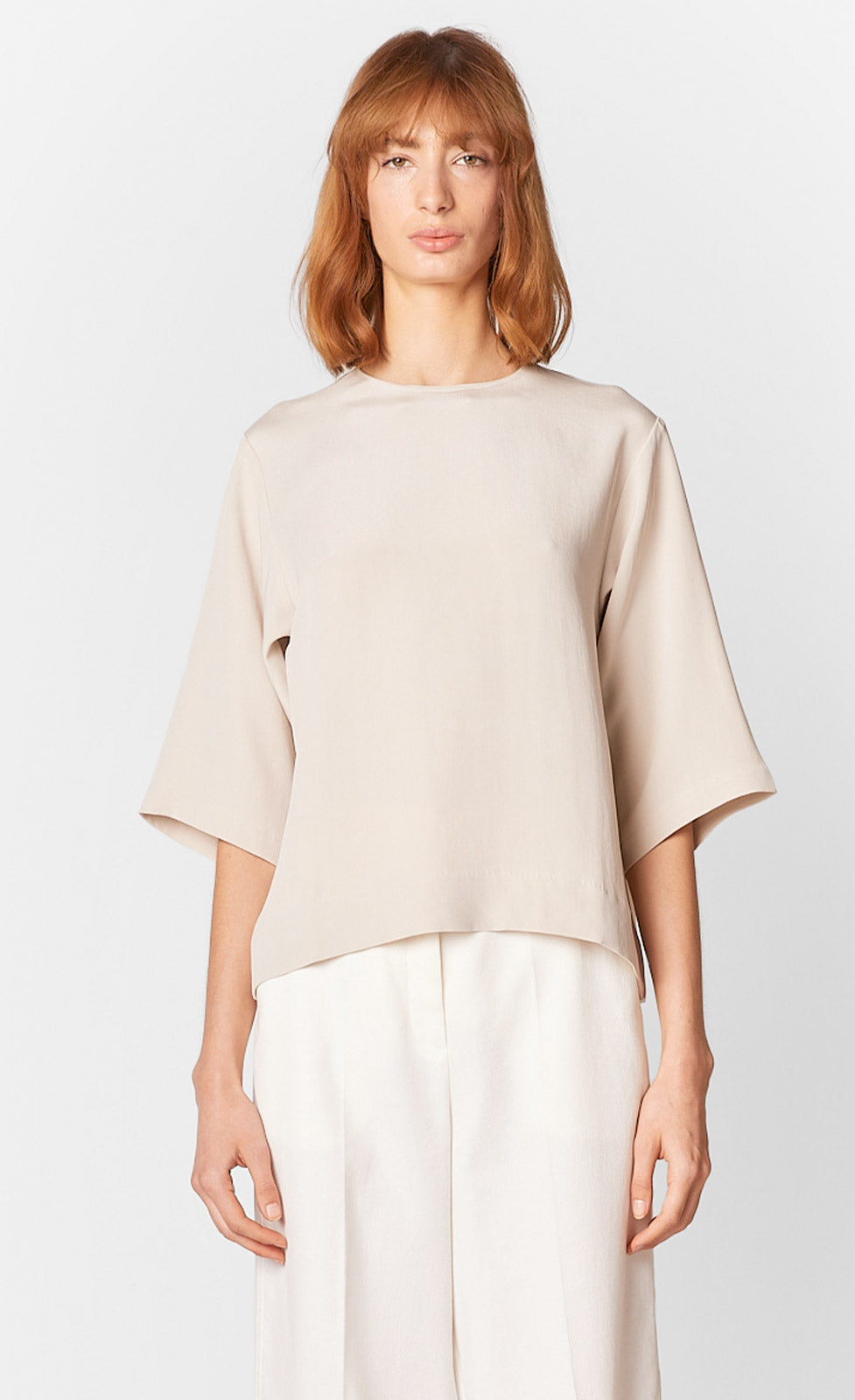 Sie überzeugt durch die schwere Seidenware mit feinem Sandwash-Effekt, der dem Style einen feinen, samtigen Schimmer verleiht. Schmückendes Element dieser Bluse ist der rückwärtige kurze Reißverschluss am Ausschnitt.