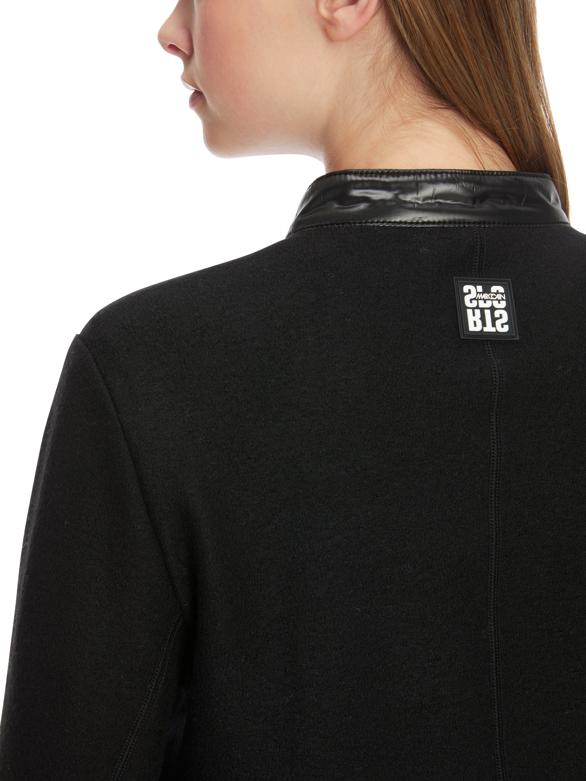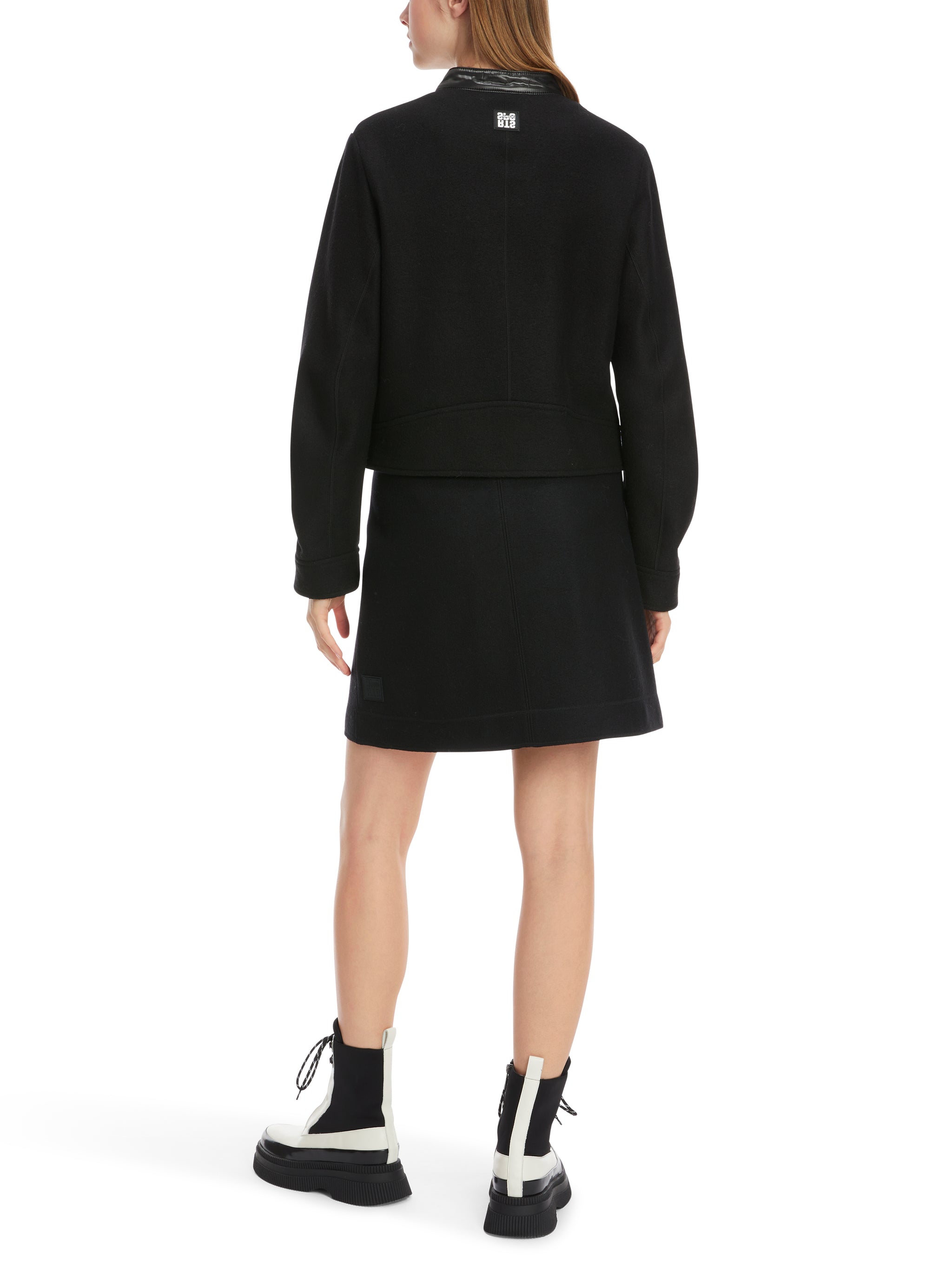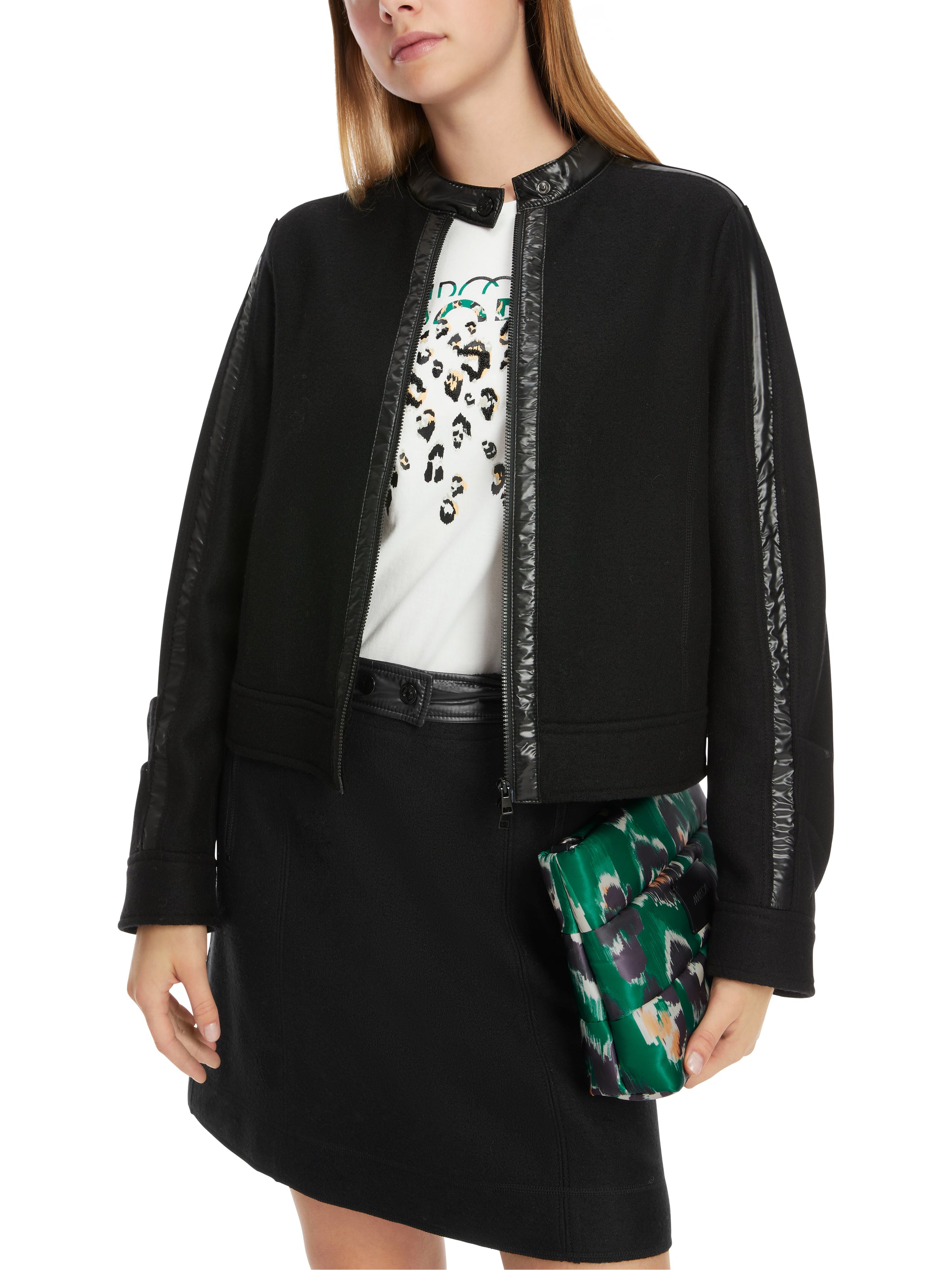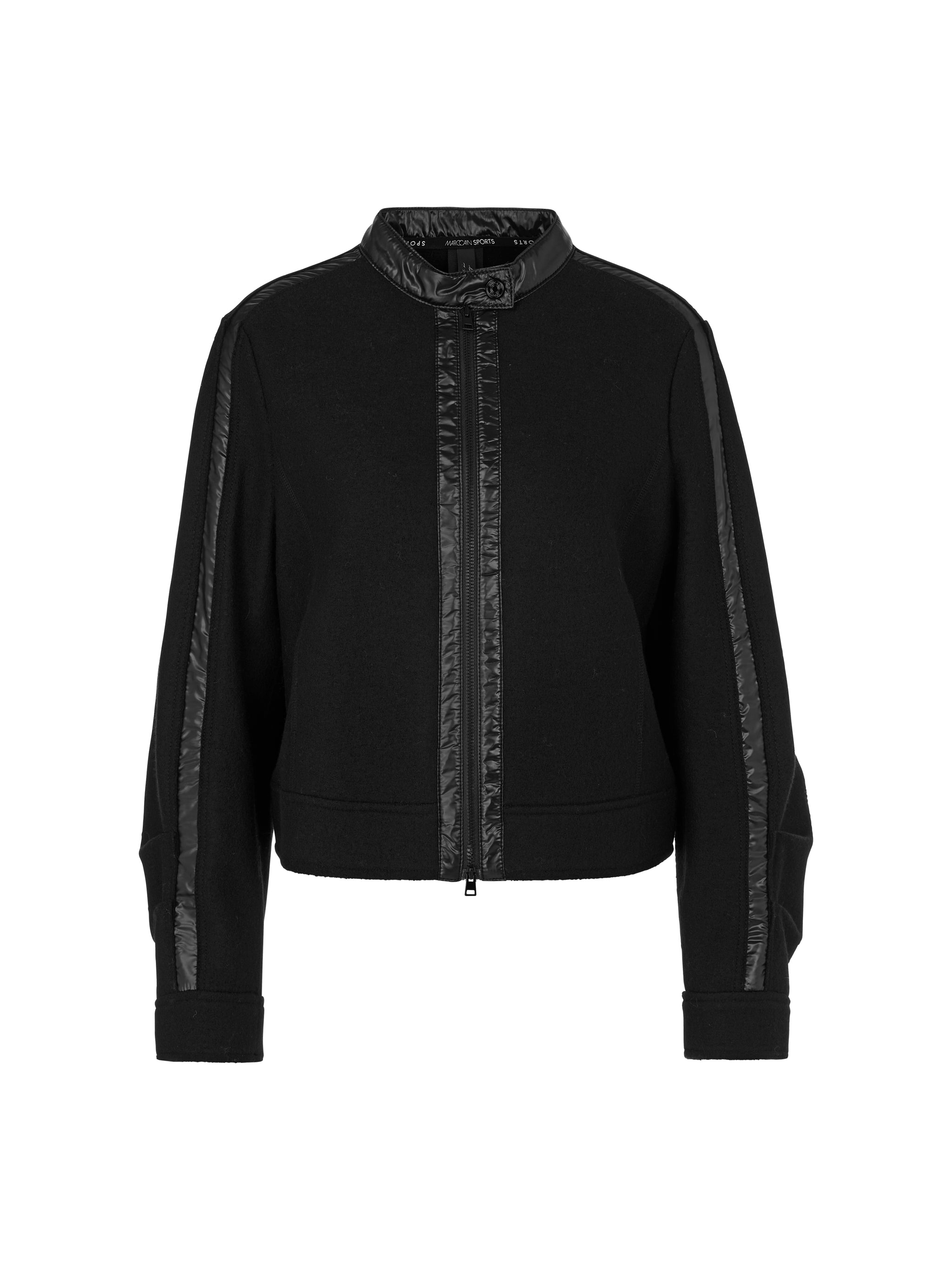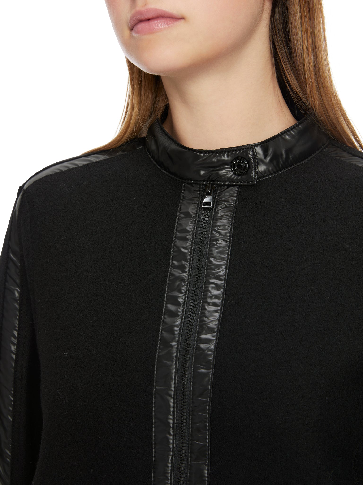 This short jacket is designed from warm wool. Eye-catching nylon details adorn the stand-up collar, sleeves, and contrasting zipper. The jacket has a fitted cut and features princess seams. It is "Knitted in Germany": the yarns are knitted on state-of-the-art knitting machines, and the fabrics are finished in Germany. The individual pieces, such as sleeves and front, are sewn together in European partner factories.