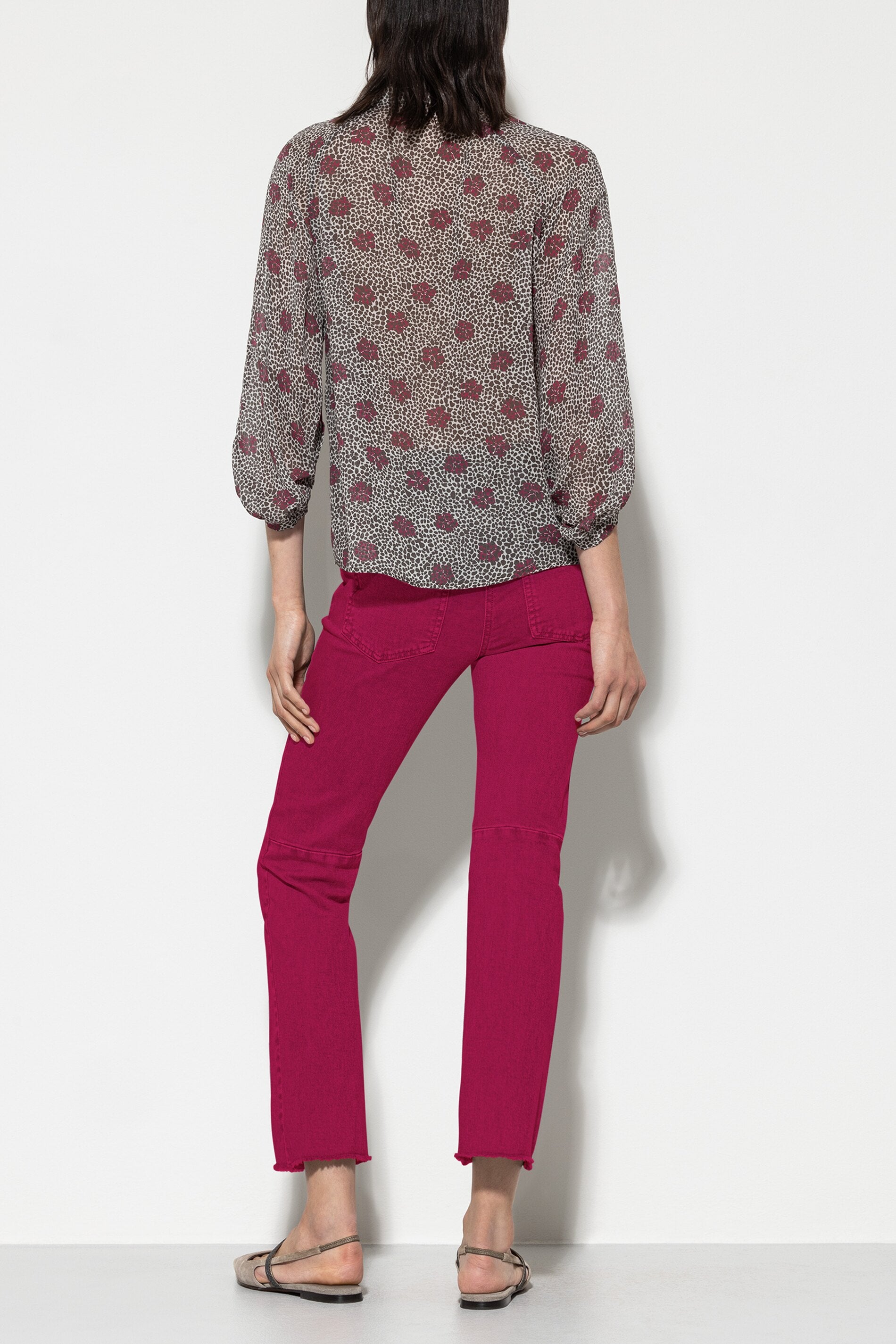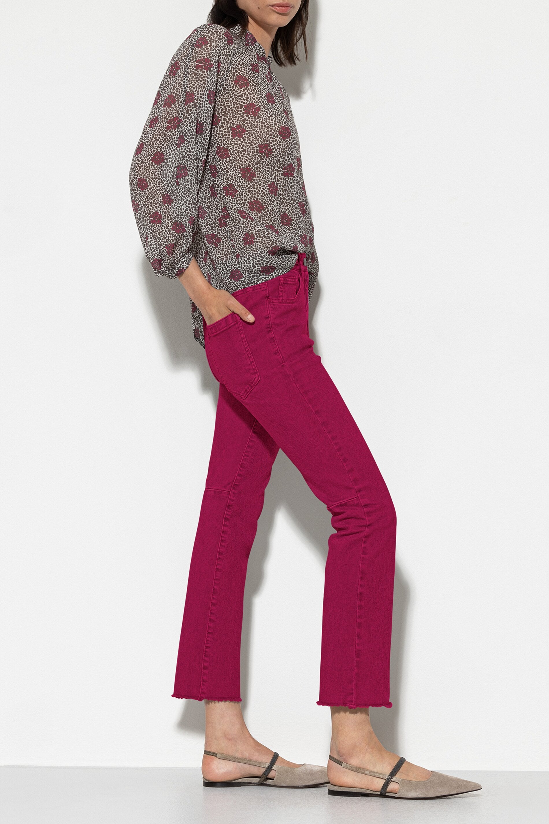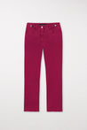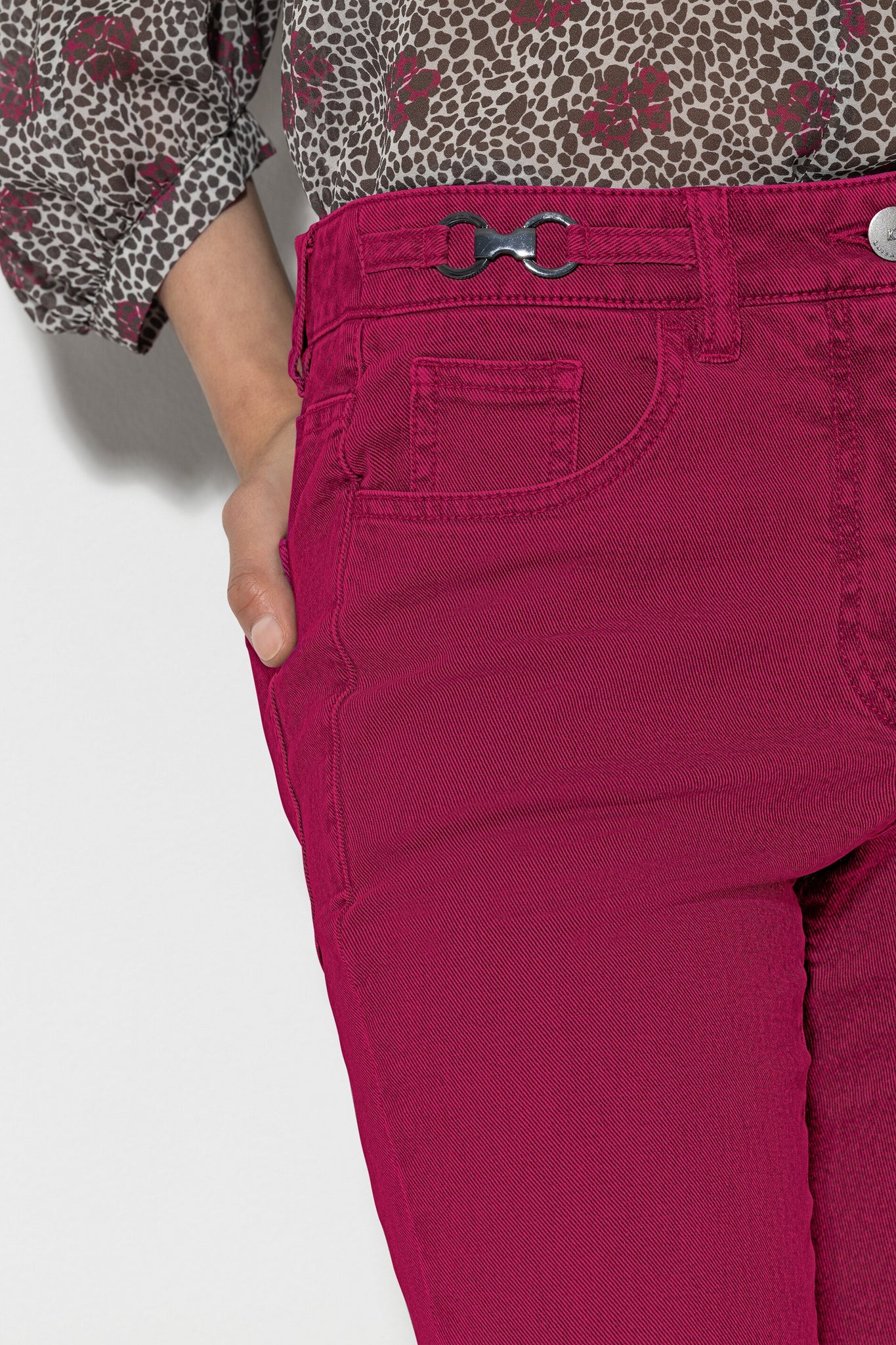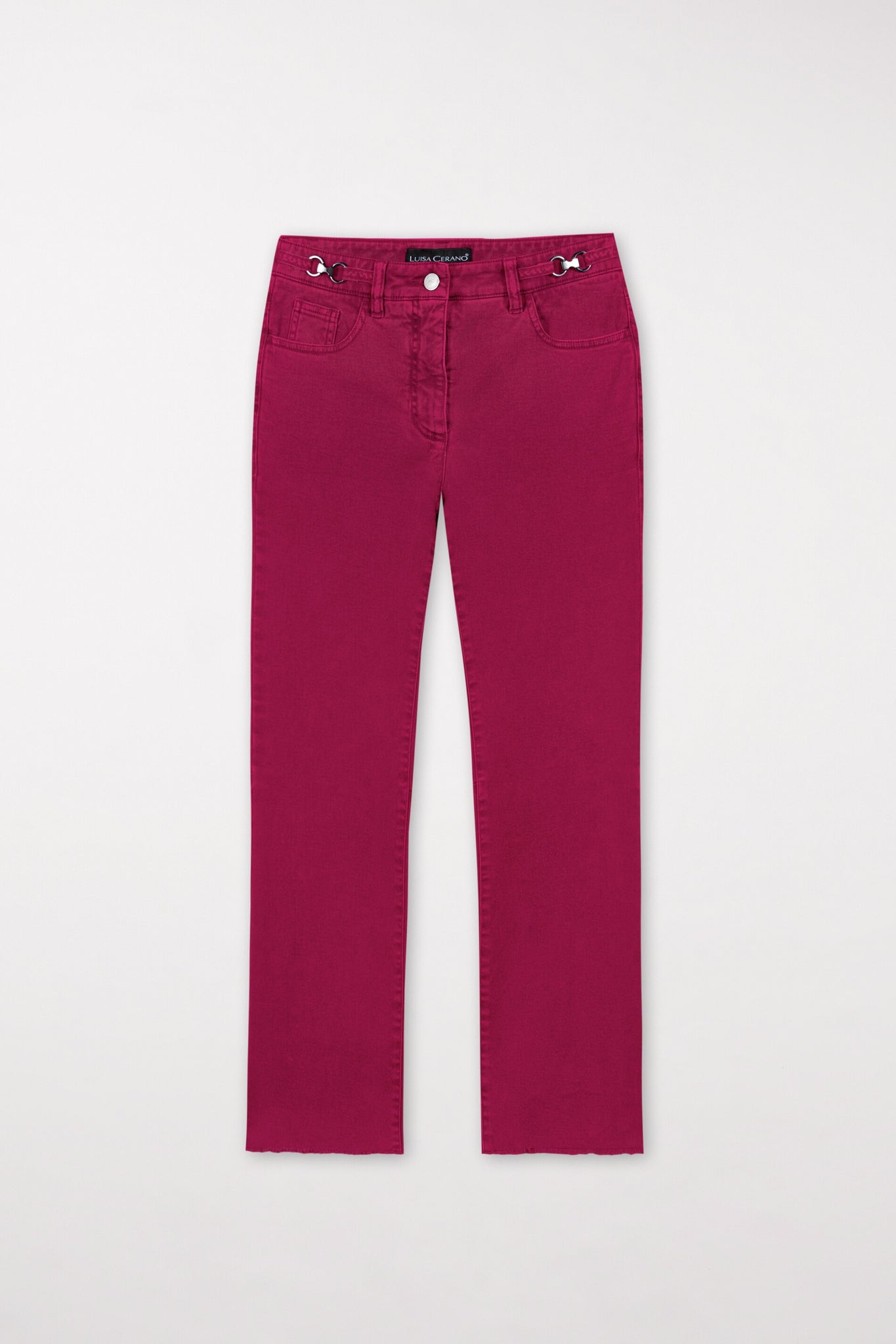 Long trousers in soft authentic twill denim with metallic embellishments at the waistband. The raw hem at the legs is accentuated by short fringe. A version without metallic embellishments at the waistband is also available.