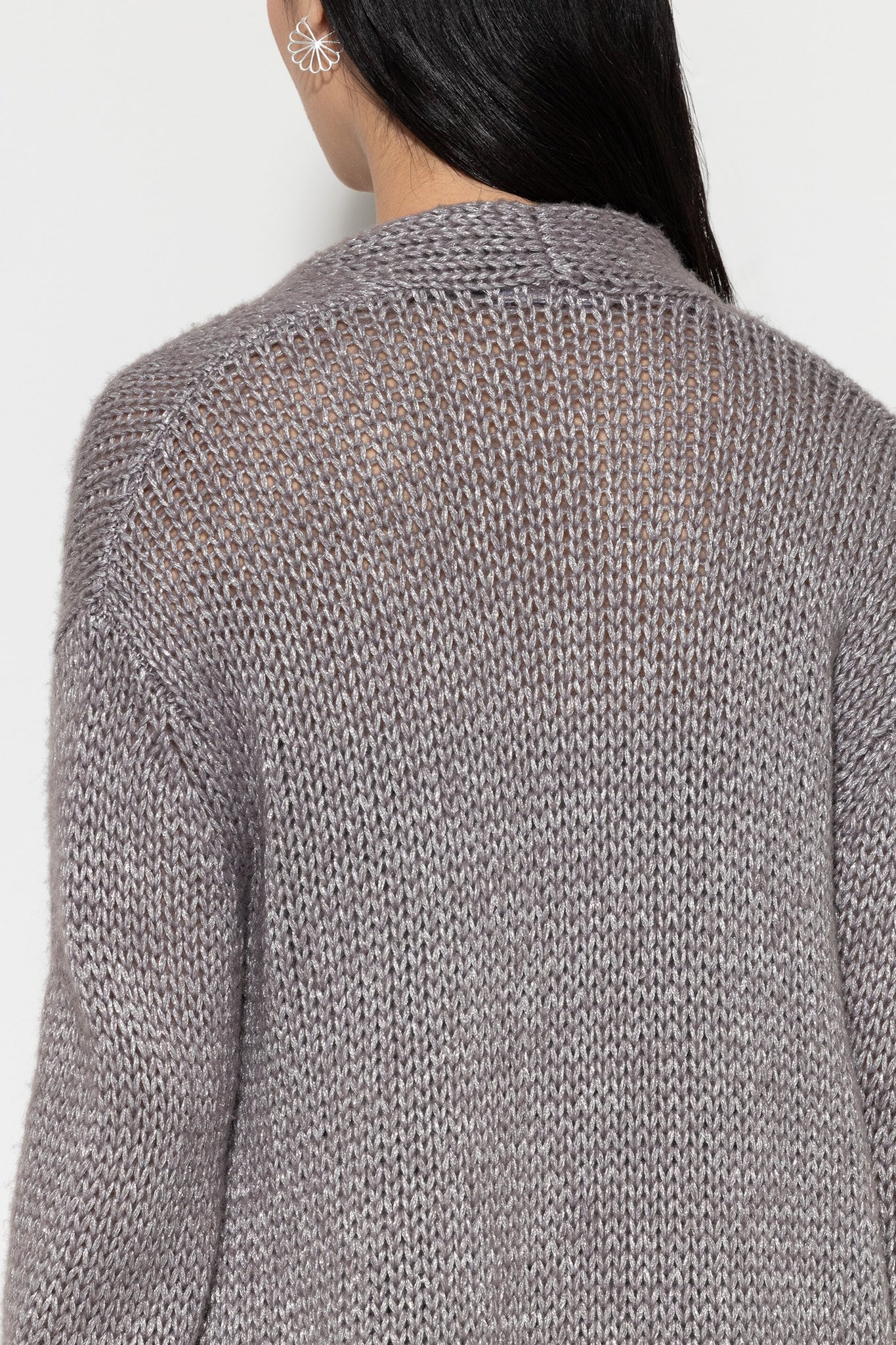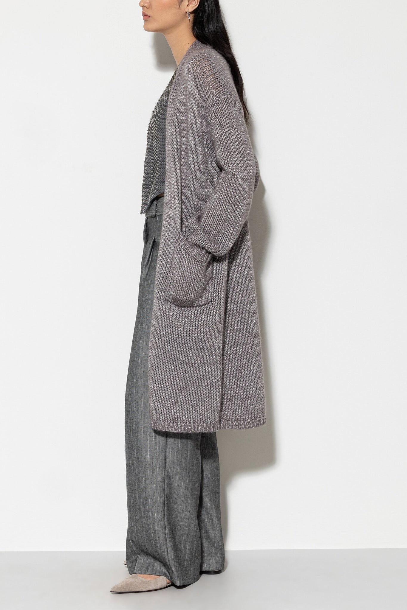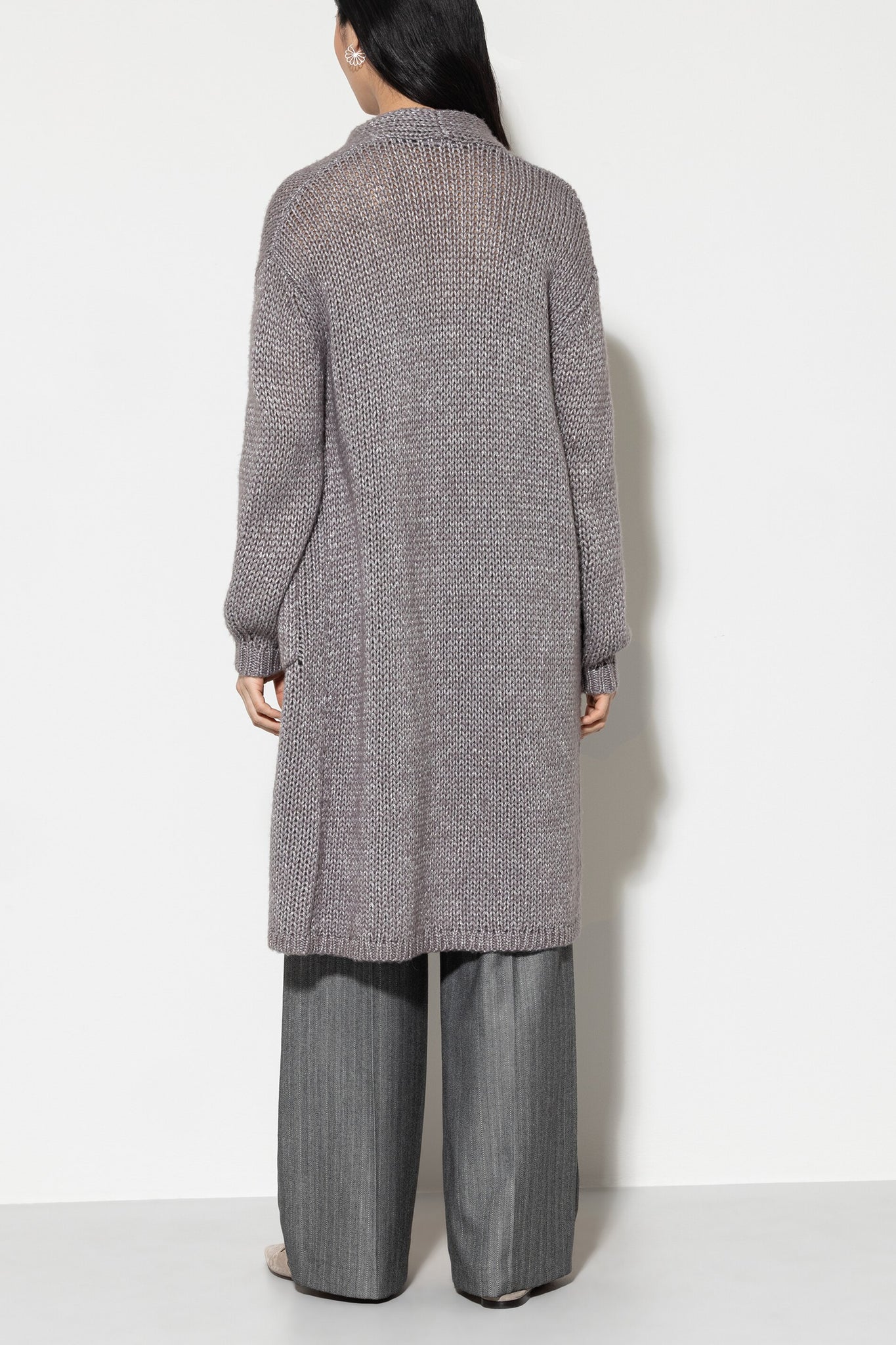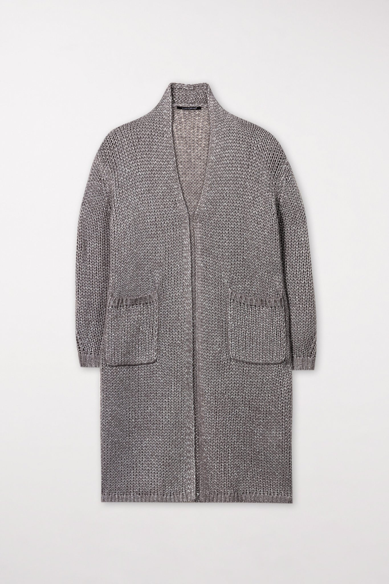 Open-front cardigan in a long fit with two patch pockets, knitted from a wool blend. The incorporated metallic yarn adds a glamorous touch.