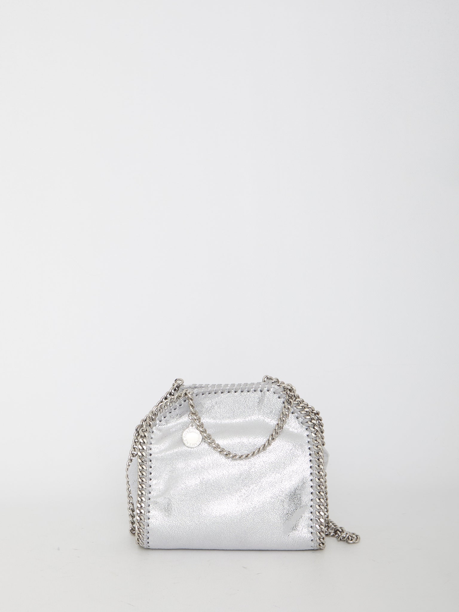 Micro Falabella tote bag in semi-shiny silver vegan Shaggy Deer fabric with silver-tone diamond-cut chain. It features two top handles, shoulder strap, magnetic closure, one main interior compartment and one interior slip pocket. Dustbag included.