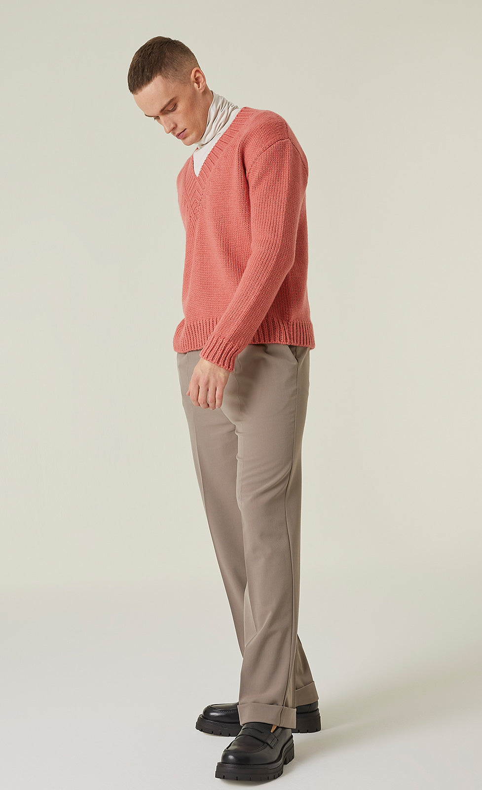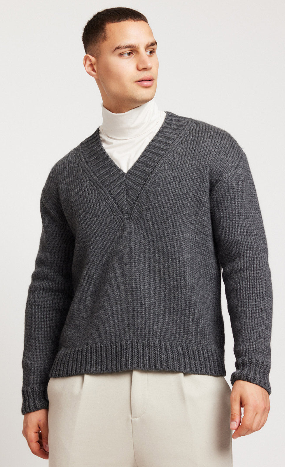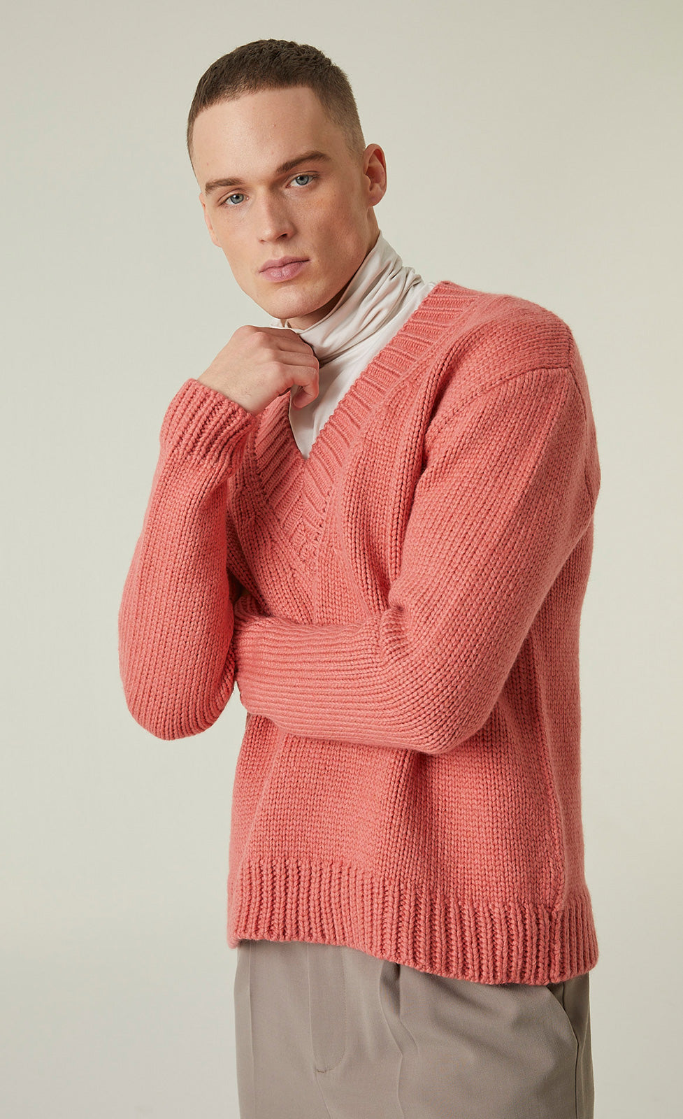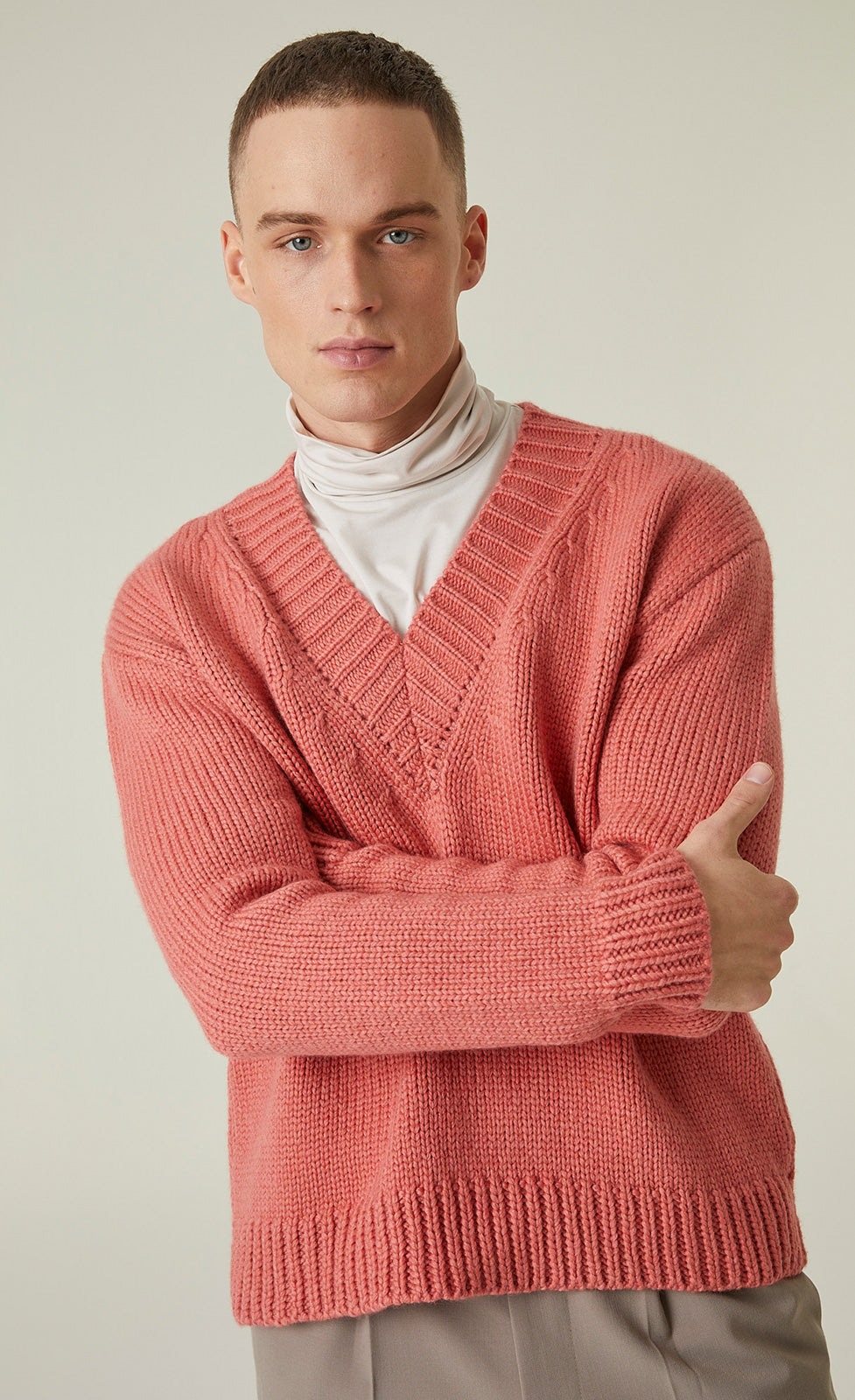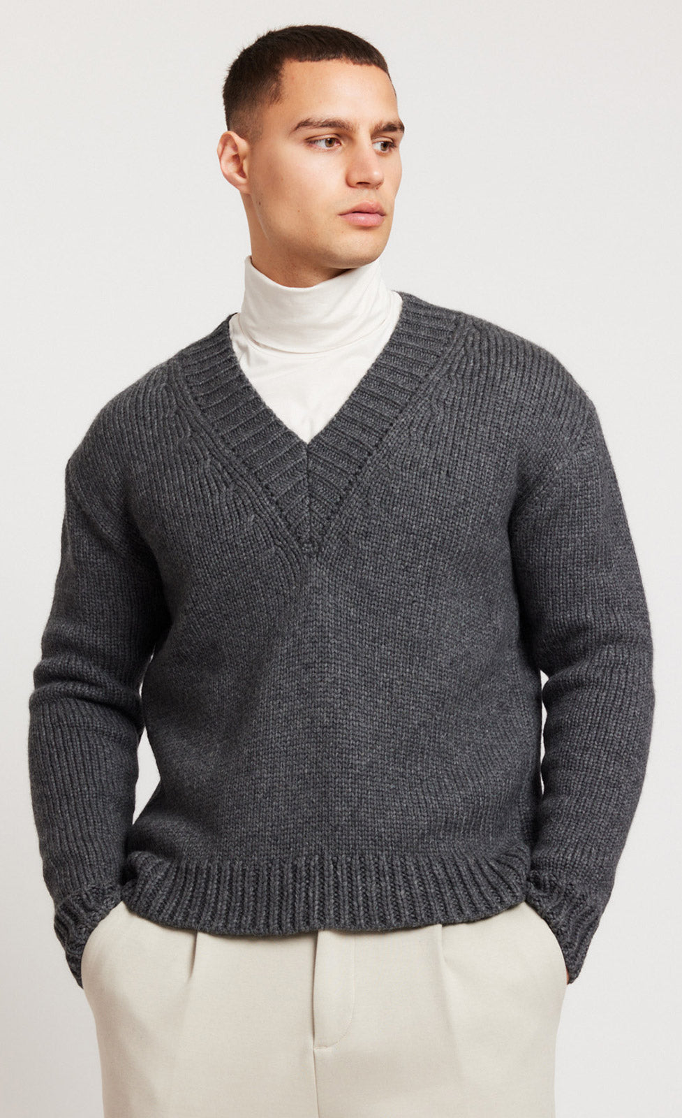 This sweater impresses with its chunky knit, deep V-neck and relaxed fit.