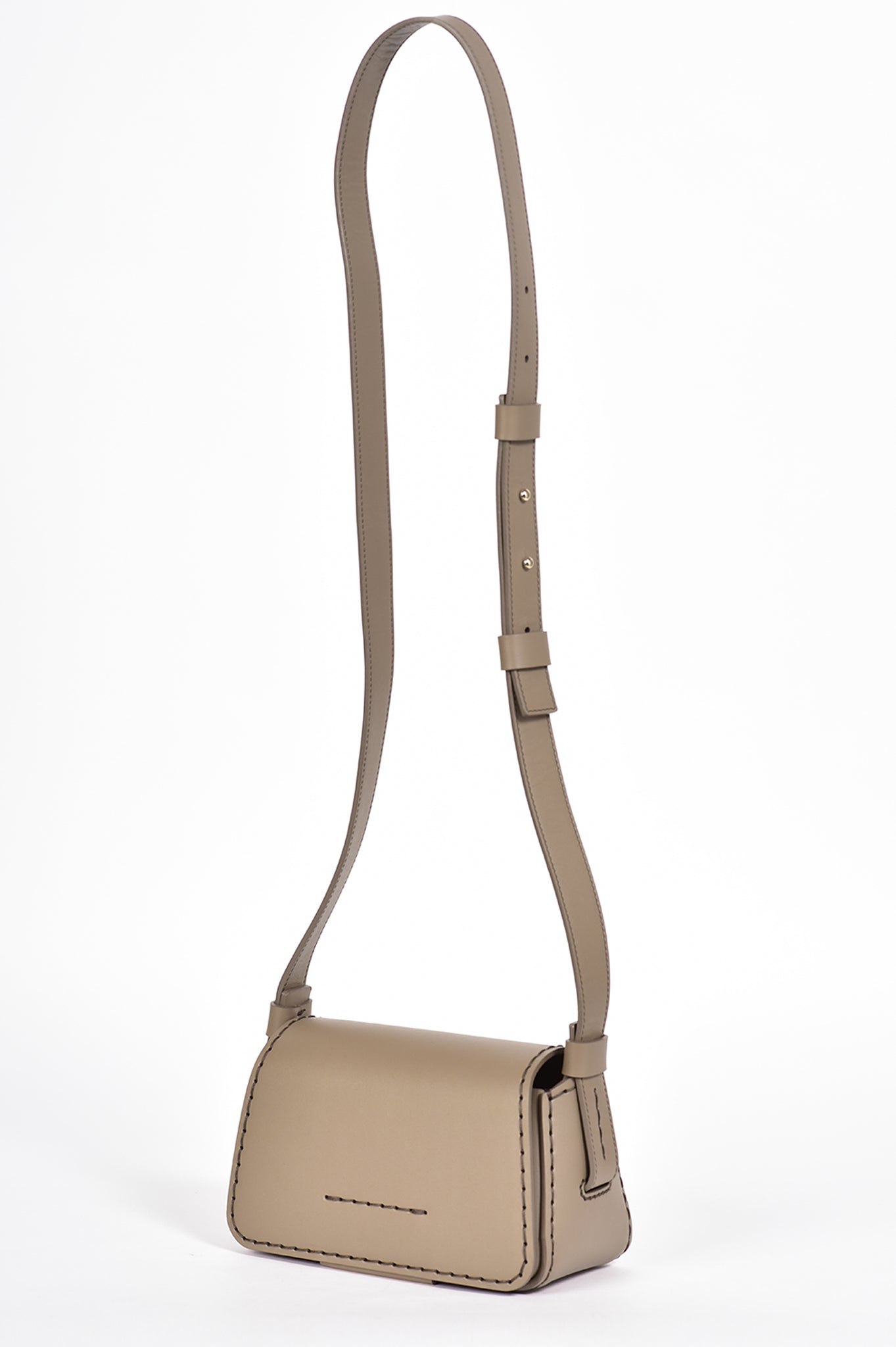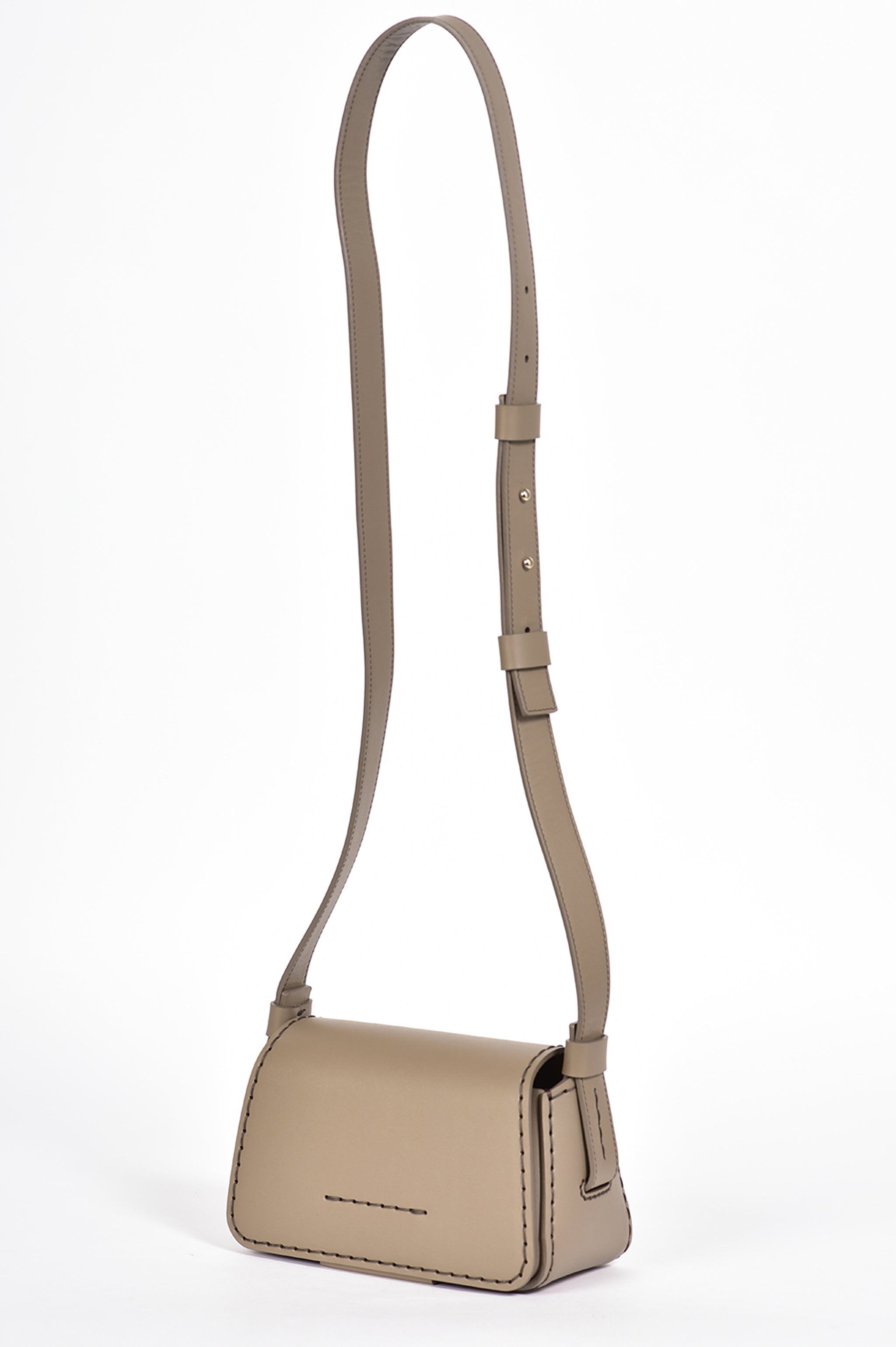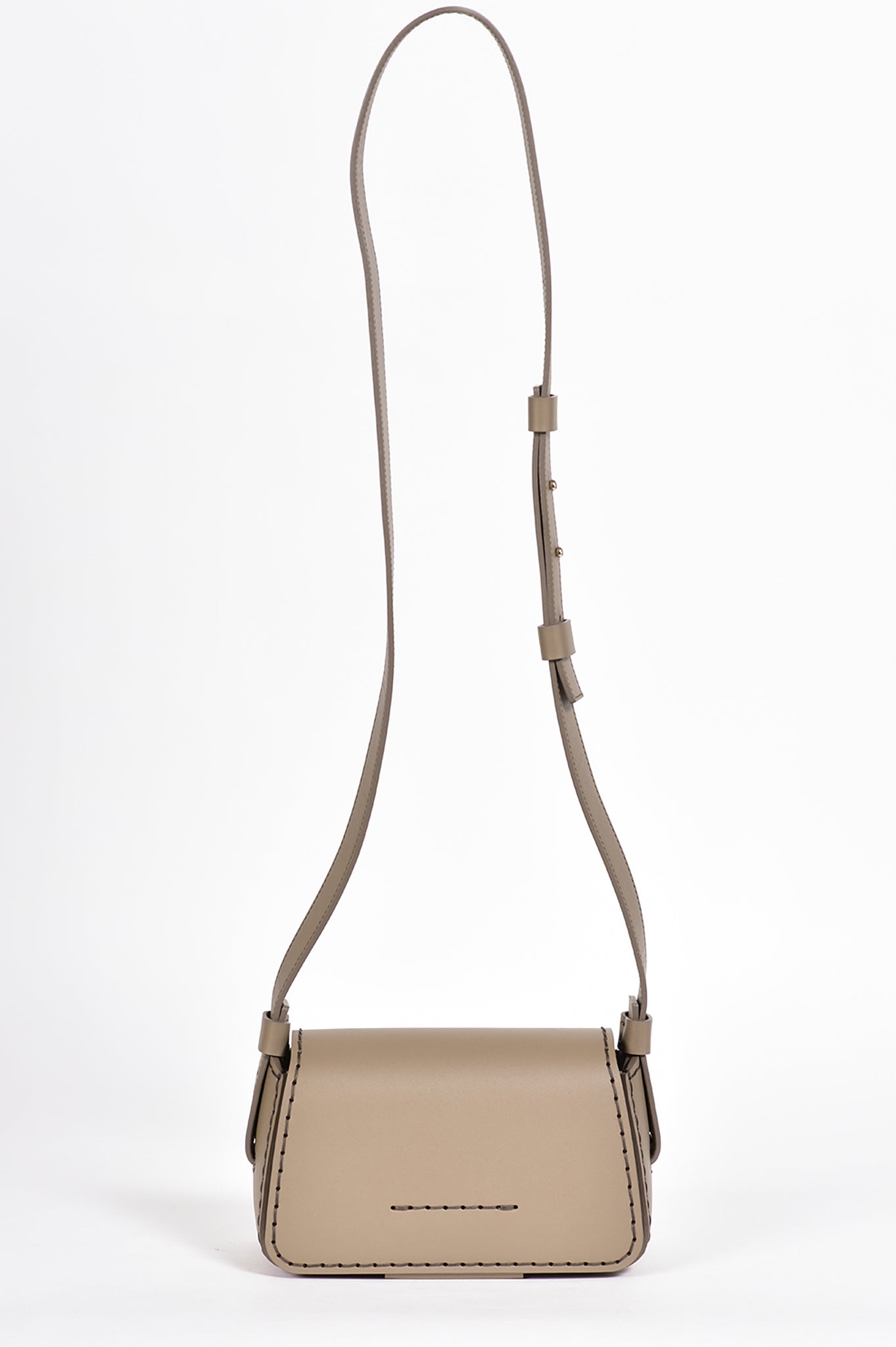 Small flap bag crafted from soft cowhide leather. Despite its compact size, it's surprisingly spacious, providing enough room for glasses, keys, wallet, and other essentials. The flap features a lining of curry-colored, textured leather.