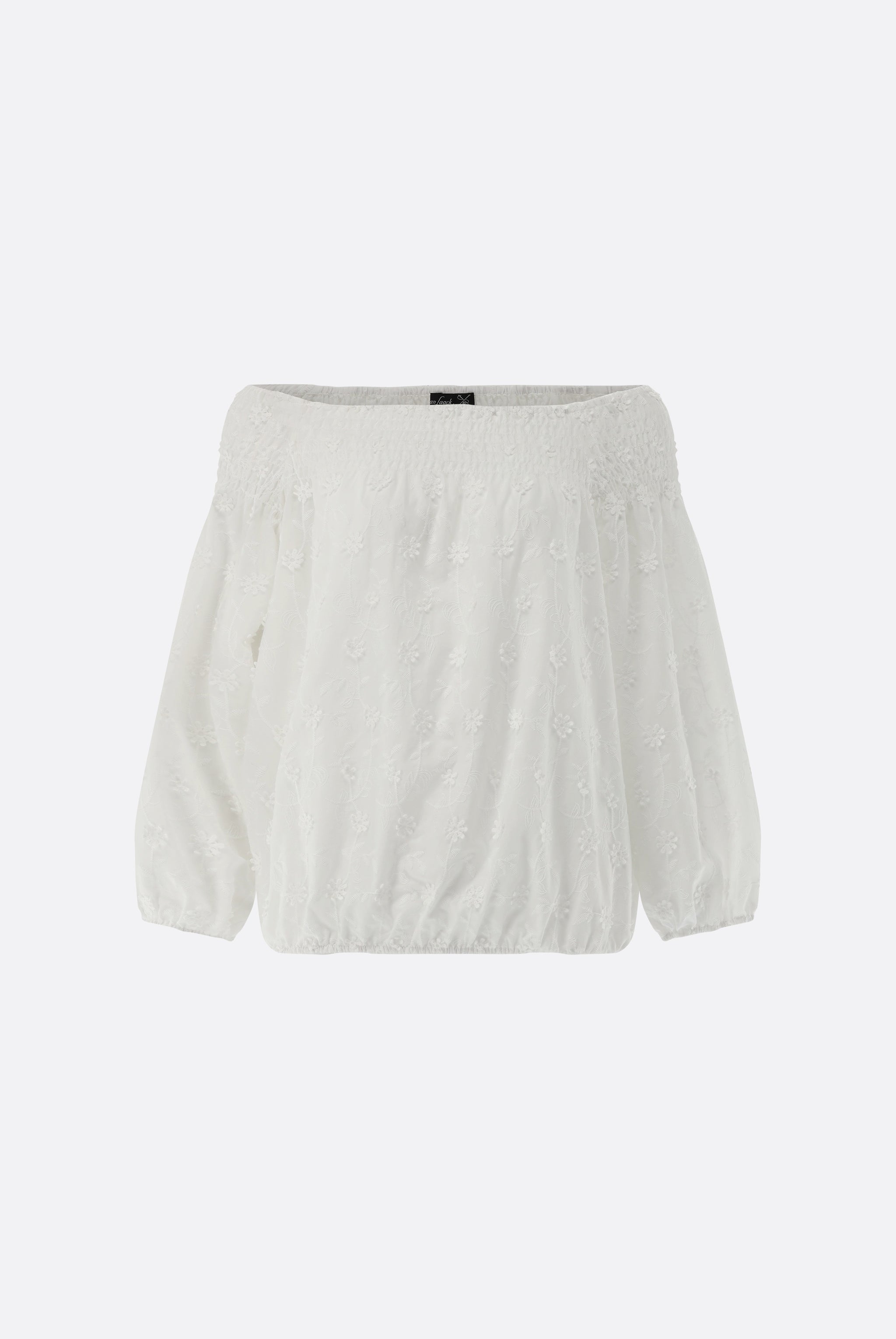 This off-the-shoulder Carmen blouse, crafted from high-quality cotton batiste, features delicate floral embroidery with 3D blossoms. The elasticated neckline allows for a flexible fit, making it suitable for both off-the-shoulder and classic blouse styles. With its 7/8 sleeves, also finished with elasticated cuffs, and elasticated hem, this blouse offers a perfect fit and comfortable wear. Ideal for casual summer looks or stylish summer parties.