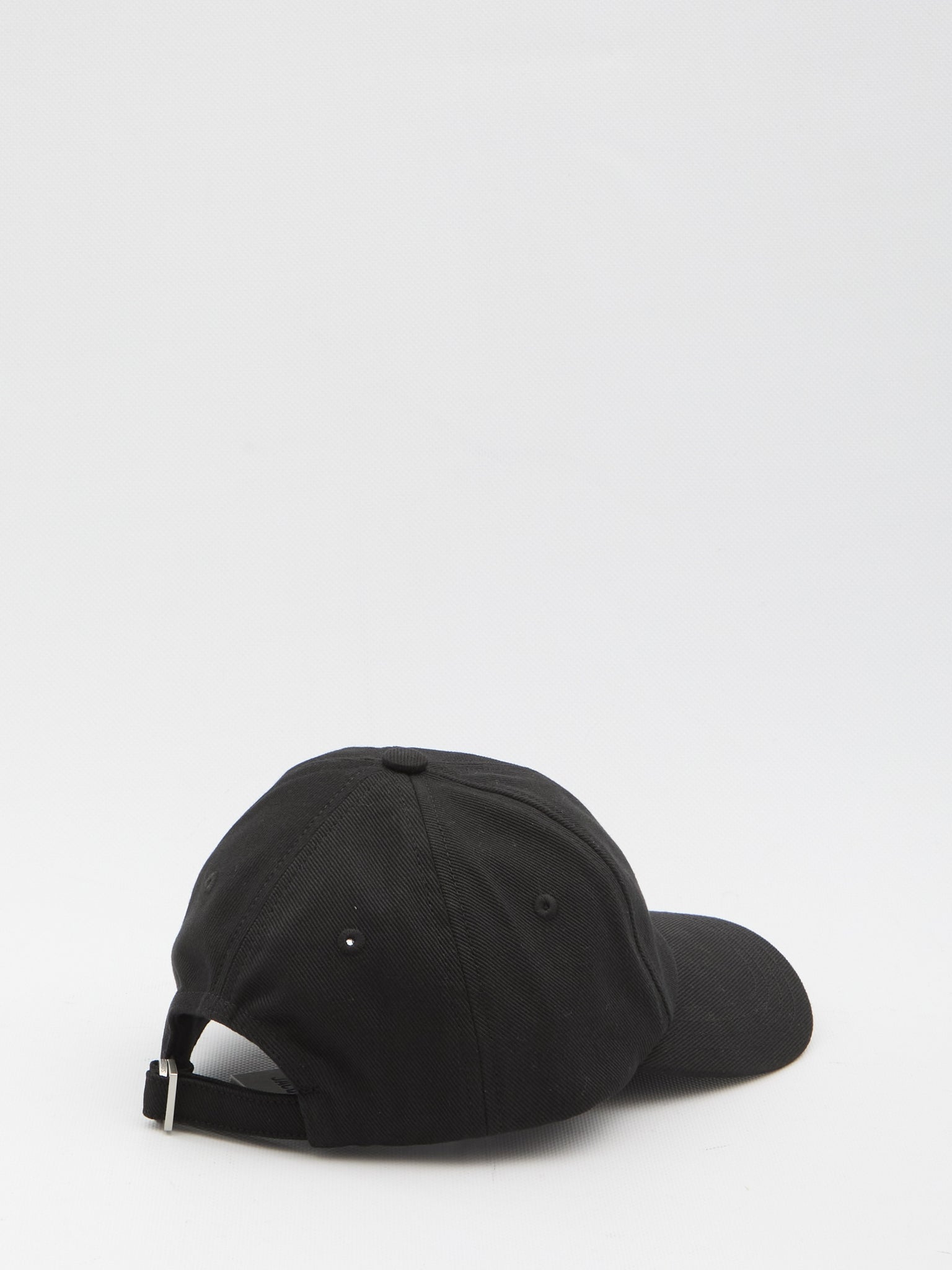 Black cotton canvas baseball cap. It features a visor with stitching, a silver-tone metal logo applied at the front, and an adjustable strap at the back with round and square buckles.