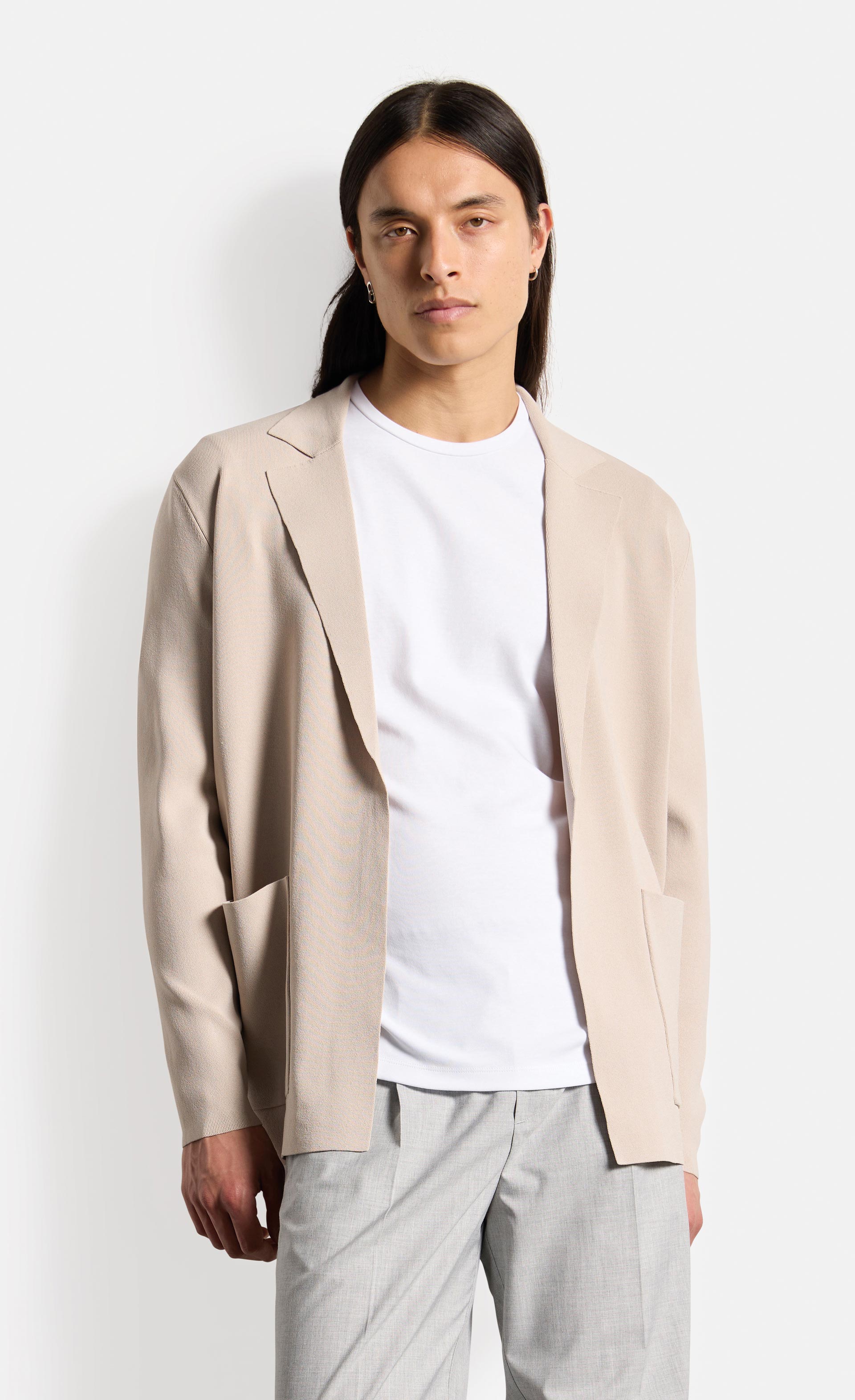 Durch die glatte Abstrickung mit technischem Garn wurde diesem Style ein cleaner und reduzierter Look verliehen, der durch das knopflose Design des Vorderteils zusätzlich betont wird.