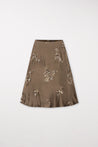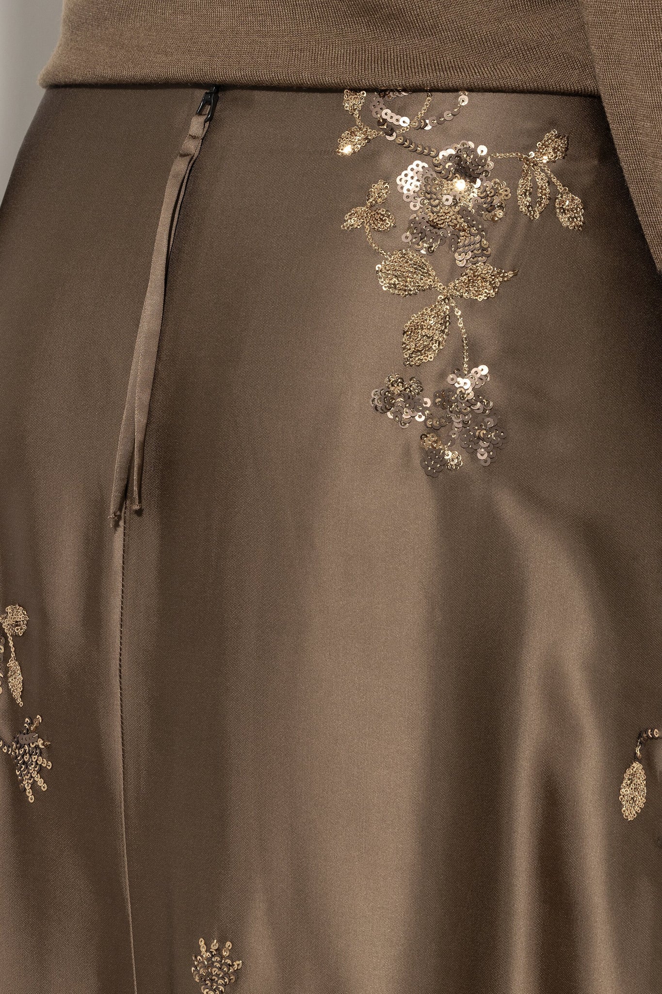 Long, flared skirt with a back zipper. The elegantly shimmering viscose satin is embroidered with a floral pattern of sparkling sequins.