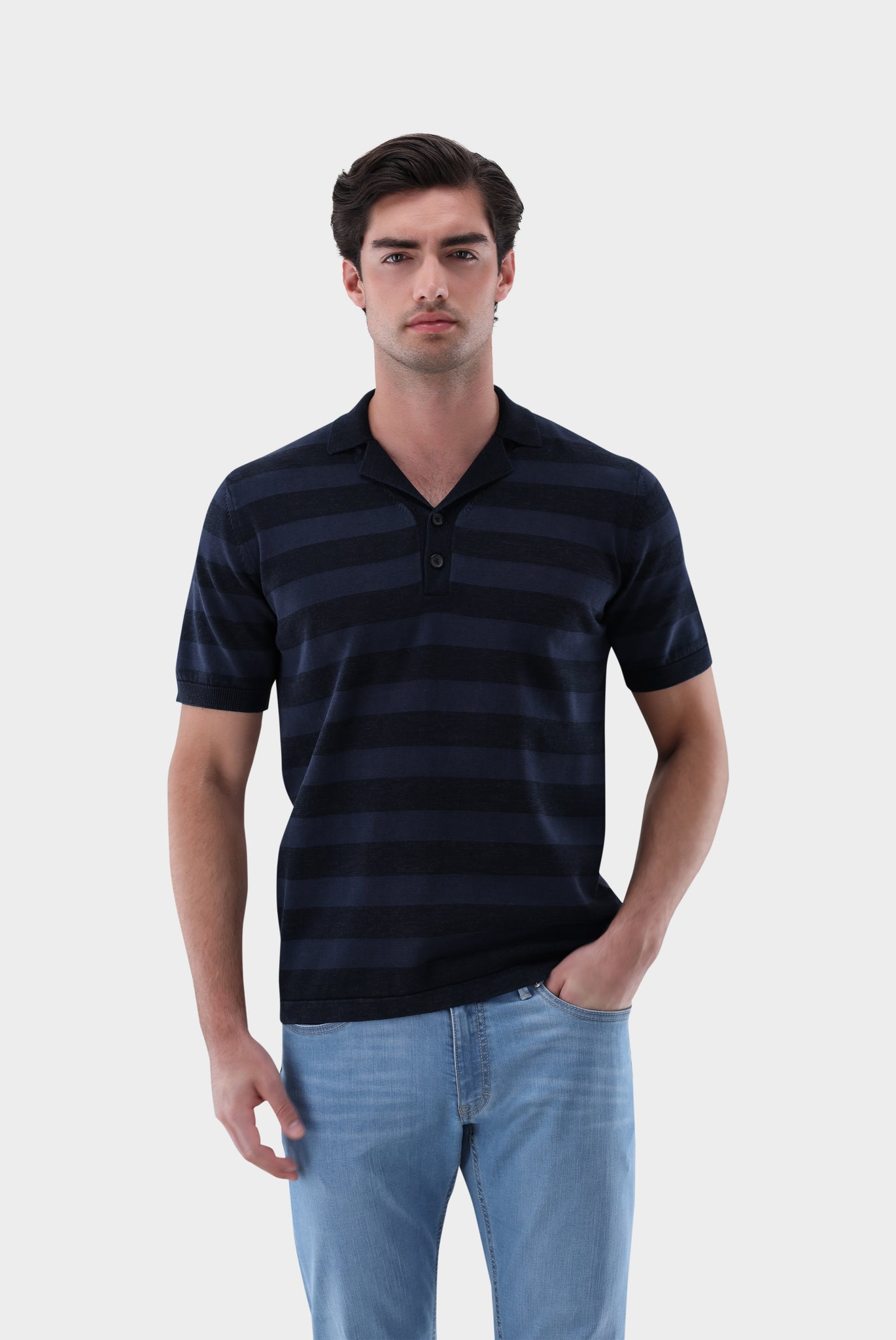 Made from a high-quality cotton and linen blend, this knit polo shirt offers an exceptionally soft and breathable feel. The button placket and notched lapel give this shirt a distinctive look. It's ideal for pairing with a casual summer outfit and embodies the current vintage retro trend.
