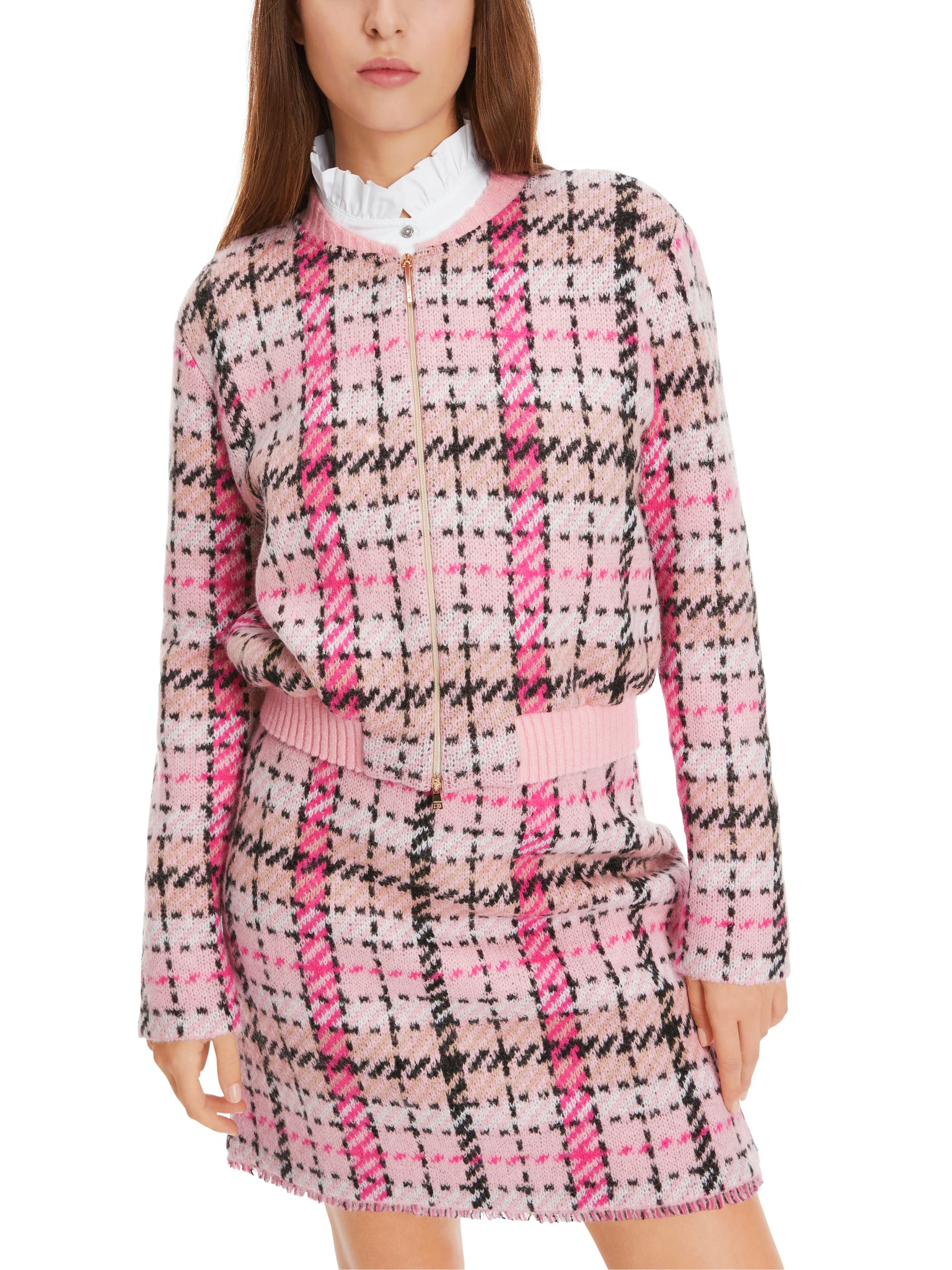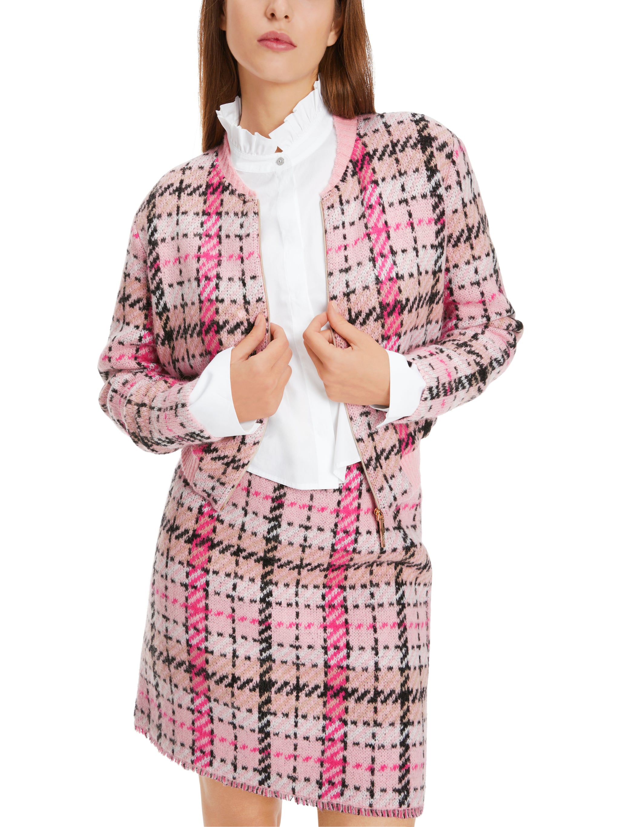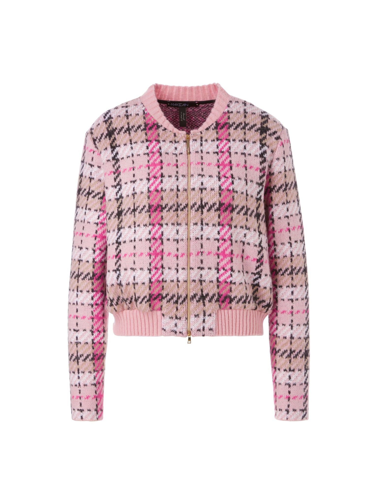 A blouson-style cardigan with a college collar. The sleeves are relatively narrow and have a raw hem. Made from a wool-based knit, this cardigan features a beautiful jacquard design. It's ideal for adding a fresh touch to your wardrobe. Knitted in Germany, this cardigan is crafted using state-of-the-art technology and finished in Germany. The individual pieces—such as the back and front—are sewn together in partner factories across Europe.