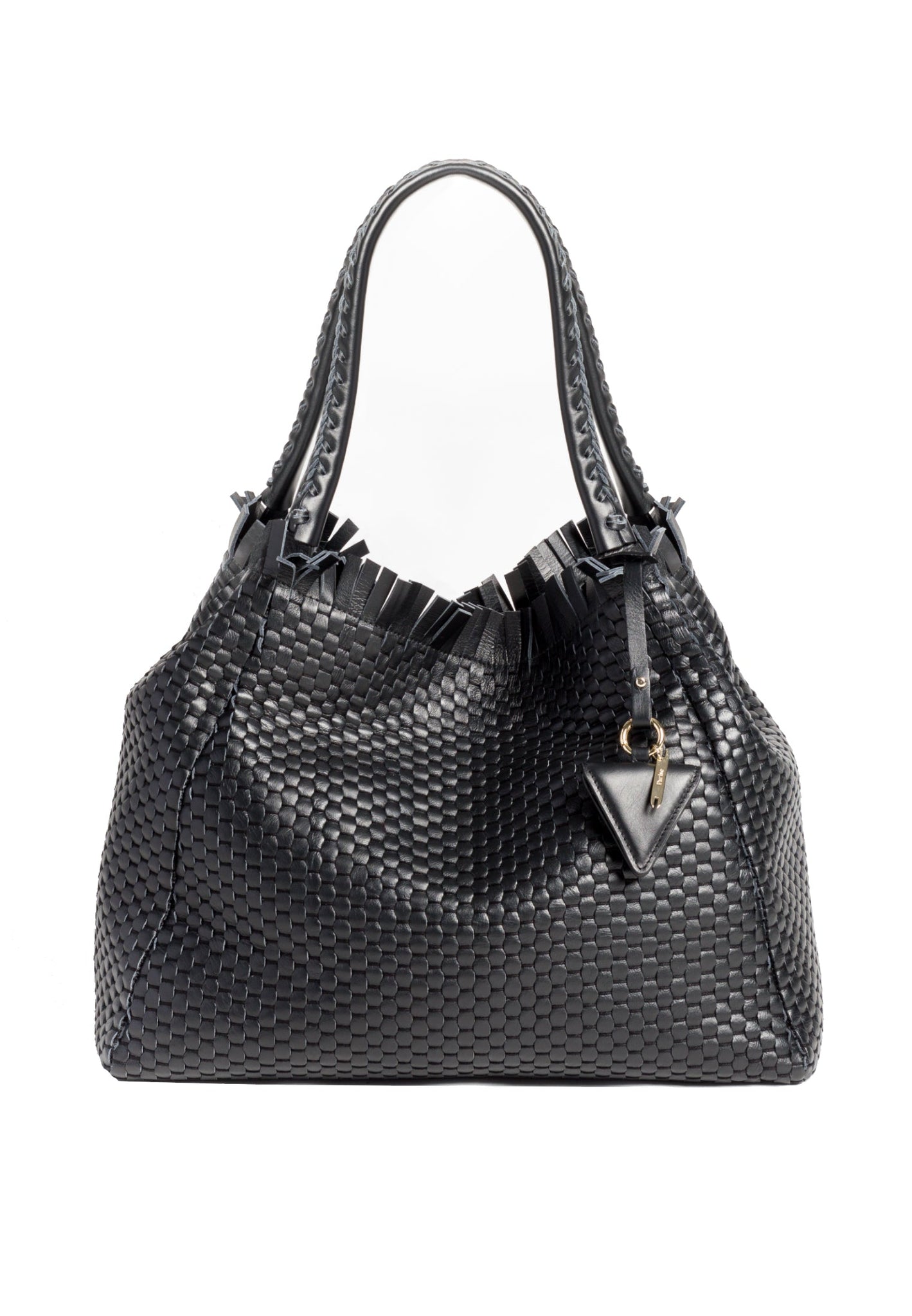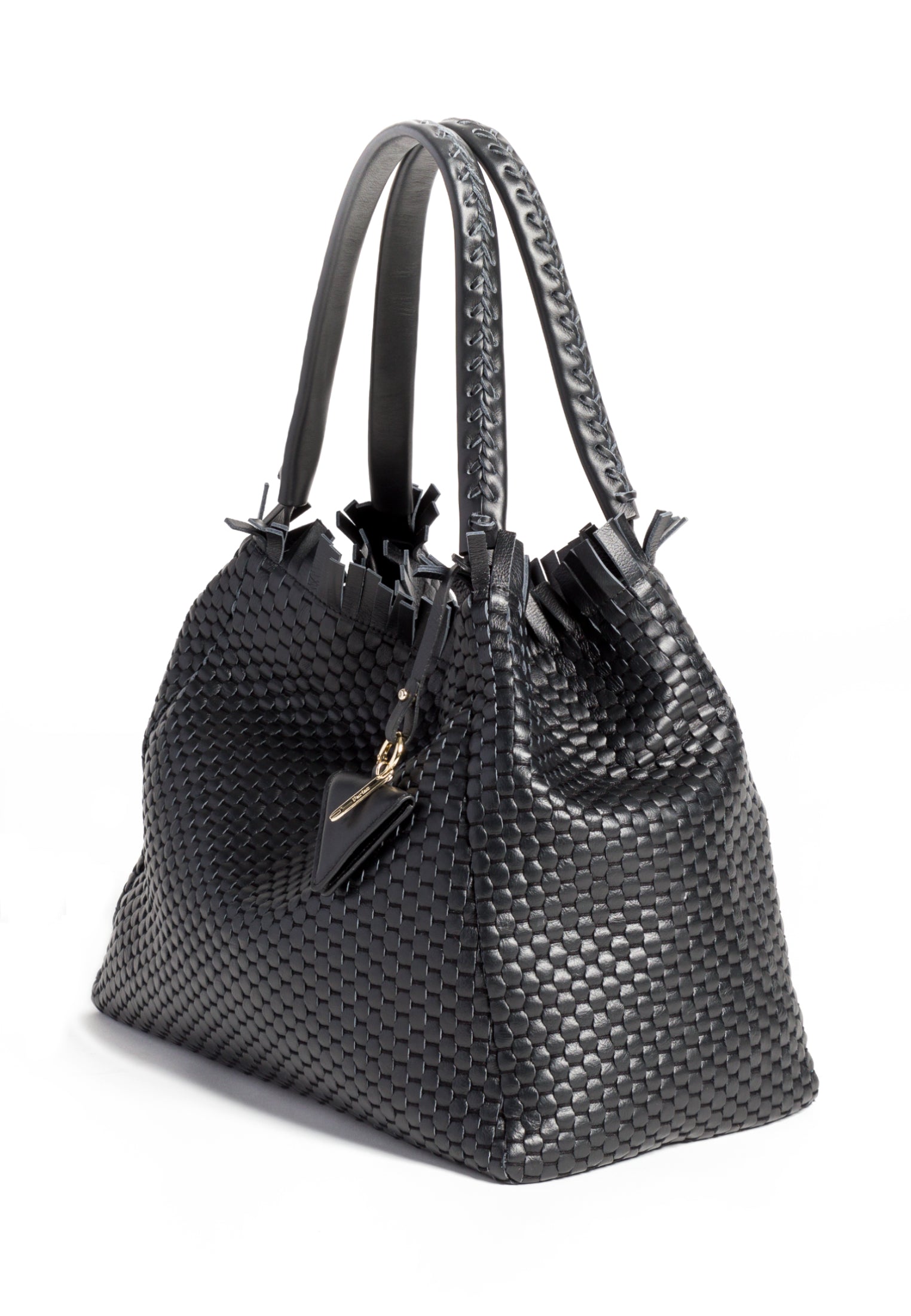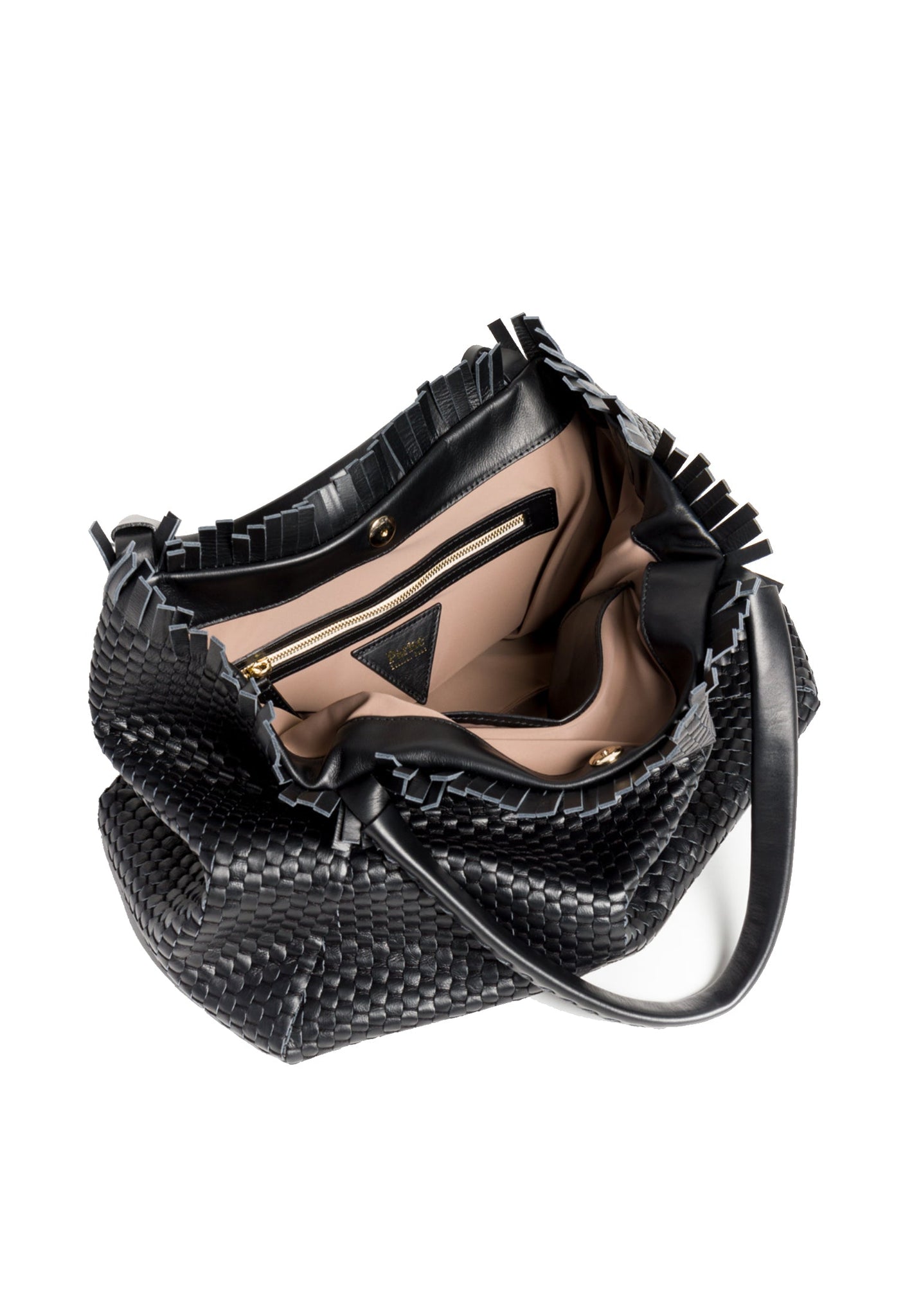 - Signature fringe for a refined, distinctive touch - Double leather handles that fit easily over coats - Magnetic closure for secure and easy access - Internal zipped pocket and two leather compartments to organize your essentials. - White gold colored hardware - Soft and durable 100% cotton lining - Exclusive signature Parise pendant included - Protective dust bag included for lasting beauty Made in Italy - Premium 100% bovine leather woven with 100% cotton yarn on 18th century treadle looms