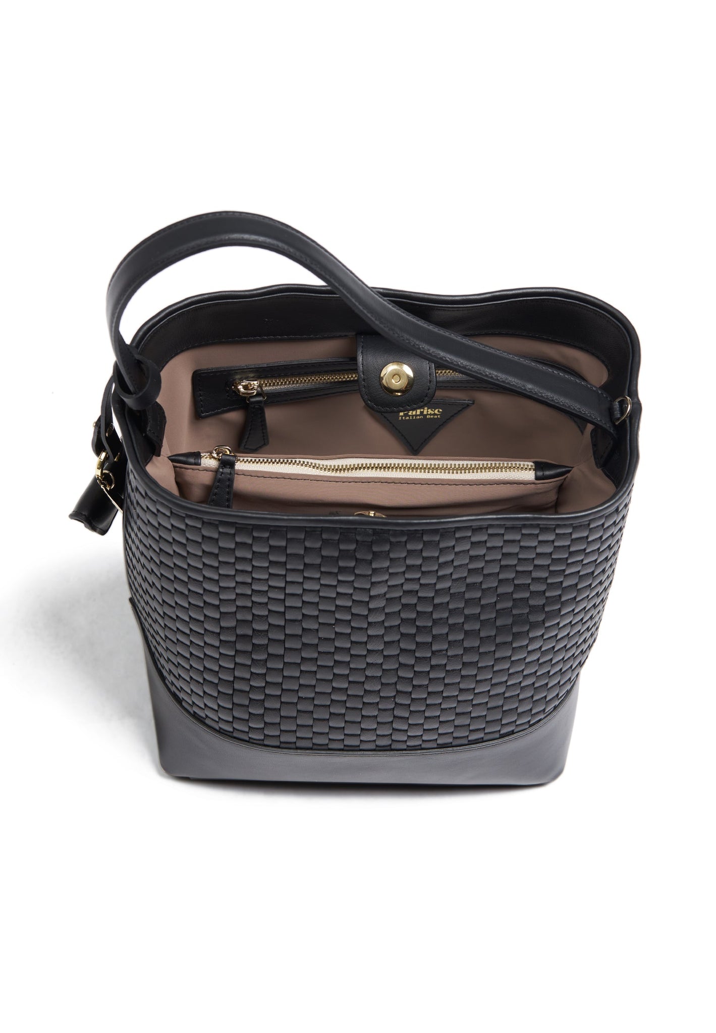 - Single handle that fits easily over coats - Magnetic closure for easy access - Large central zip pocket for securing your most precious things - Adjustable and detachable shoulder strap for exceptional comfort - Internal zipped pocket and two leather compartments to organize your essentials - White gold colored hardware - Soft and durable 100% cotton lining - Exclusive signature Parise pendant available (not included, representative image only) - Protective dust bag included for lasting beauty Made in Italy - Premium 100% bovine leather woven with 100% cotton yarn on 18th century treadle looms