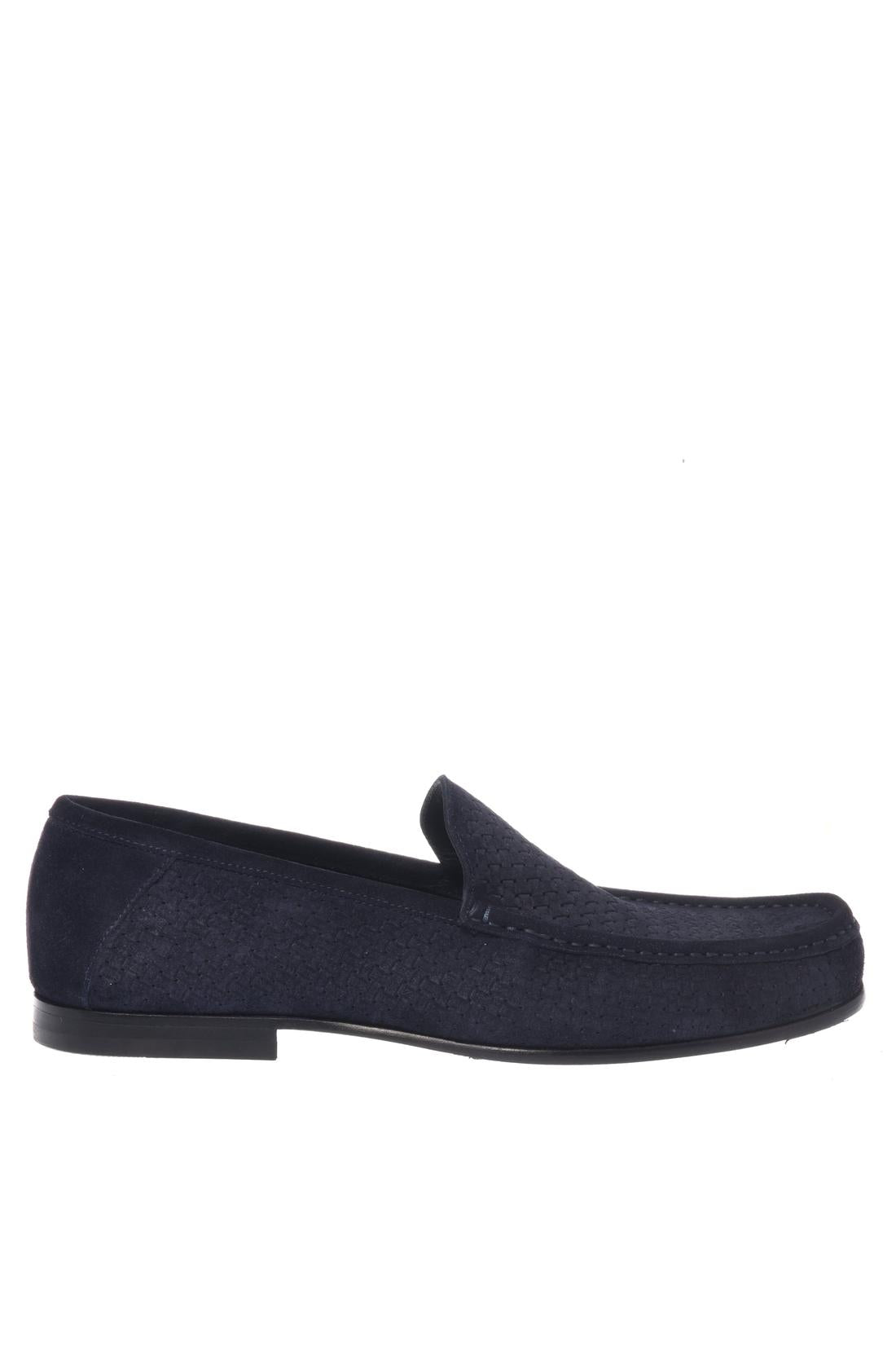 Blue suede woven print loafer