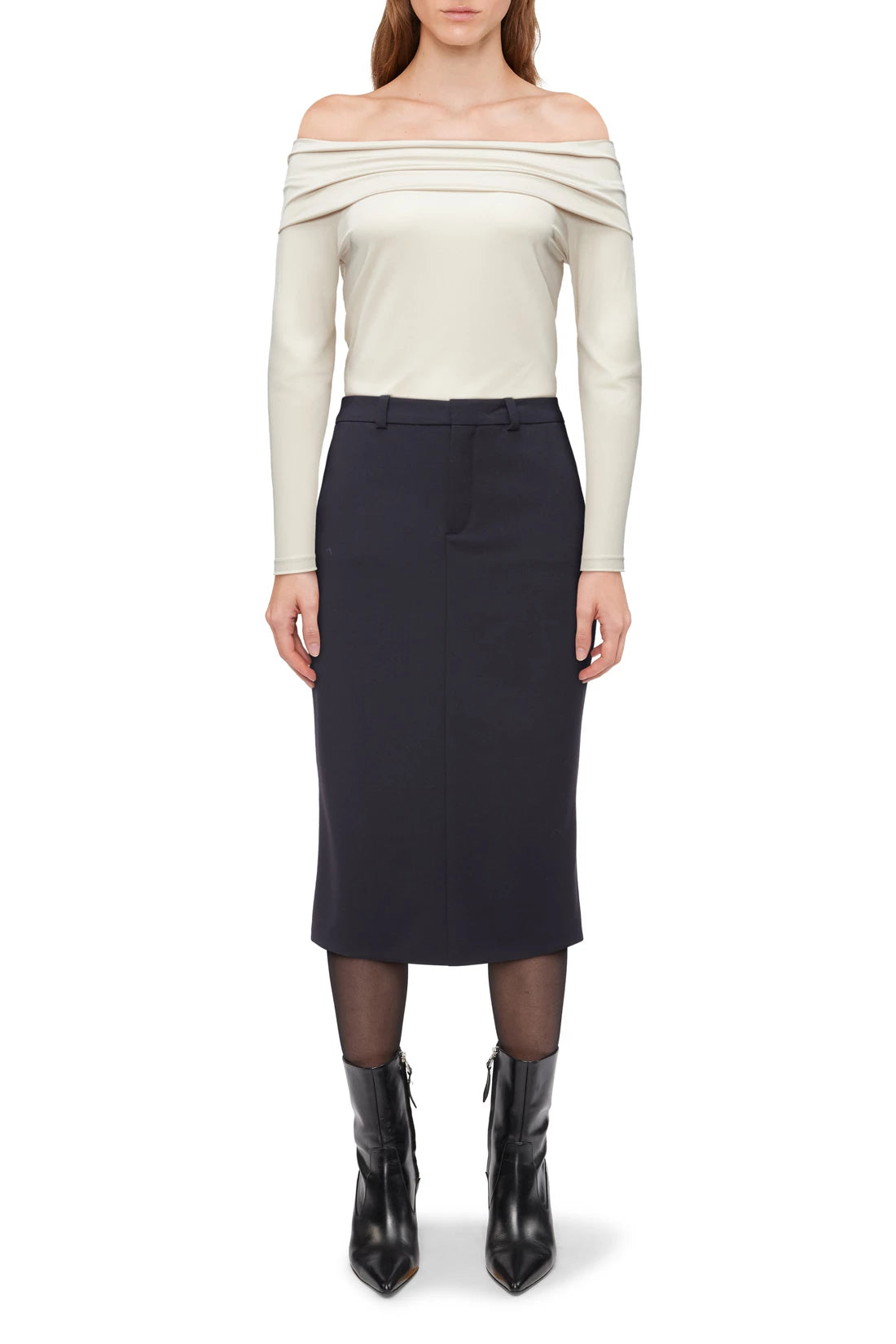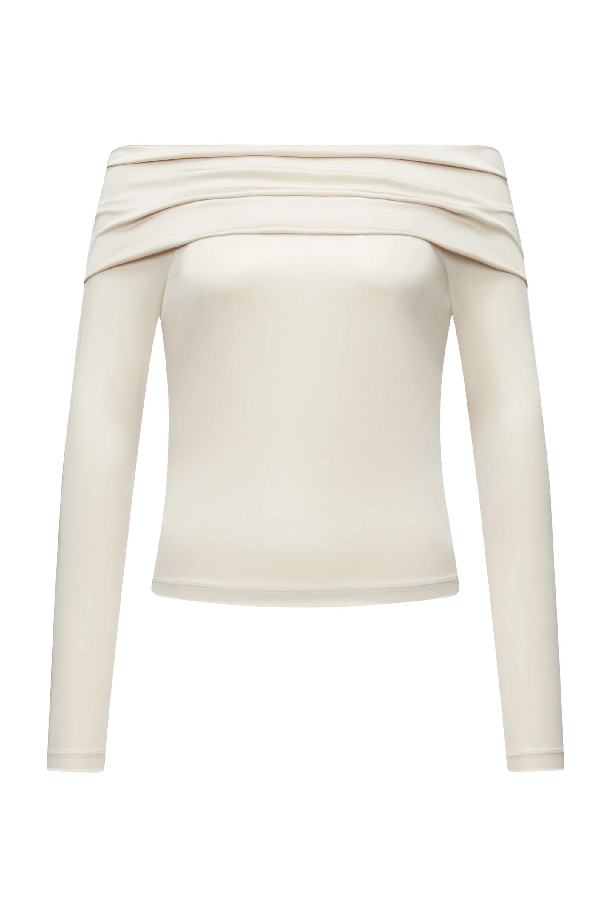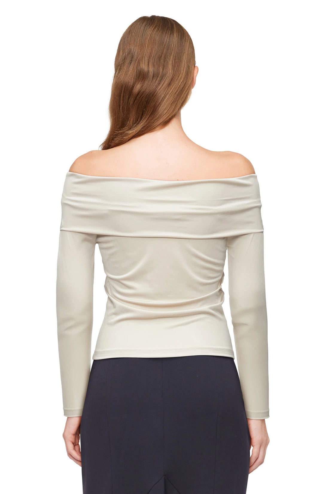 ARAYA is an off-the-shoulder long-sleeved top with a body-hugging fit. The shiny jersey offers a glamorous look.