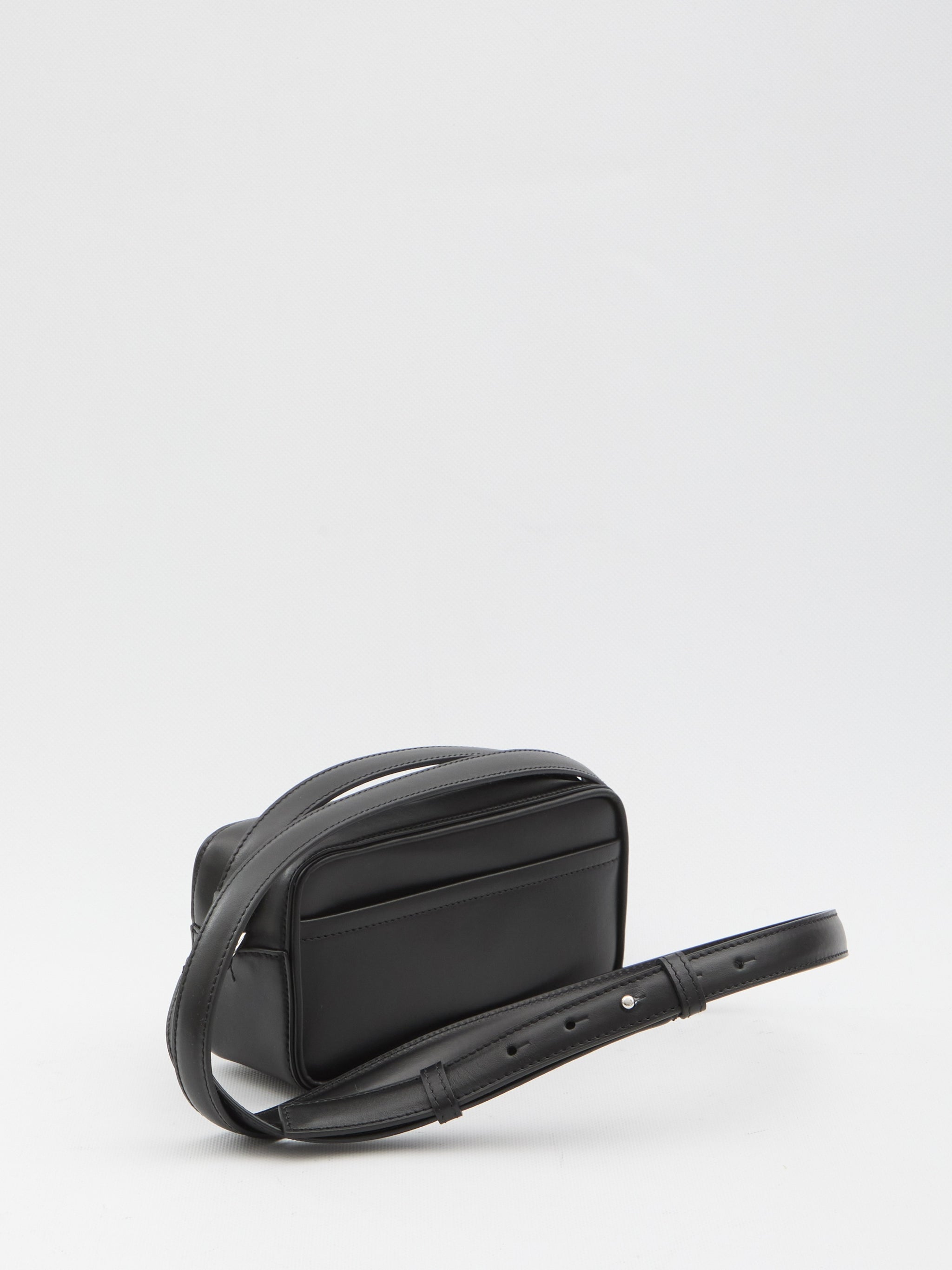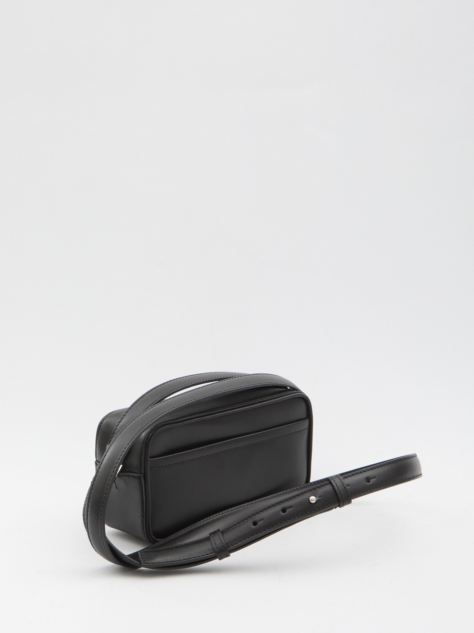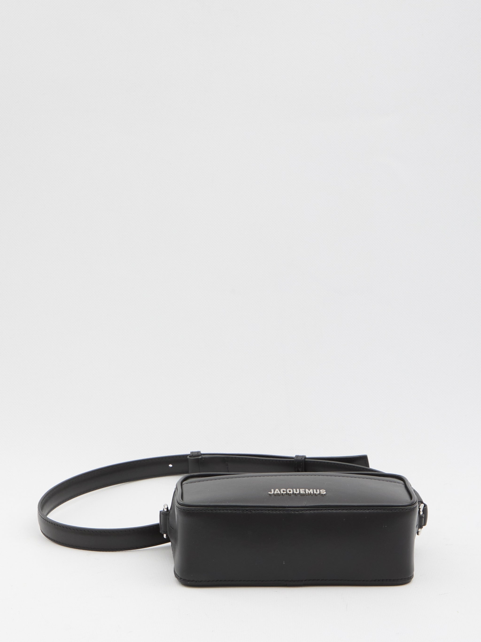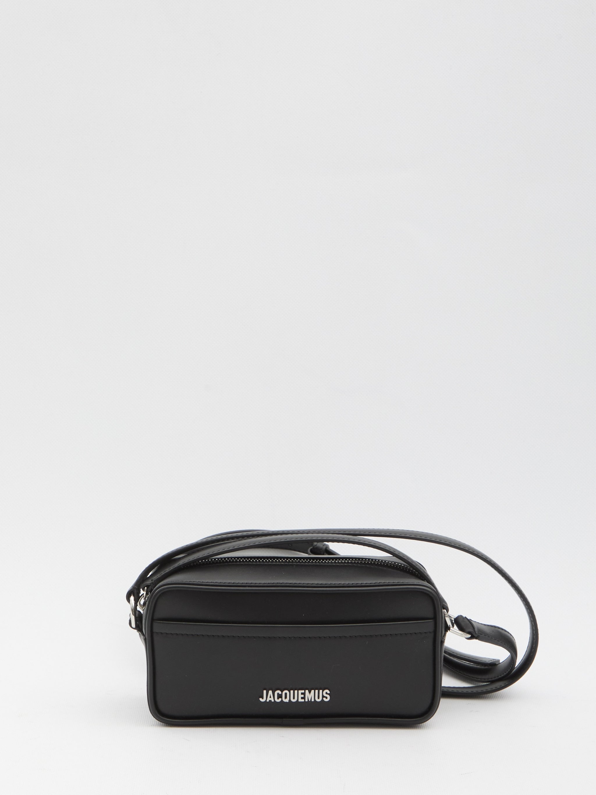 Rectangular black smooth leather bag. It features an adjustable shoulder strap, a handle with a zipper for carrying the bag by hand, a flat front pocket with the Jacquemus signature in silver-tone metal, and a flat back pocket. It has a zip closure, one main compartment, an internal leather flat pocket, and a cotton lining. Dust bag included. Any imperfections in the leather should not be considered manufacturing defects, but rather a characteristic of the material.