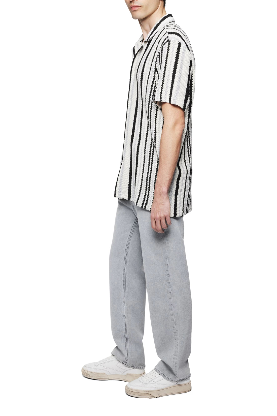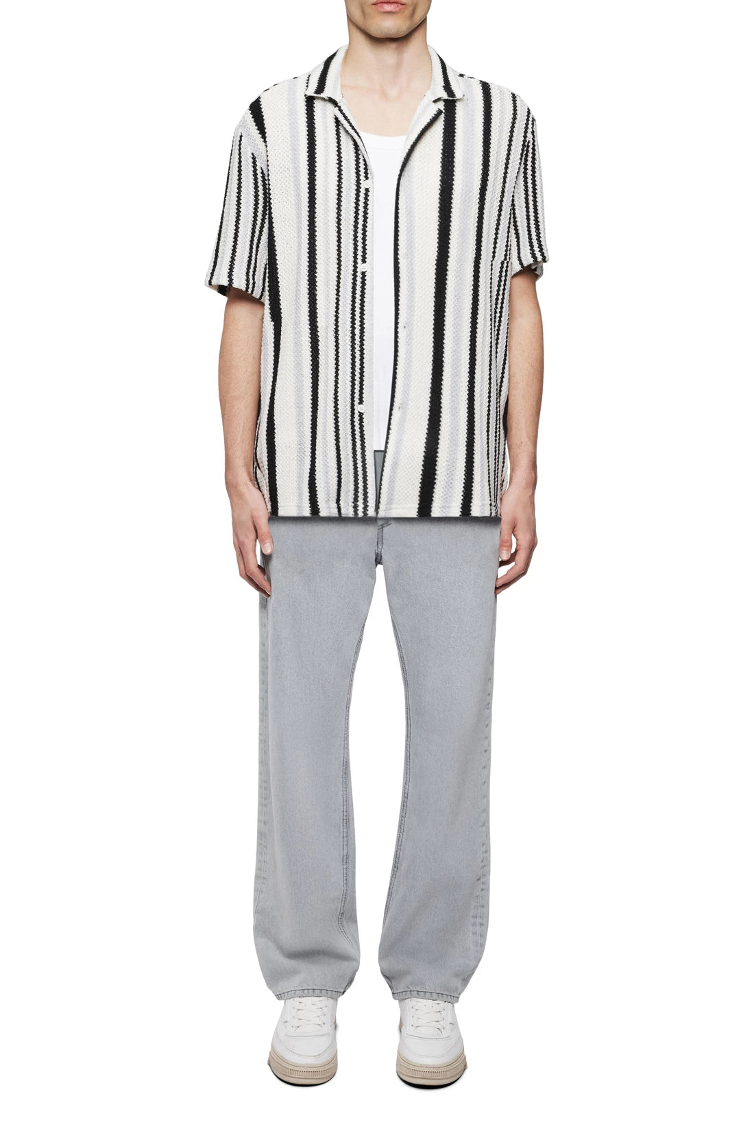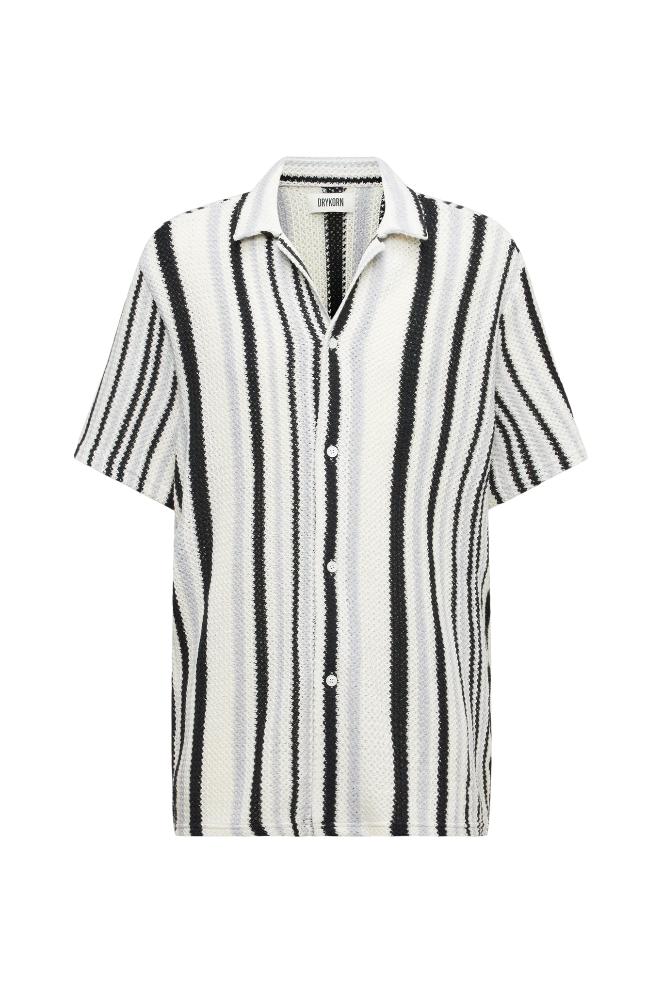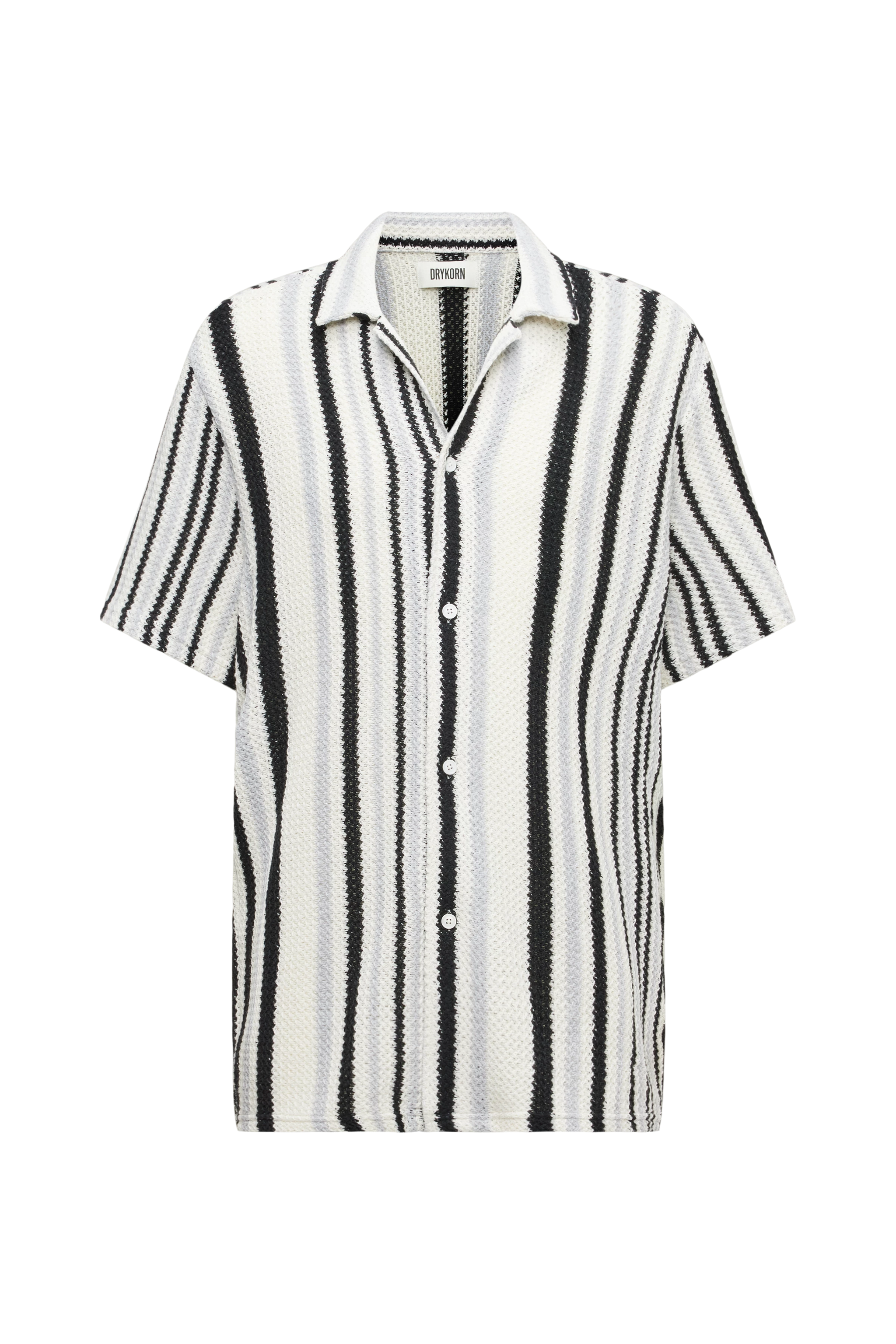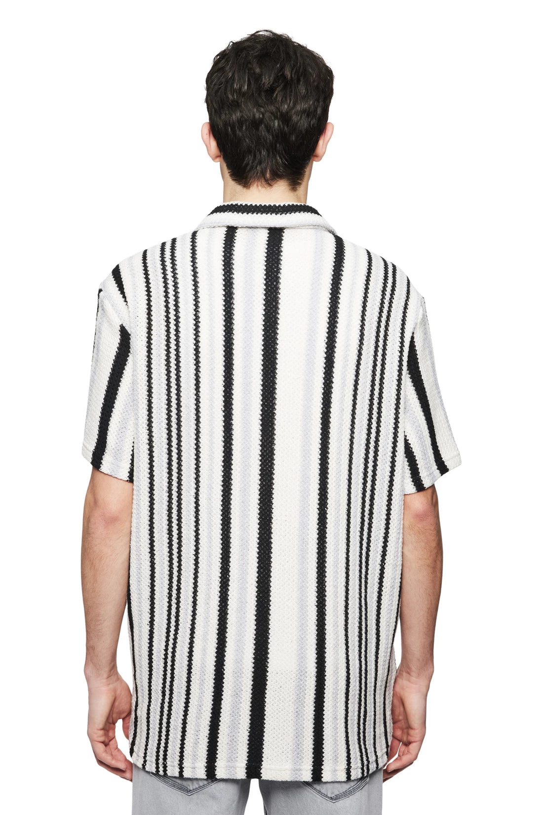 BIJAN_2 is a casual short-sleeved shirt with a Cuban collar in a relaxed fit. It has a clean button placket without a seam and a straight hem that is longer at the back than at the front. The open knit structure with block stripes is light and comfortable to wear due to its texture.
