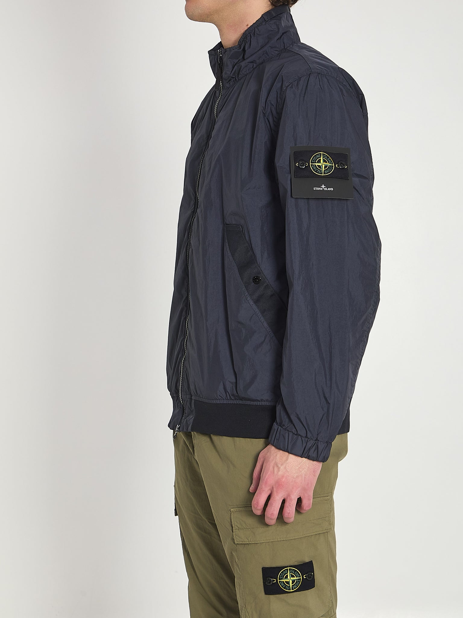 Navy blue lightweight nylon jacket. It features an internal ribbed collar, a zip front closure, two front button pockets, long sleeves, elastic cuffs, an iconic applied badge on the sleeve, a ribbed hem, and a nylon lining. Regular fit.