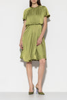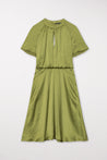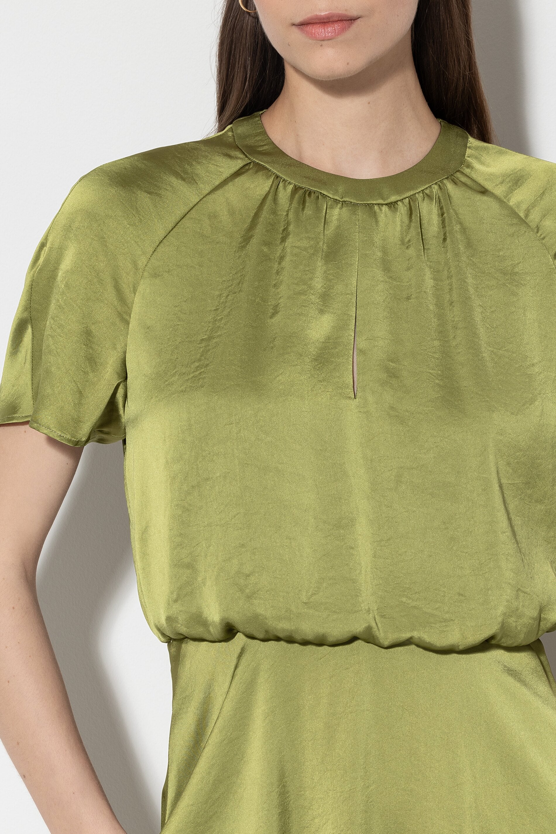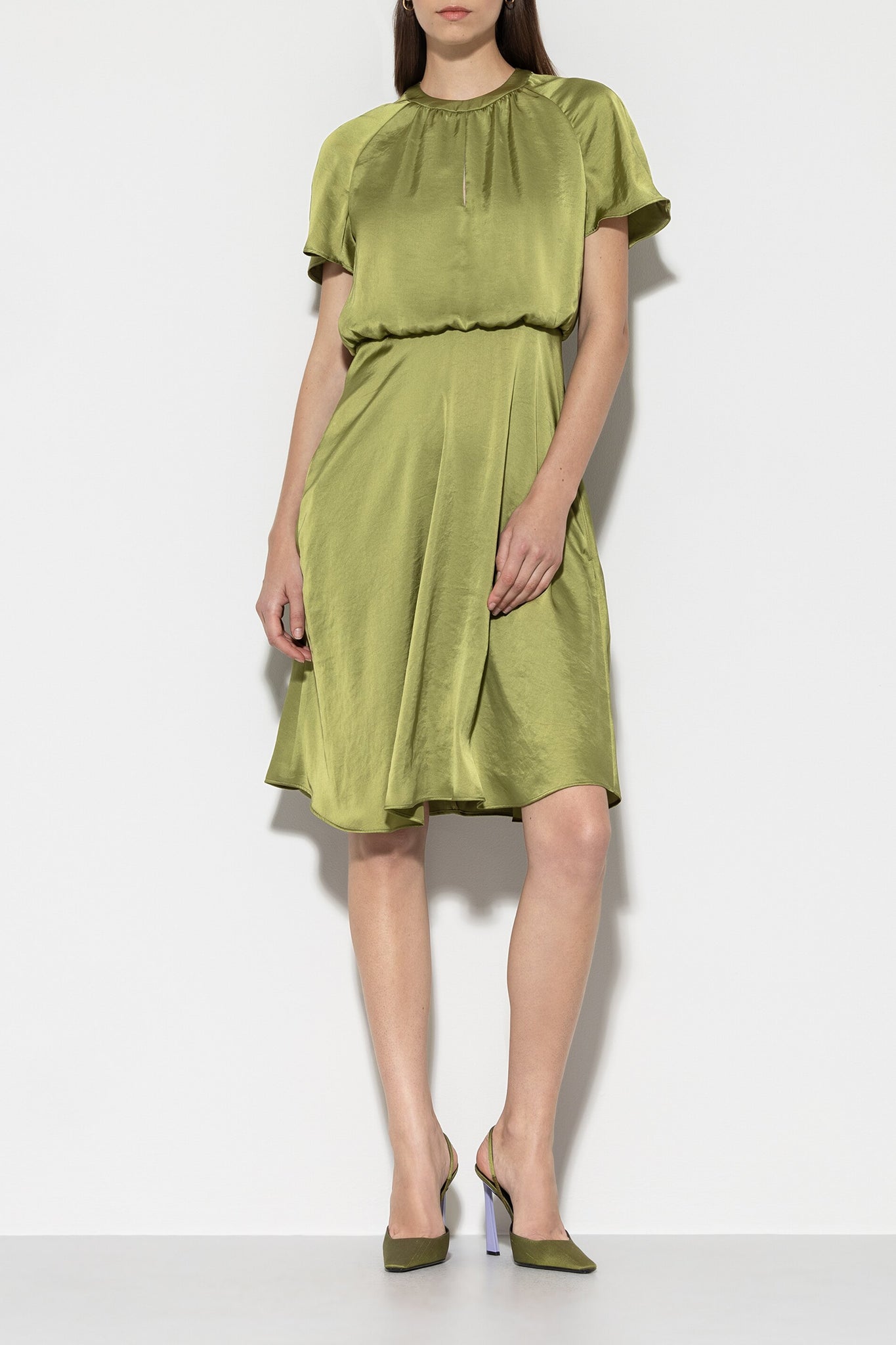 Kurzes Kleid aus schwerer, fließender Techno-Seide mit edlem Glanz. Das feminine Design wird von charmanten Raffungen am Ausschnitt und kurzen Raglanärmeln komplettiert.