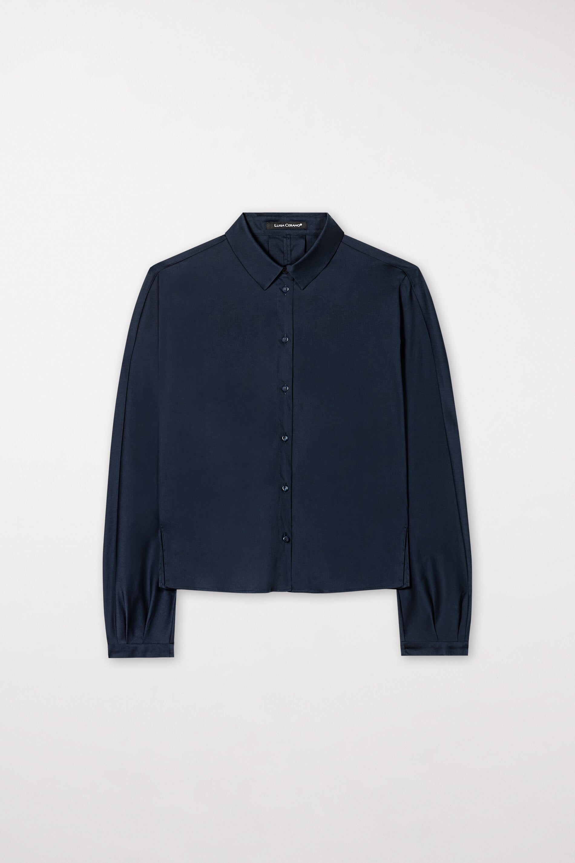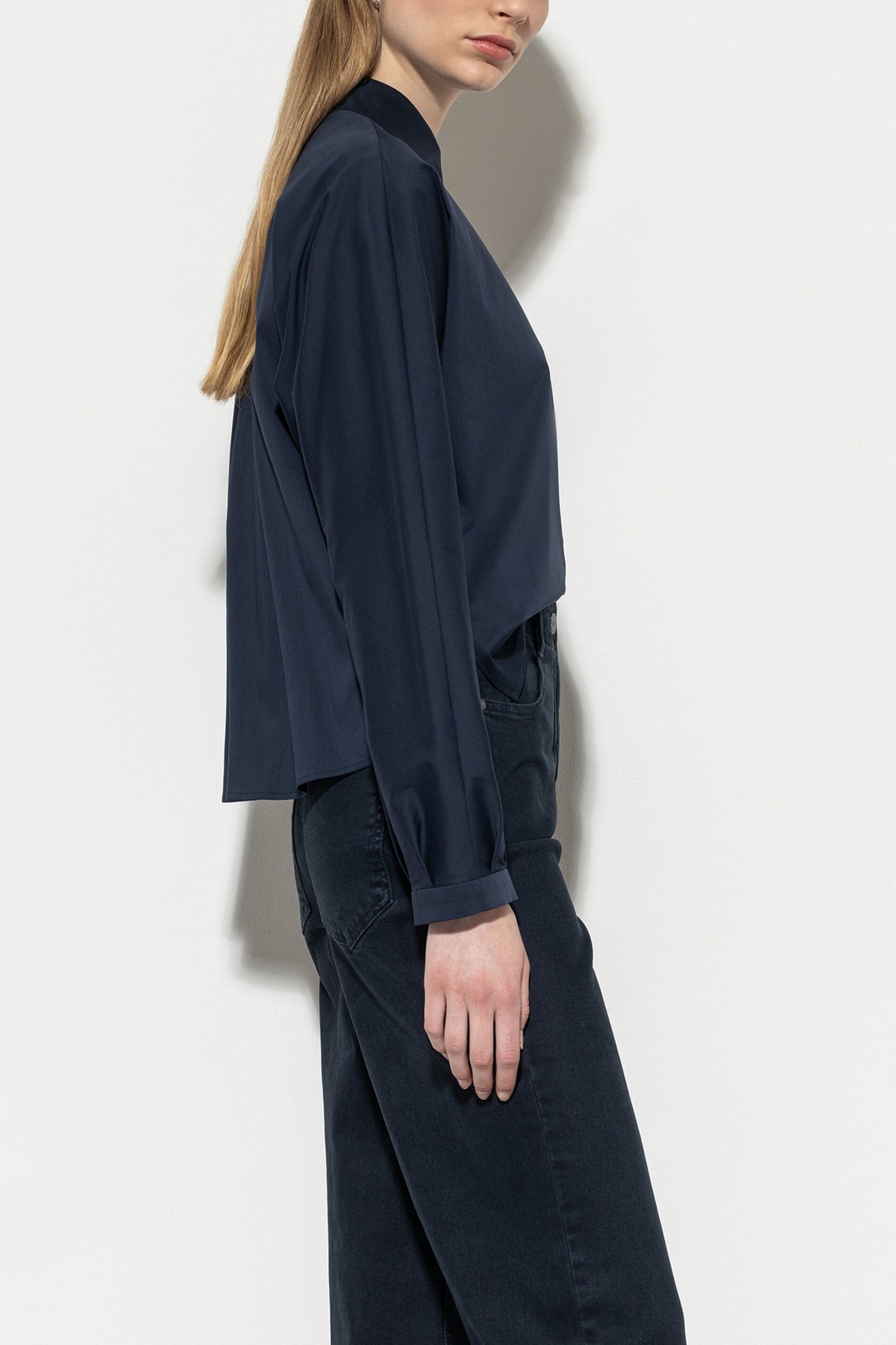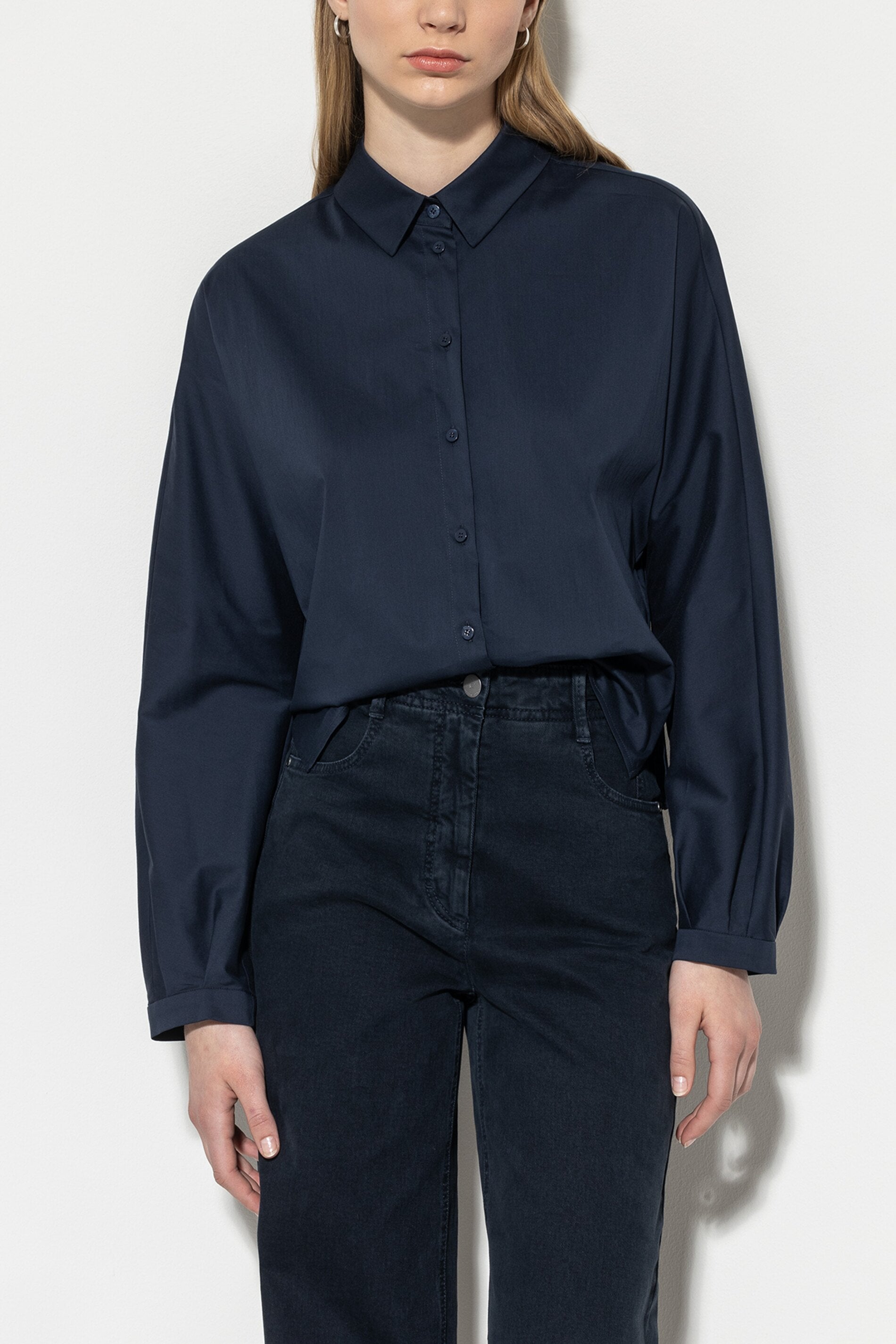Hemdbluse aus elastischer Baumwollmischung in etwas weiterer Passform mit überschnittenen Schultern und Faltendetails auf der Rückseite.l. Die Bluse mit seitlich geschlitztem Saum ist mit einem klassischen Hemdblusenkragen und einer Knopfleiste ausgestattet.