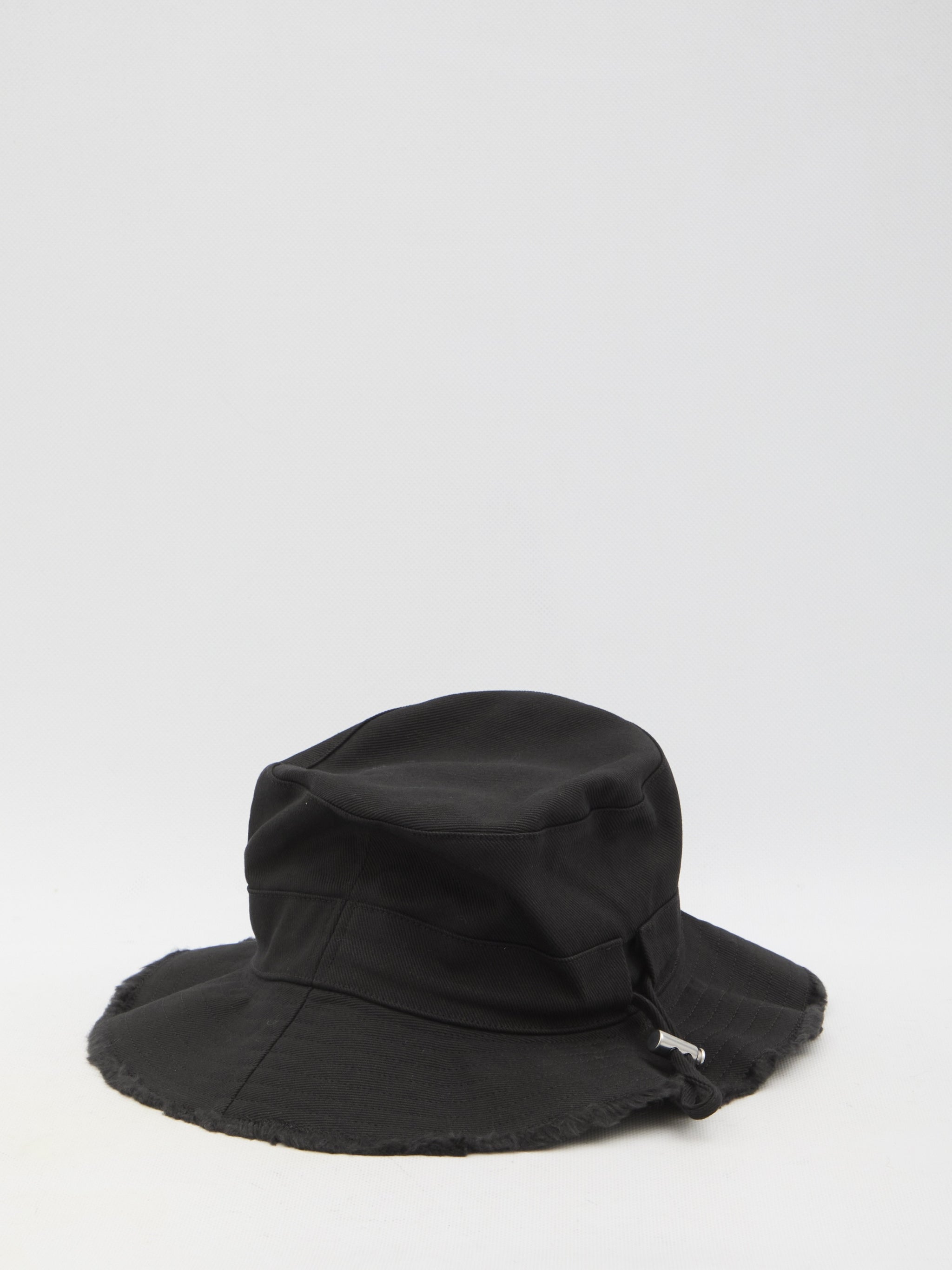Le Bob Artichaut hat in black cotton. It features a frayed-edge brim, a silver-tone metal logo on the front, and a long adjustable chin cord.