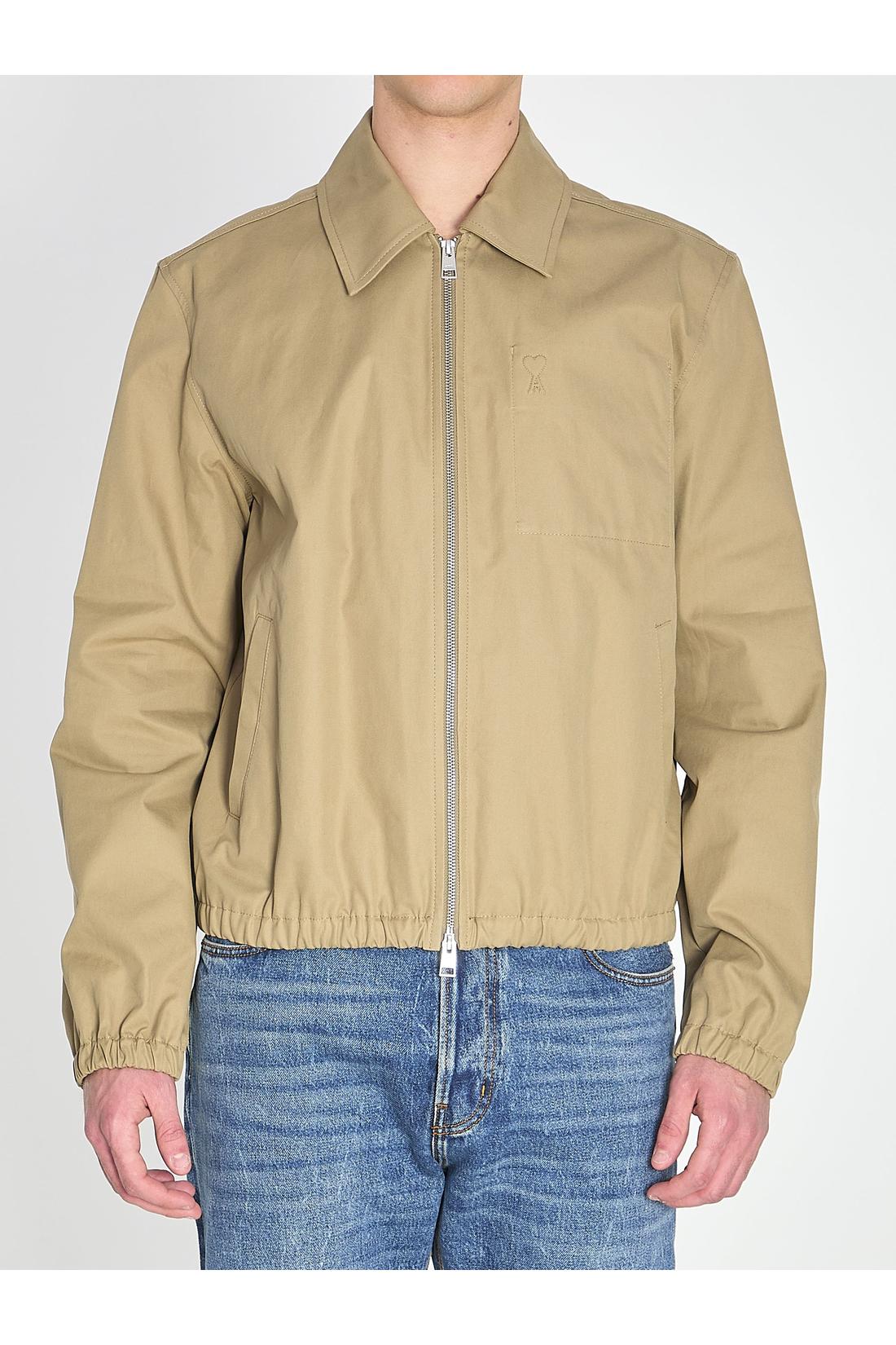 Beige cotton gabardine jacket. It features a pointed collar, zip closure at the front, two front pockets with buttons, one internal pocket, embossed Ami de Coeur logo on the chest, long sleeves, and elasticized waist and cuffs. Regular fit.