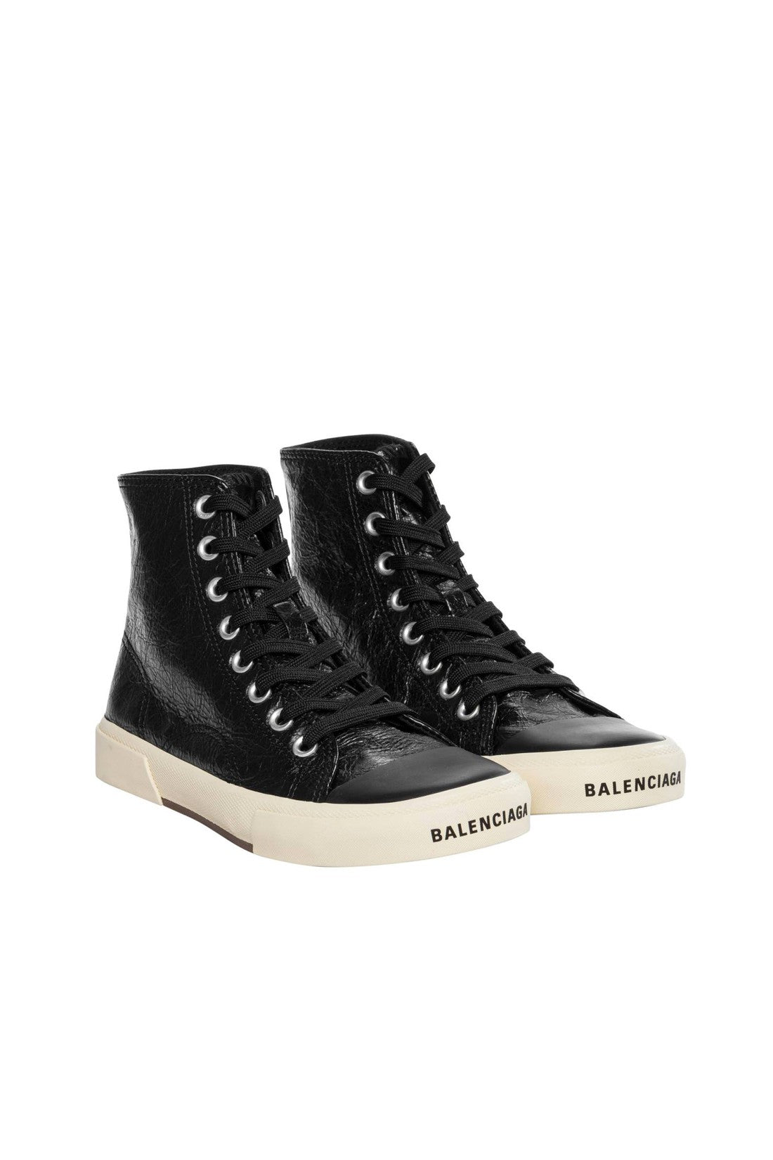 Introducing the Balenciaga Paris Leather Sneakers. Crafted with 100% calf leather, these sneakers feature a stylish black color and are designed with a canvas lining, rubber sole, rounded toe, and lace-up fastening. The contrast logo detail adds a touch of elegance. Perfect for women who want to make a statement. Upgrade your sneaker game with Balenciaga.