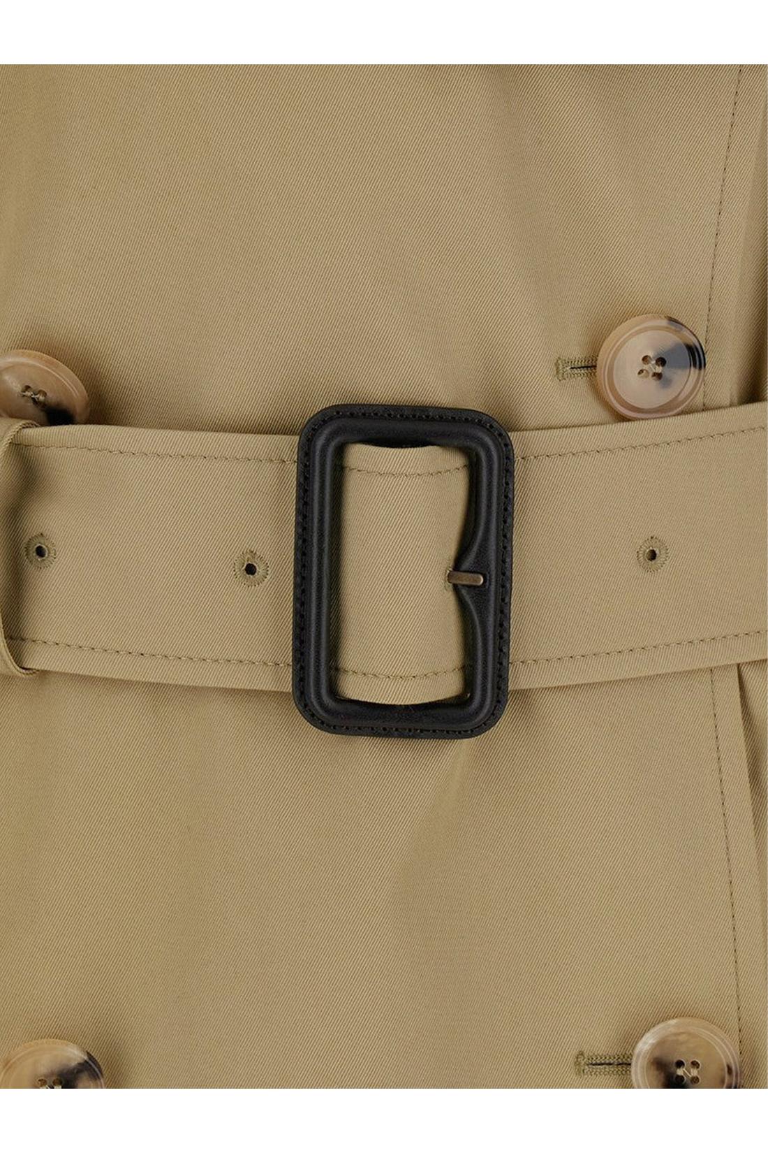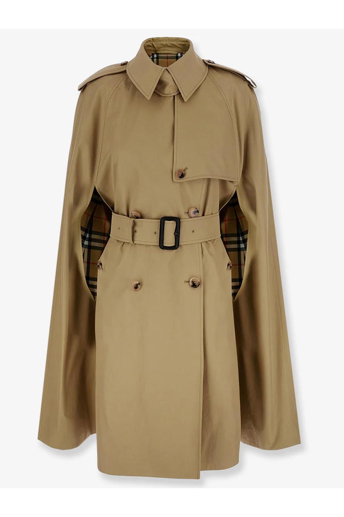 Beige waterproof cotton gabardine trench cape featuring a double-breasted button closure, hook-fastening collar, chin strap, shoulder epaulets with buttons, windproof flap, belt with a B-shaped buckle, welt pockets with side buttons, and Burberry Check lining and undercollar. Regular fit.