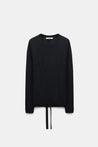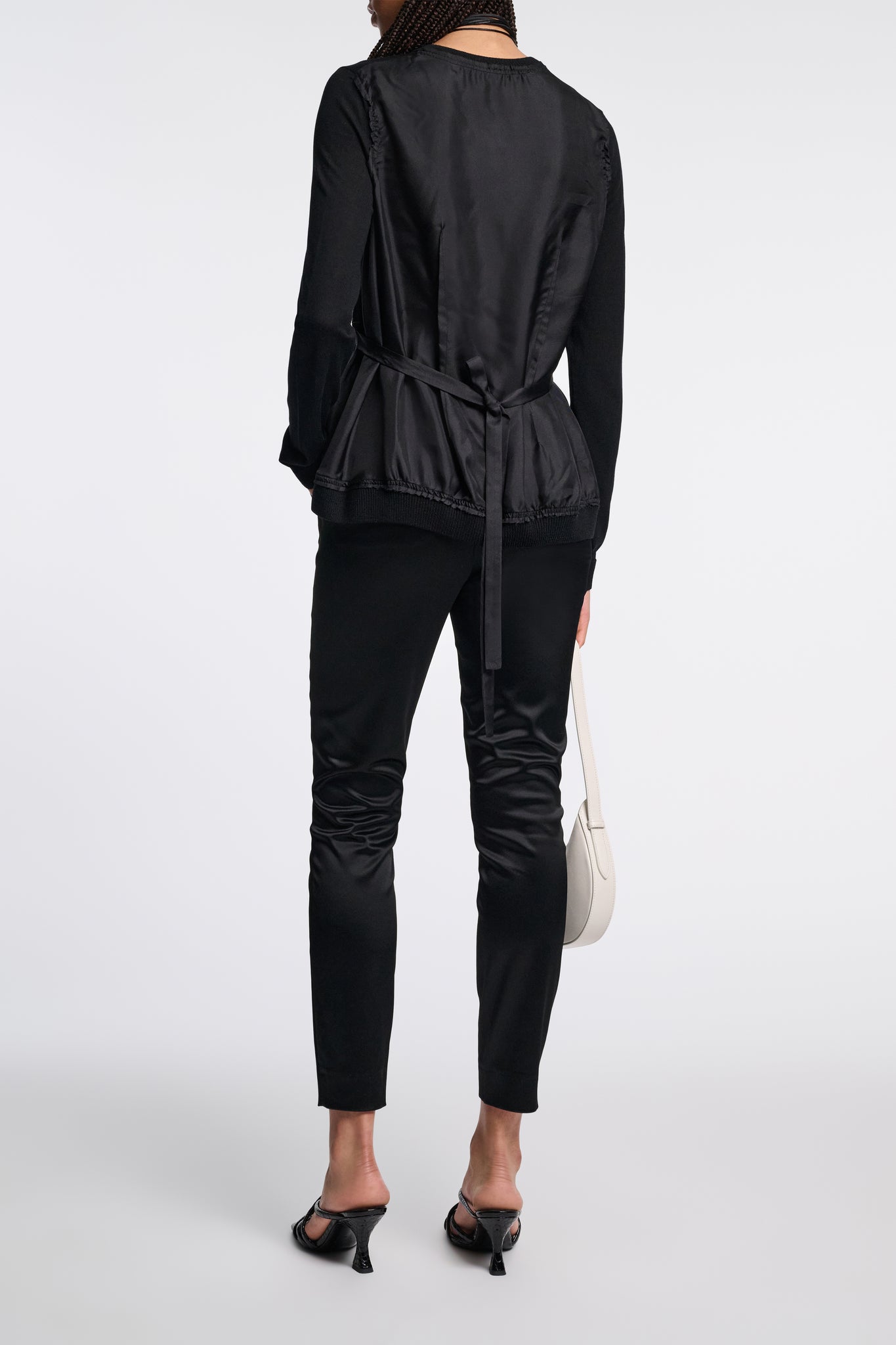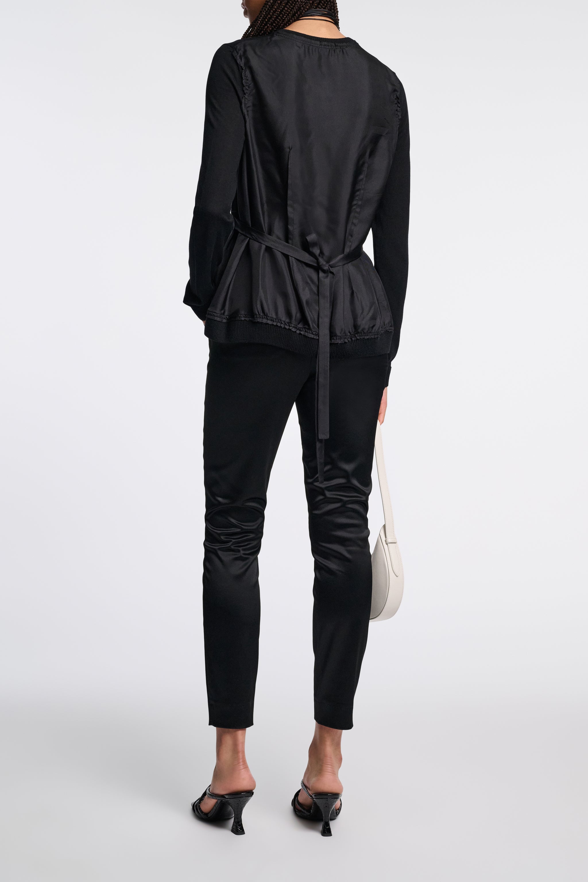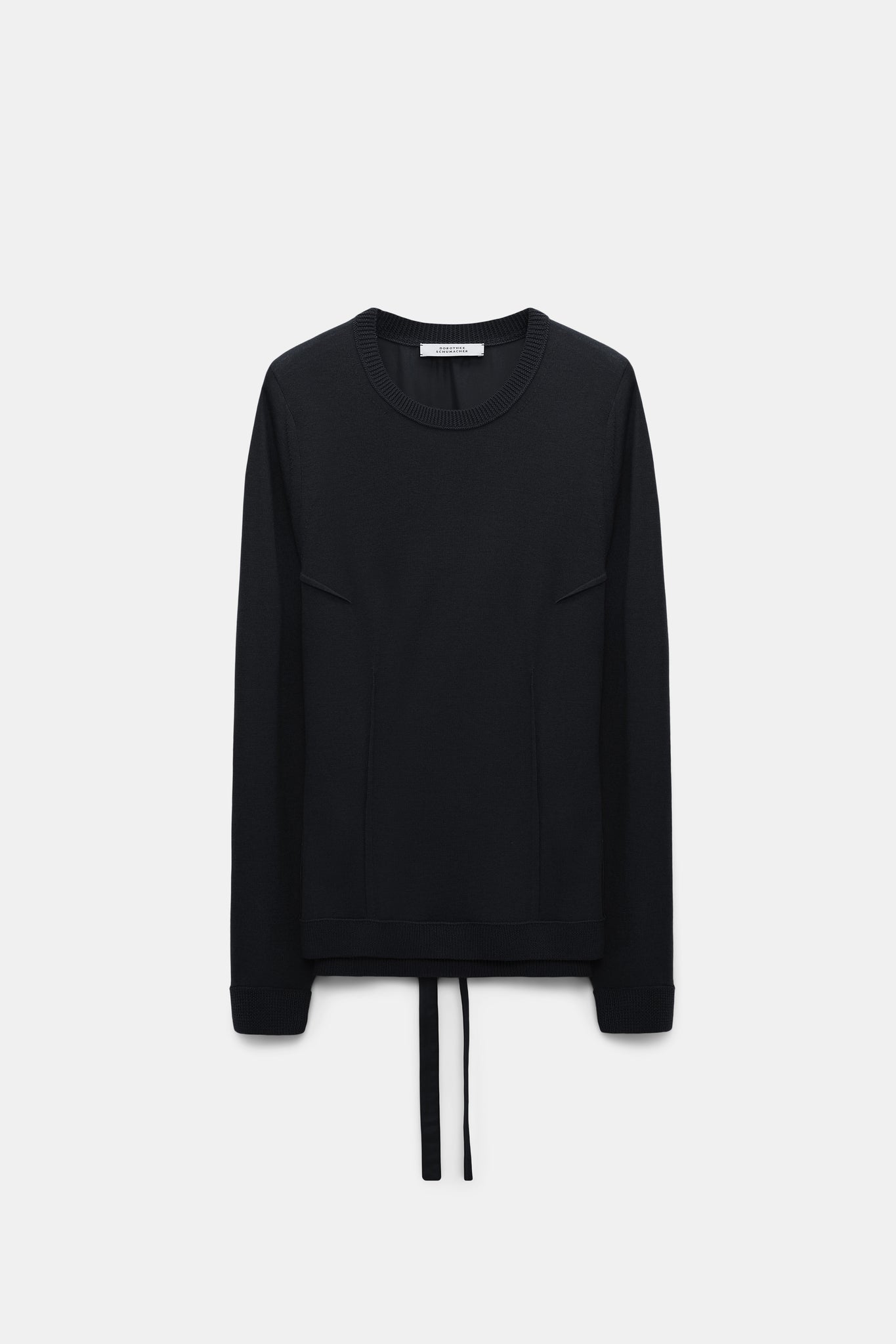Der Rundhalspullover ist aus softem Merino gefertigt, der Rücken wird durch Patches aus Seidentwill ausgezeichnet. Seitliche Bänder und Abnäher-Details runden das Modell ab.