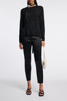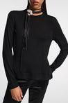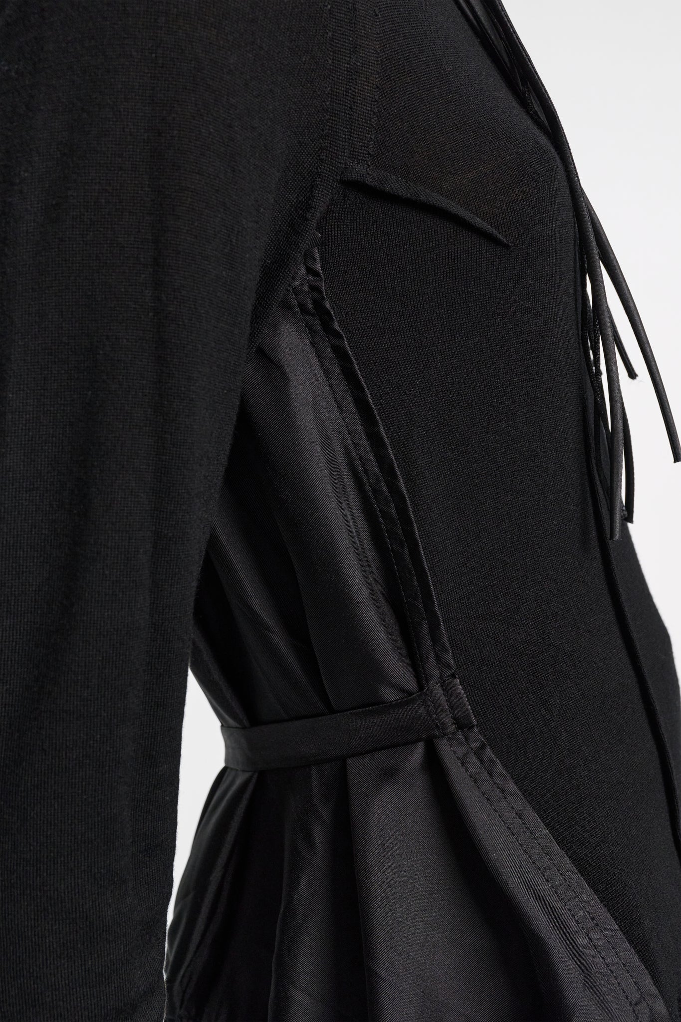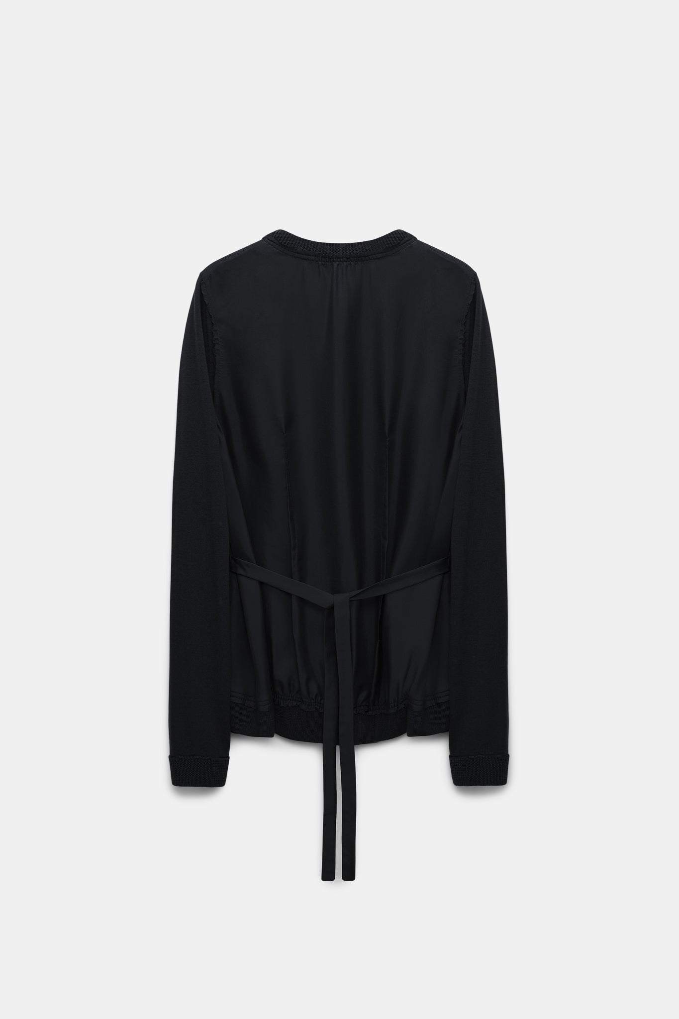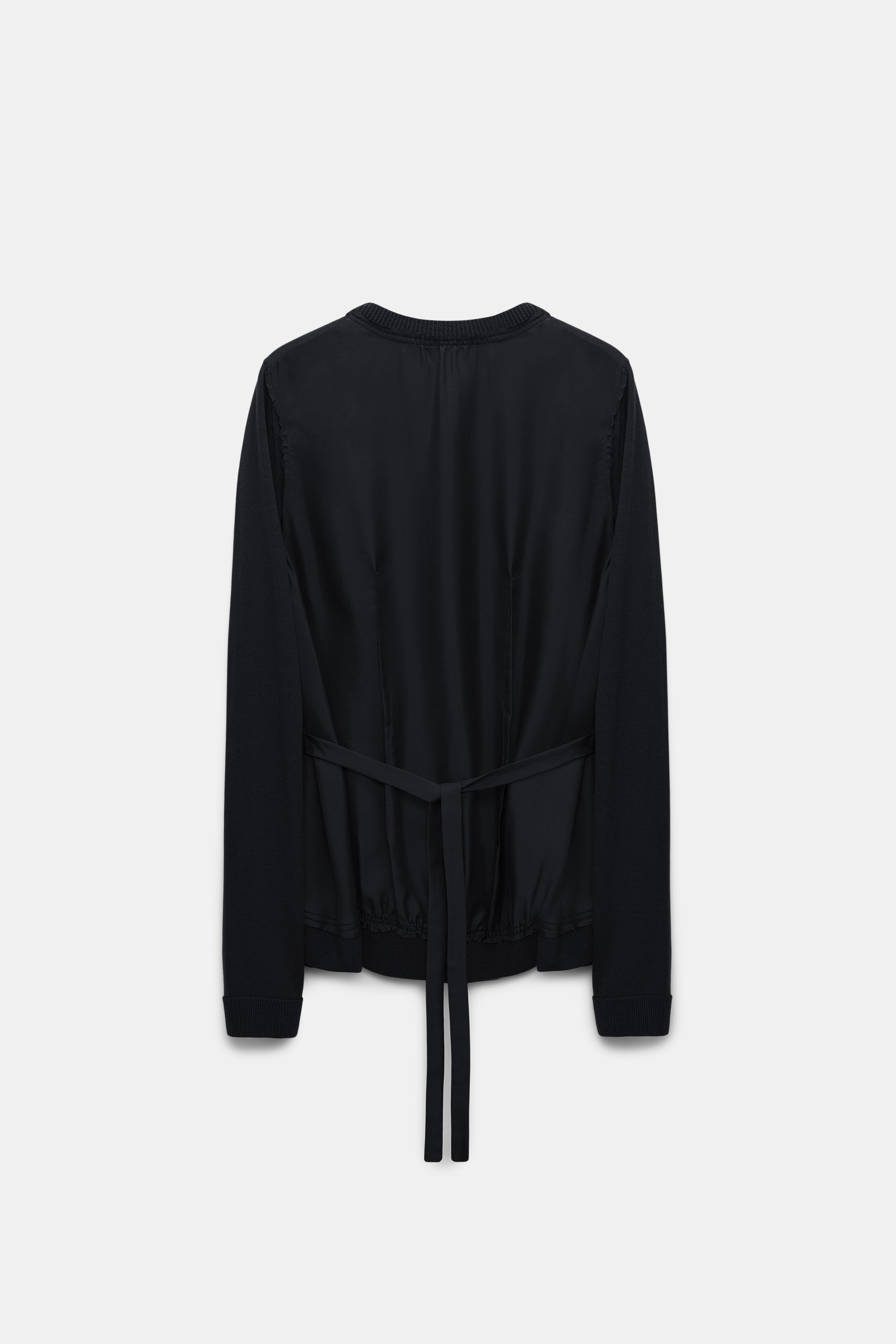 Der Rundhalspullover ist aus softem Merino gefertigt, der Rücken wird durch Patches aus Seidentwill ausgezeichnet. Seitliche Bänder und Abnäher-Details runden das Modell ab.