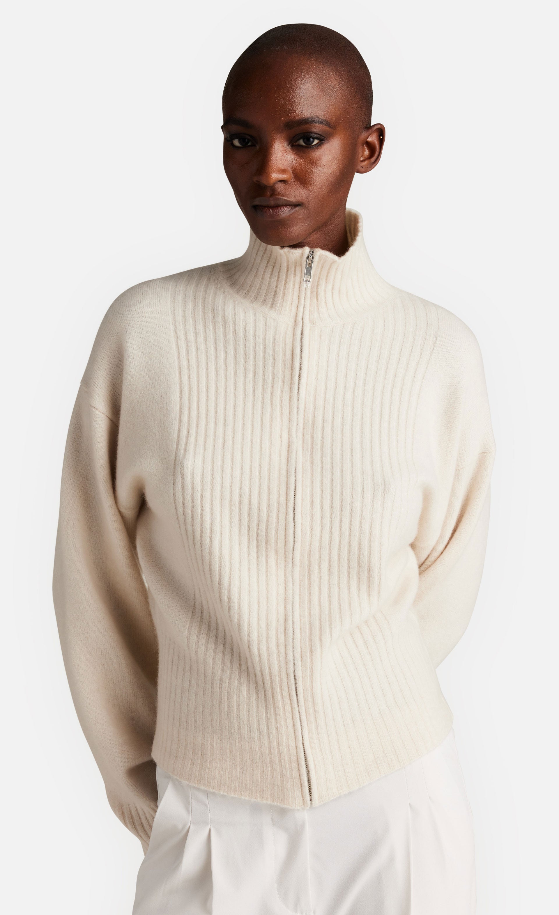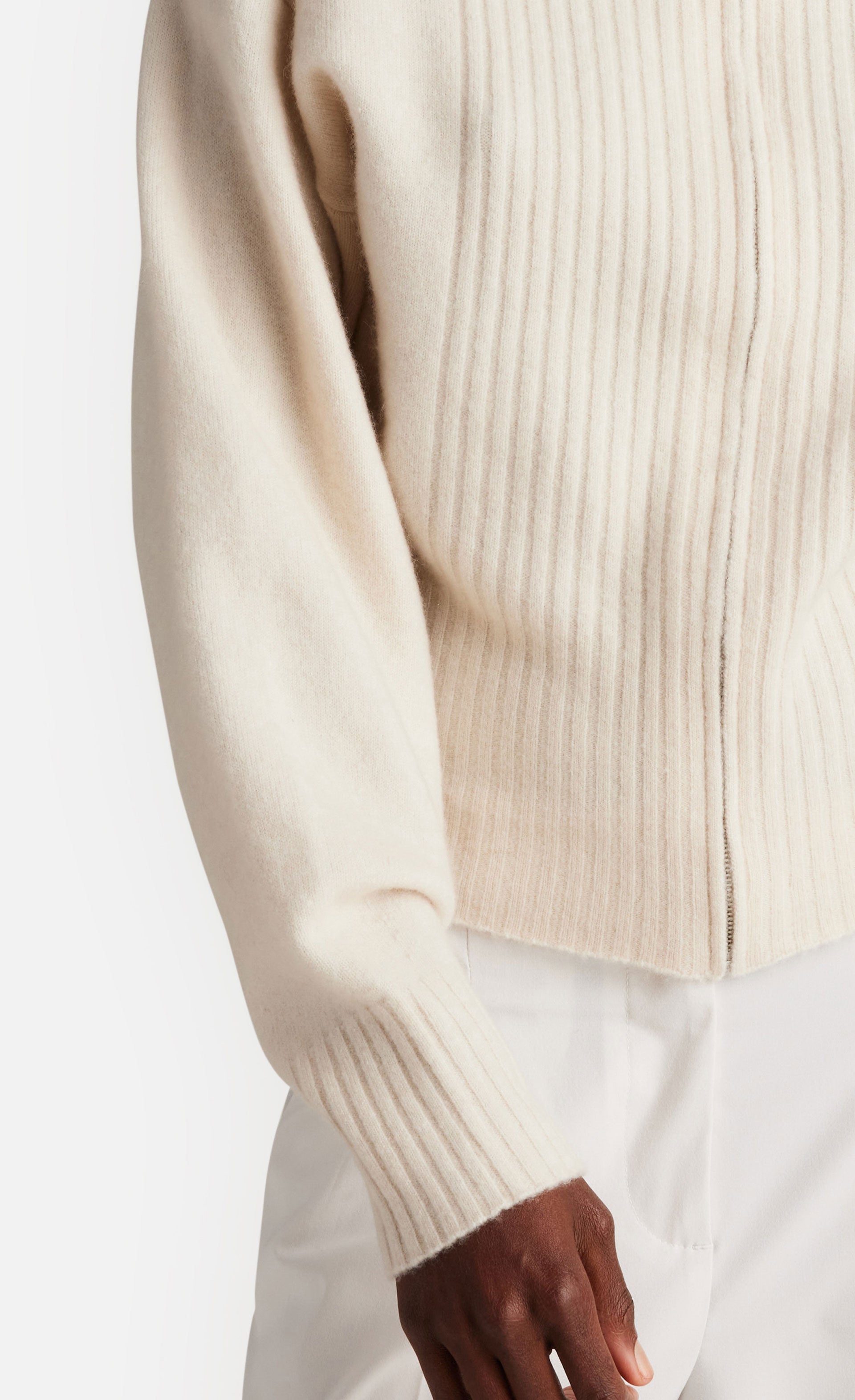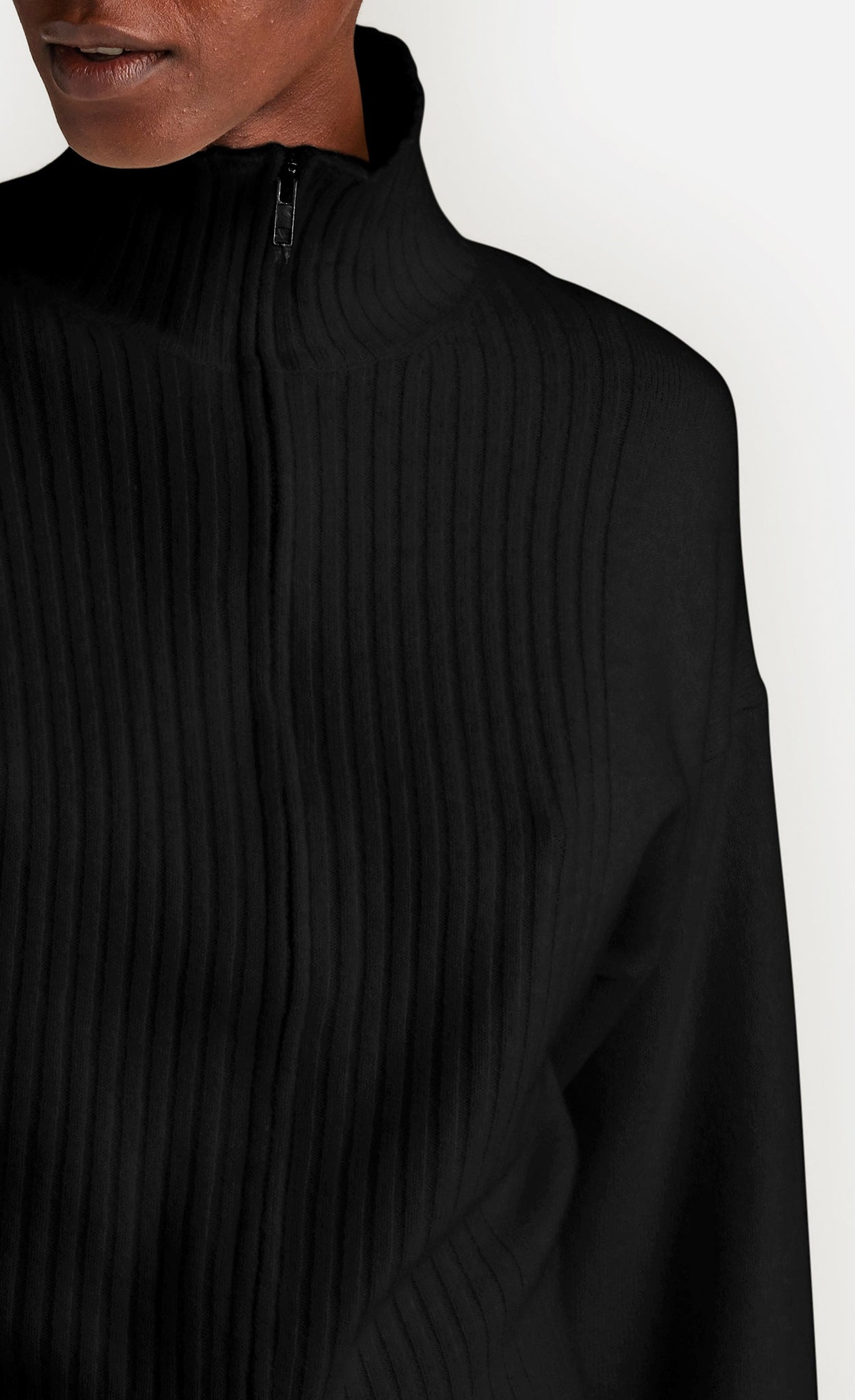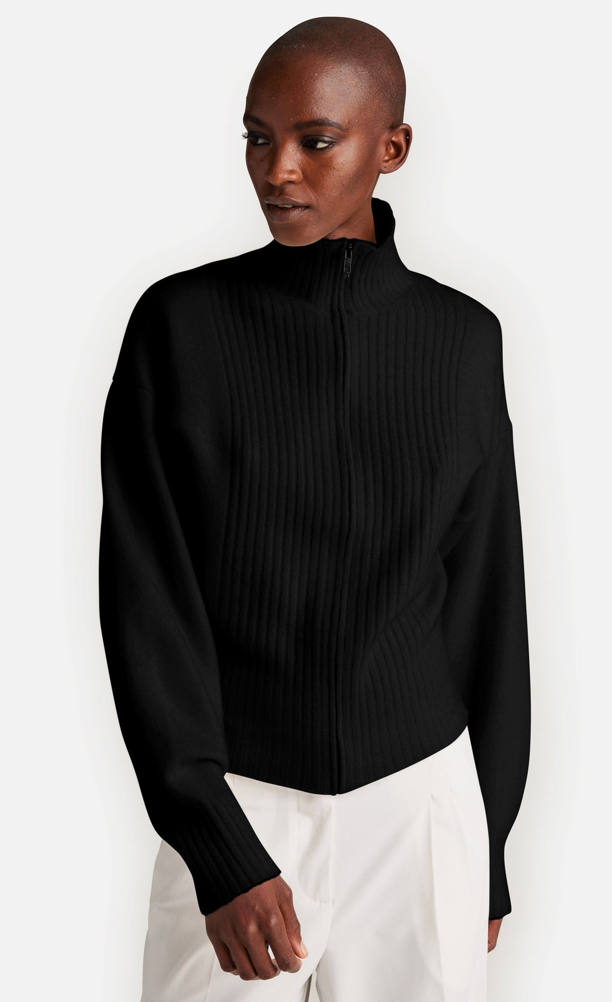 Dieser besondere Look wird durch die Verwendung eines Metallreißverschlusses und die platzierte Rippstricktechnik unterstrichen.