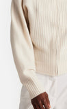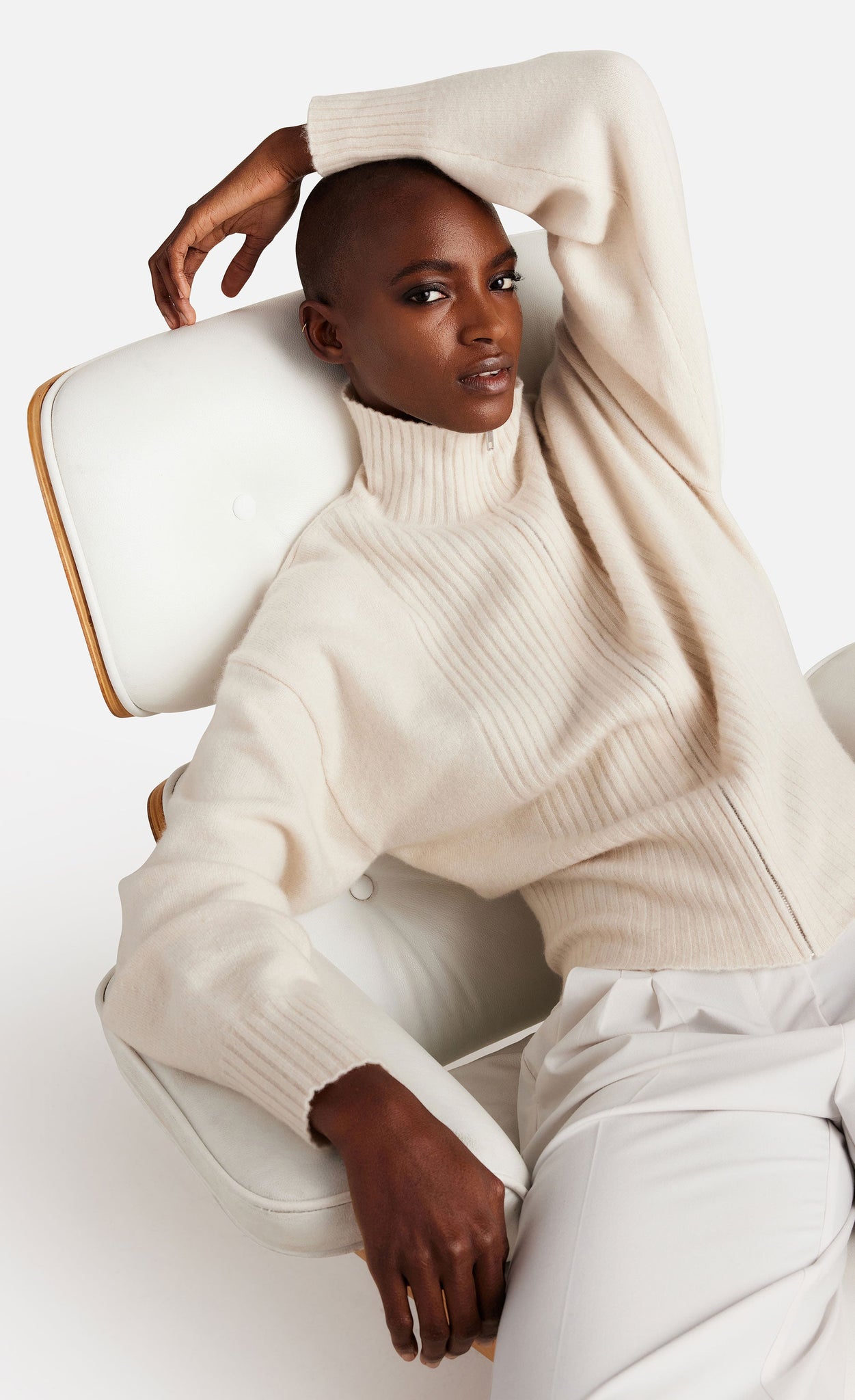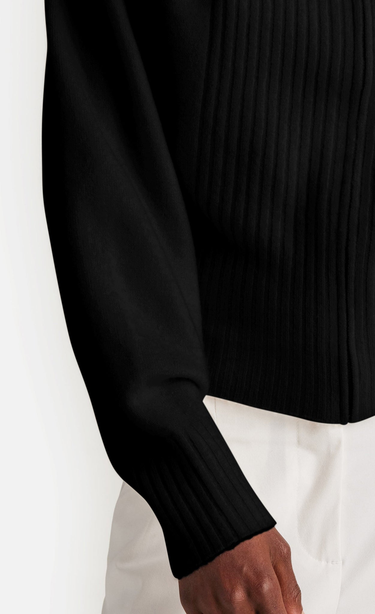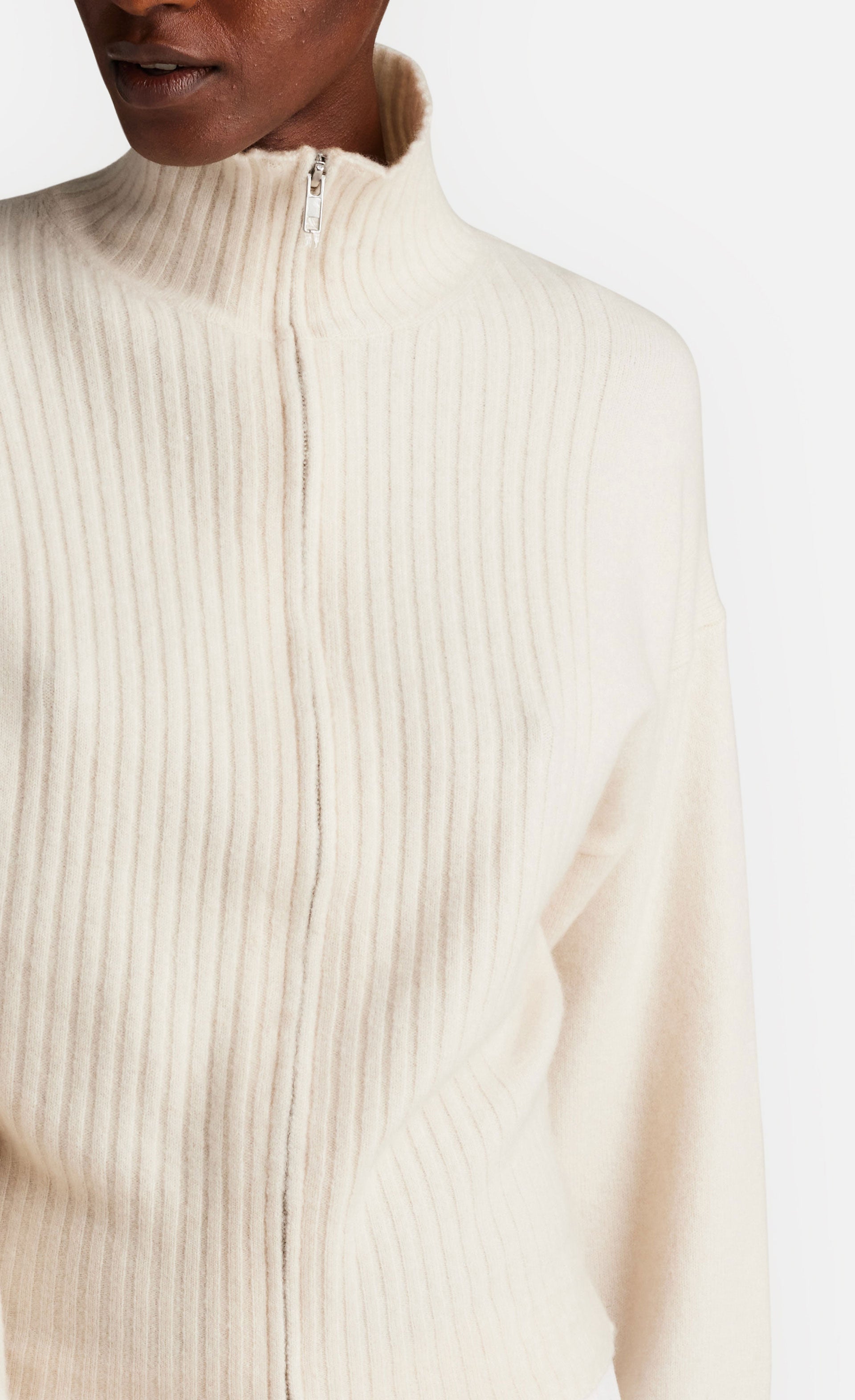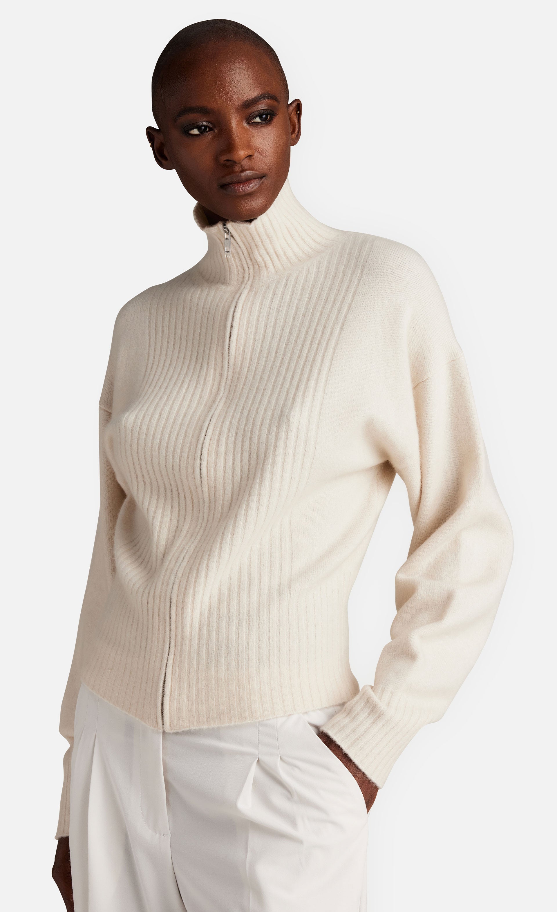 Dieser besondere Look wird durch die Verwendung eines Metallreißverschlusses und die platzierte Rippstricktechnik unterstrichen.