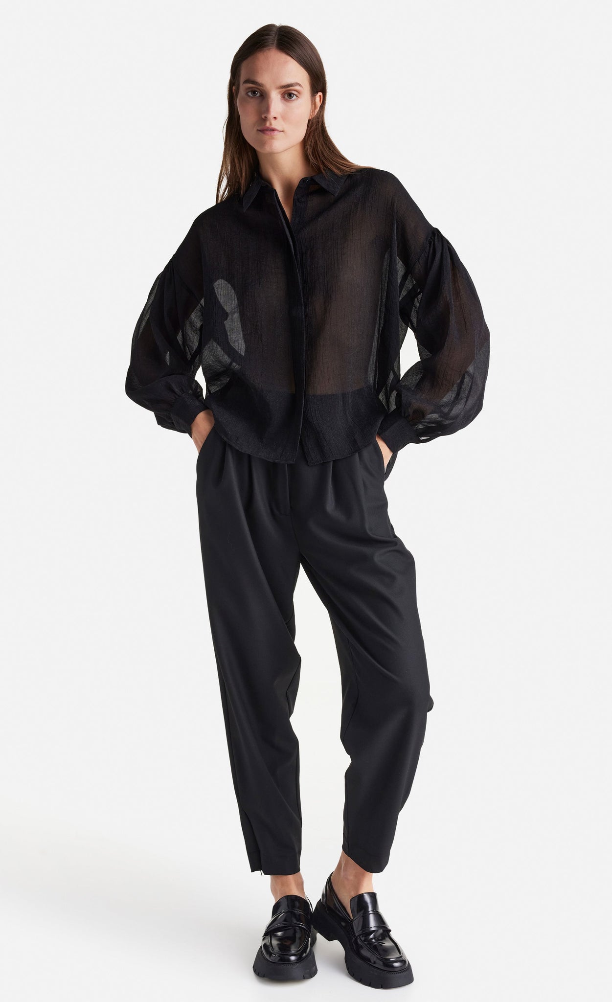 Die Hose mit oben voluminösem und unten schmal zulaufendem Bein hat einen voll konfektionierten Bund mit doppelter Bundfalte und einer Bügelfalte. Die Saumweite kann durch einen schmalen Reißverschluss verändert werden.