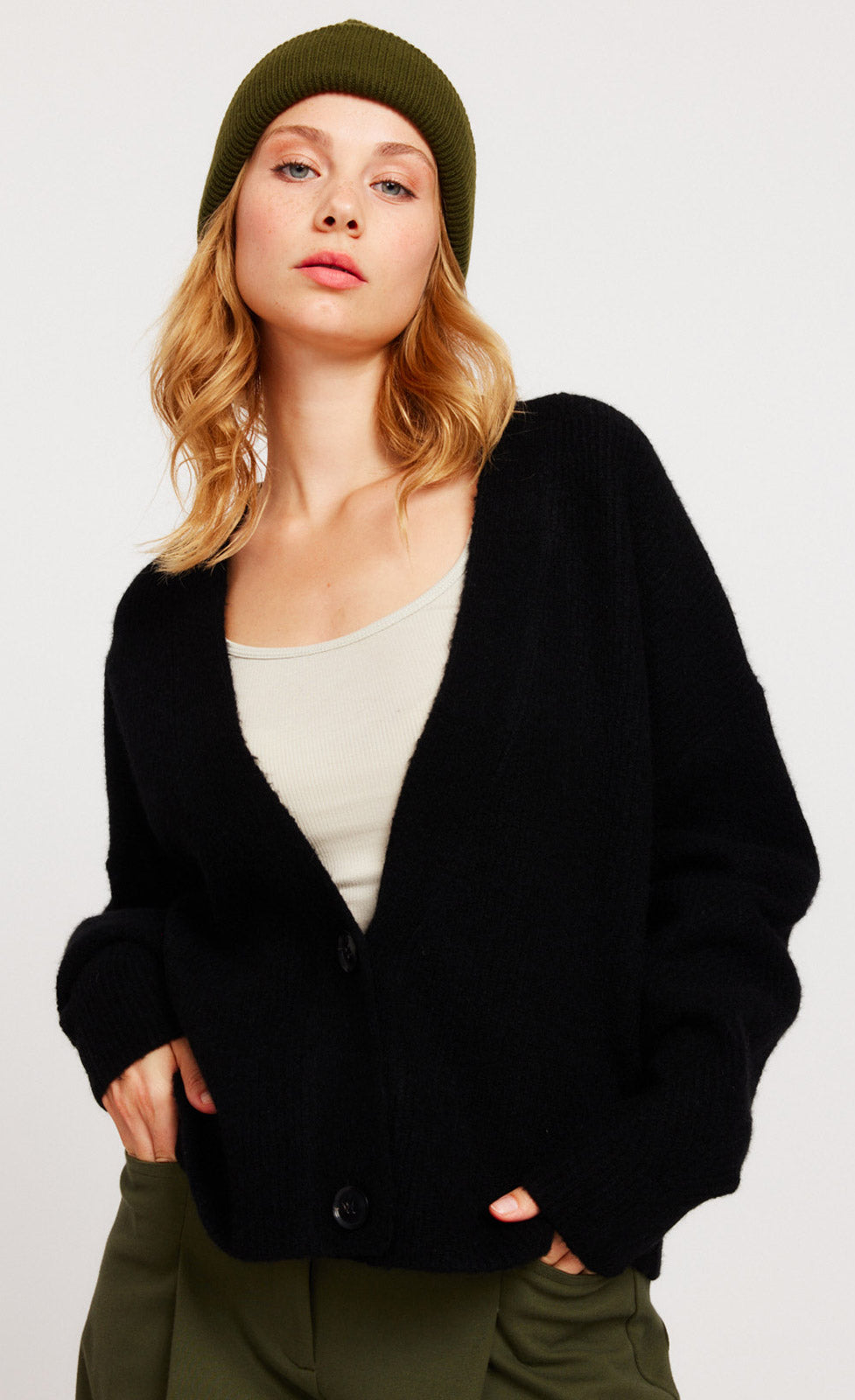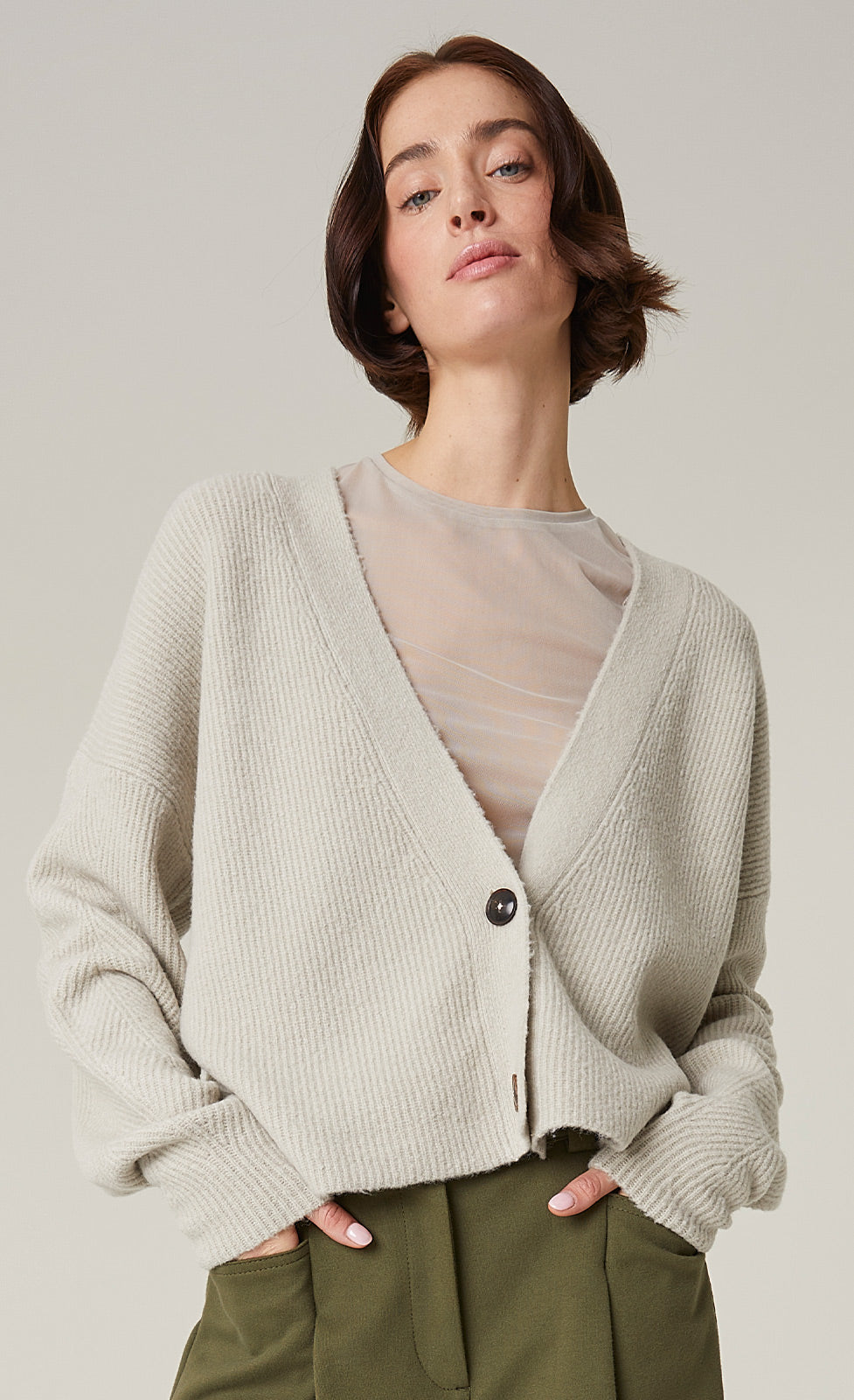 Diese von der Menswear inspirierte Strickjacke hat einen lockeren, kastenförmigen Schnitt, überschnittene Schulternähte und ist in feiner Rippe abgestrickt.