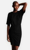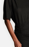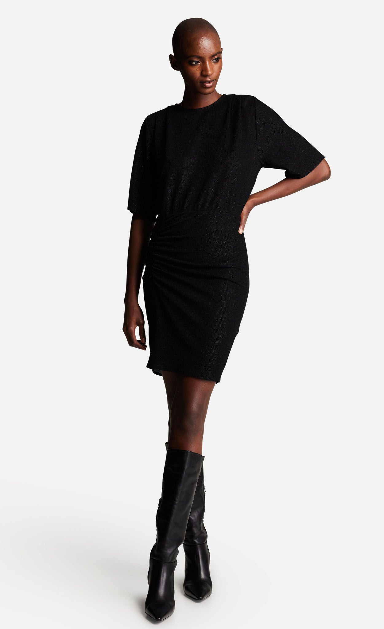 Das glitzernde Kleid besitzt weite T-Shirtärmel und eine Taillierung. Es ist unterhalb der Taille eng geschnitten und hat im Rockteil eine Raffung, die ihm einen verspielten Look verleiht.