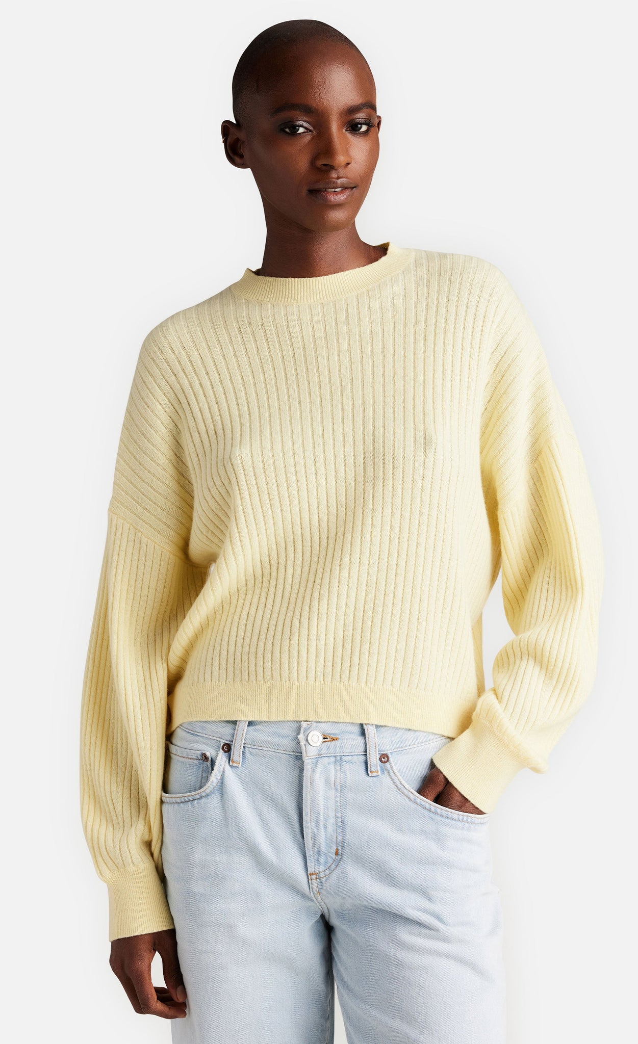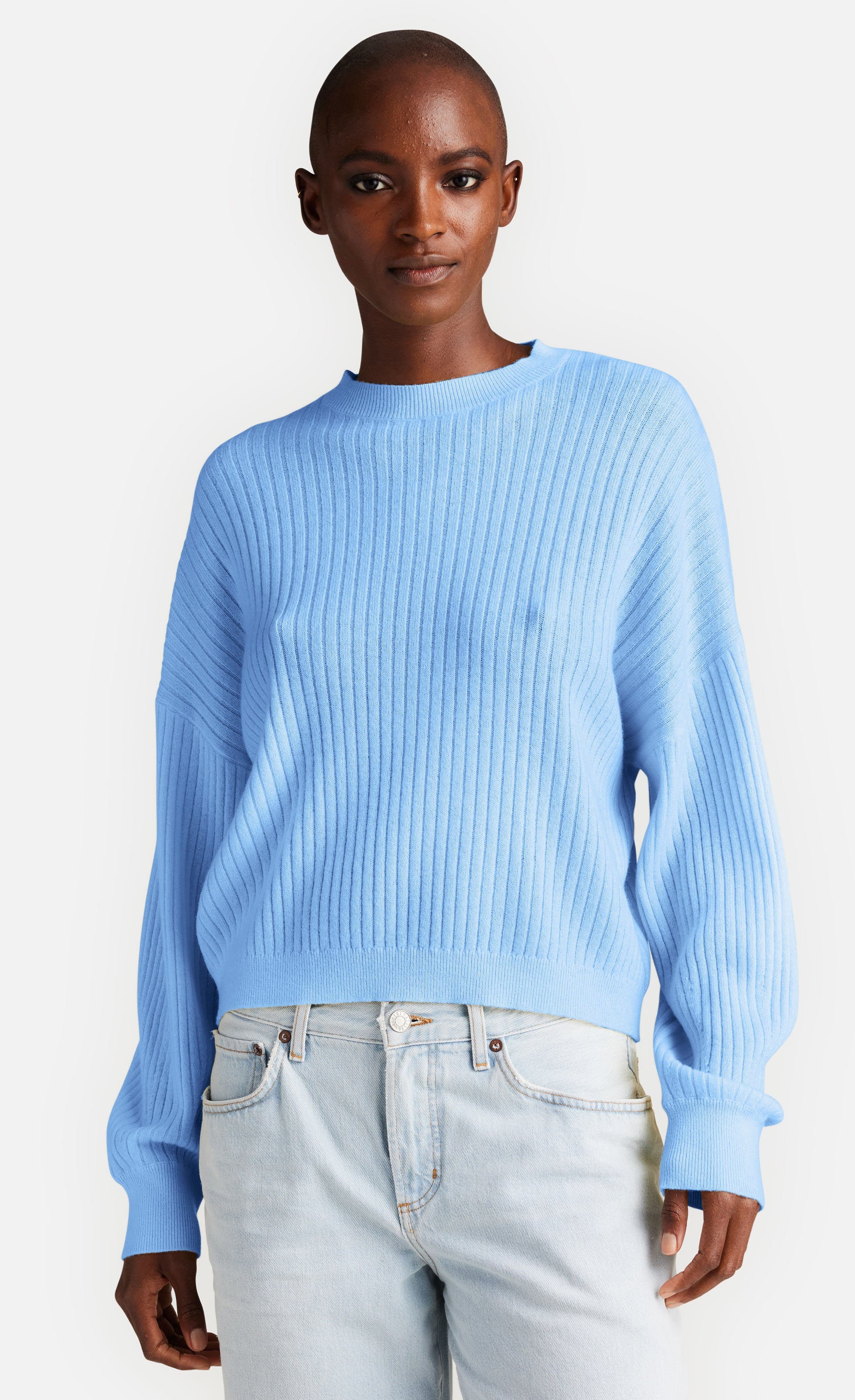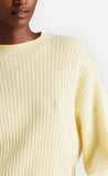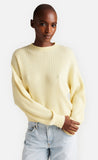 Der Pullover ist in einer breiteren Rippe abgestrickt und hat einen Rundhalsausschnitt. Als überraschendes Element sind die Ärmel des Pullovers voluminös und mit Minderungen an der Manschette gearbeitet, was ihn zeitlos und dennoch besonders machen.