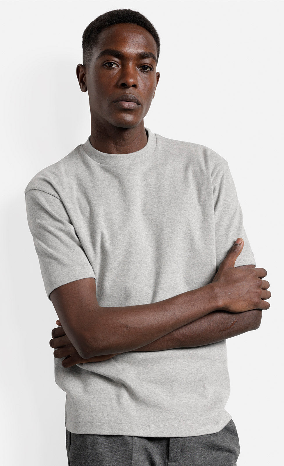 Dieses T-Shirt aus fester Jerseyware wurde mit einem Carbonic-Finish versehen, das der Oberfläche einen weichen Griff mit feinem Peach-Effekt verleiht. Der perfekte Jersey für den Winter. Wir kombinieren dieses T-Shirt gerne unsere legeren Jacken.