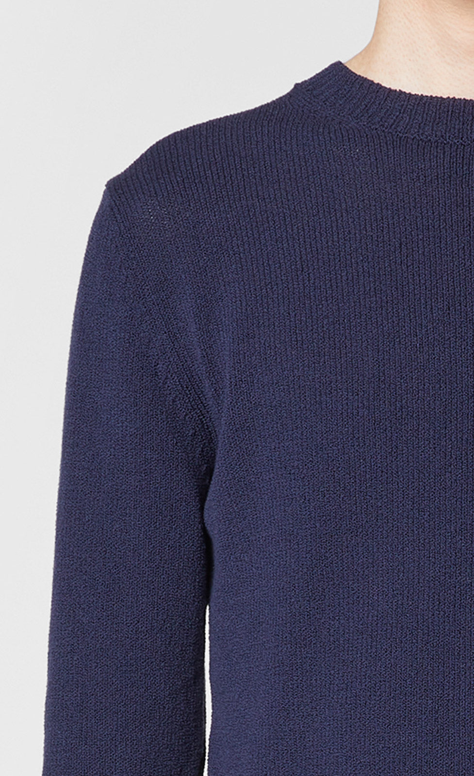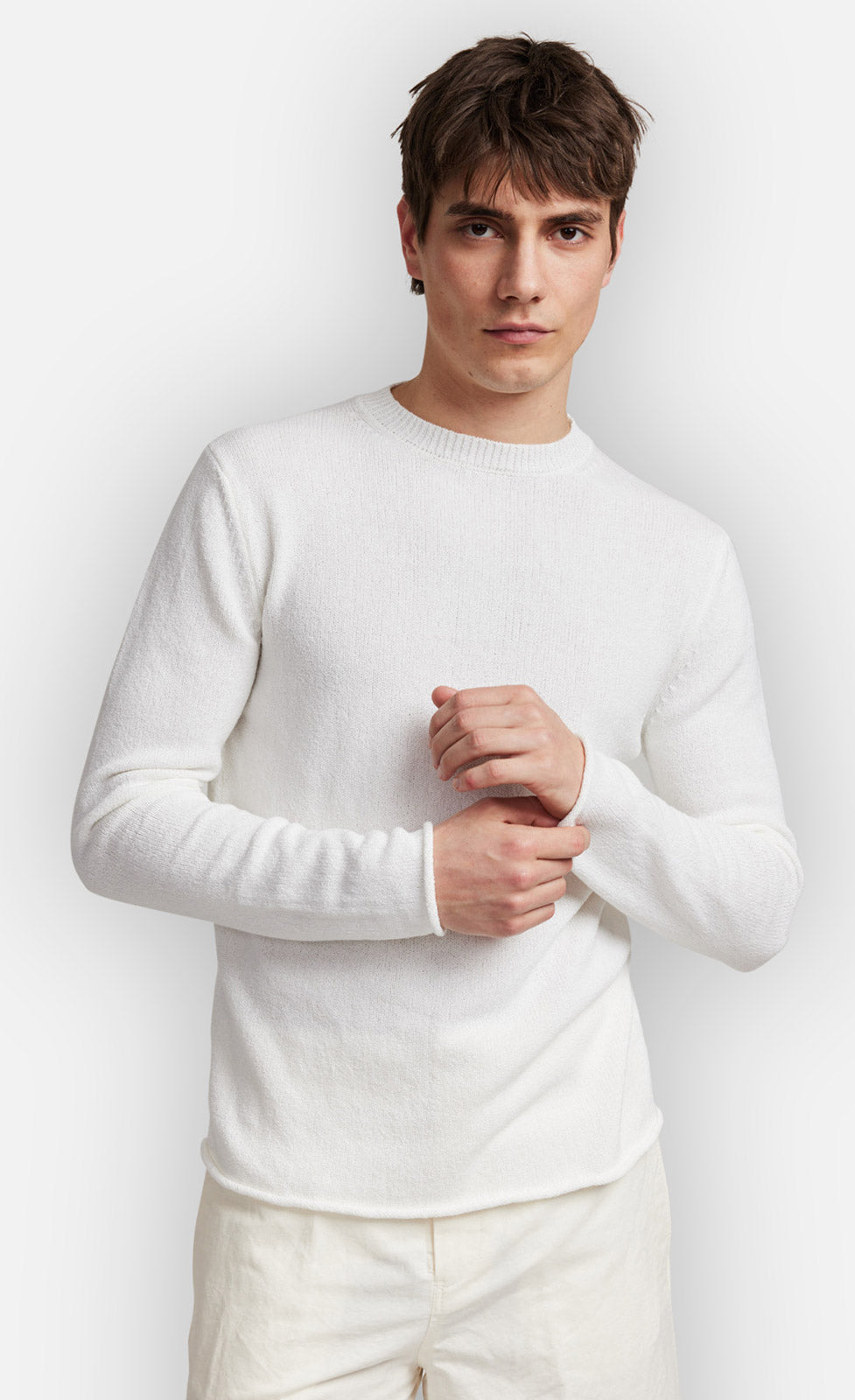 Dieser Pullover aus Baumwolle besticht durch sein Garn in feiner Kreppoptik und das reduzierte Design mit Rollkanten an Saum und Ärmelende.
