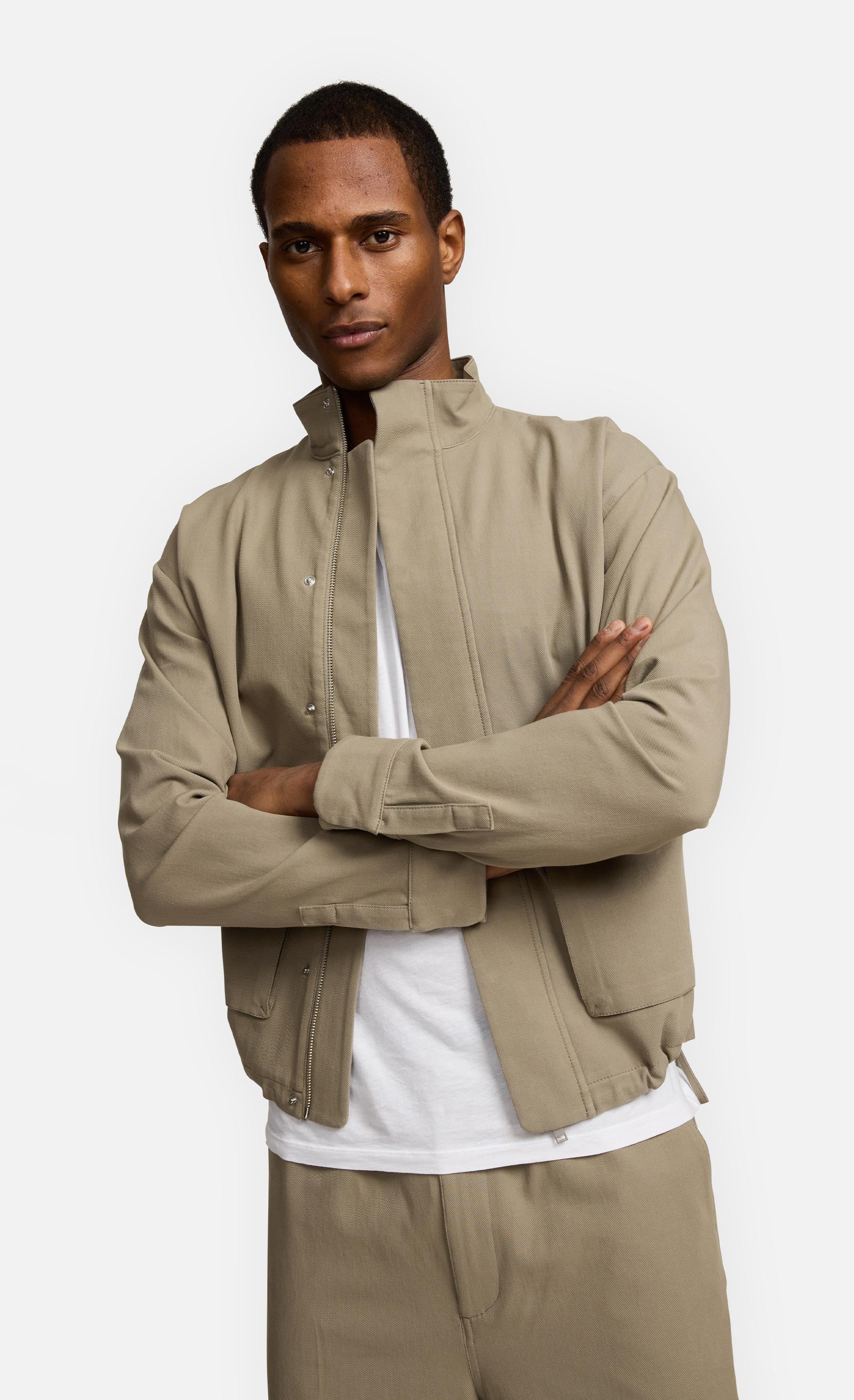 Der schwere, elastische Baumwollstoff mit feiner Twill-Optik unterstreicht den dezent sportlichen Look dieser Jacke.