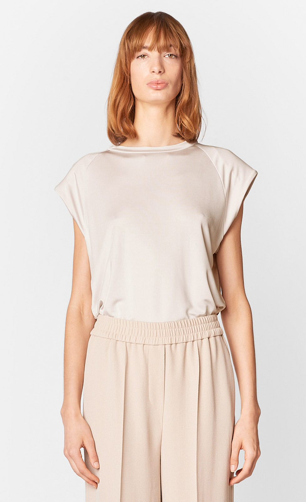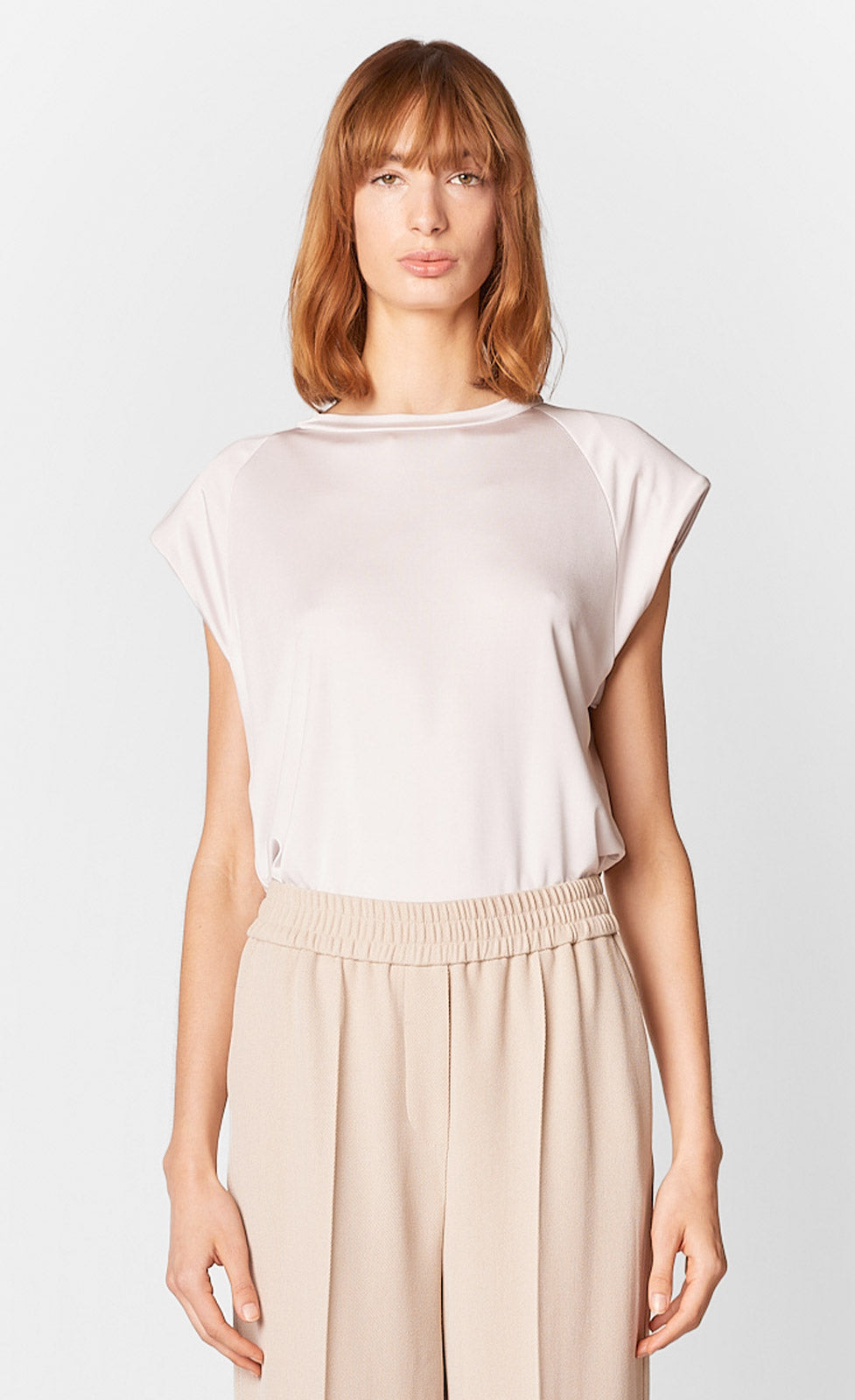 Durch den fließenden, leicht glänzenden Jersey und die dünn gepolsterten Schultern erhält dieses T-Shirt ein modernes Update und ist vielseitig - auch zu besonderen Anlässen - tragbar.