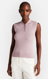 Dieser Style wurde aus kreppigem Viskosegarn in Rippe abgestrickt, hat eine schmale Passform und einen Polokragen mit Knopfleiste.