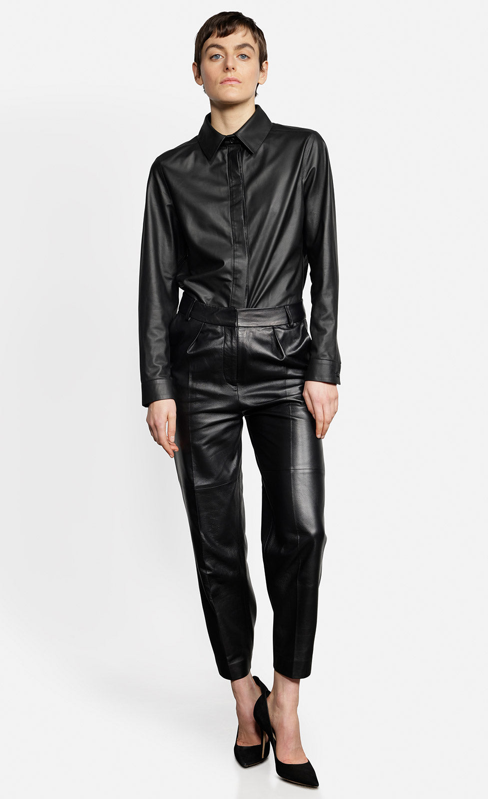 Die Investition in eine Lederhose aus hochwertigem Lammnappa lohnt sich immer, denn sie wertet jedes Outfit auf und lässt sich sowohl lässig als auch schick kombinieren. Unser Modell wurde mit Karotteschnitt, verkürzter Länge und einfacher Bundfalte designt und kann mit der dazu passenden Bluse auch als Komplettlook getragen werden.
